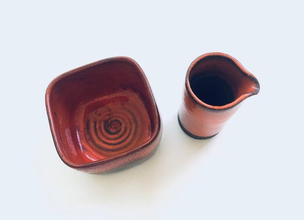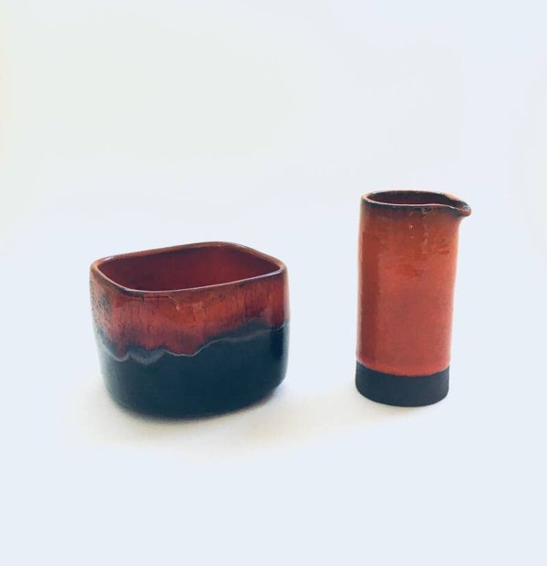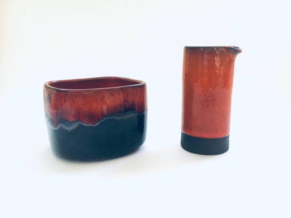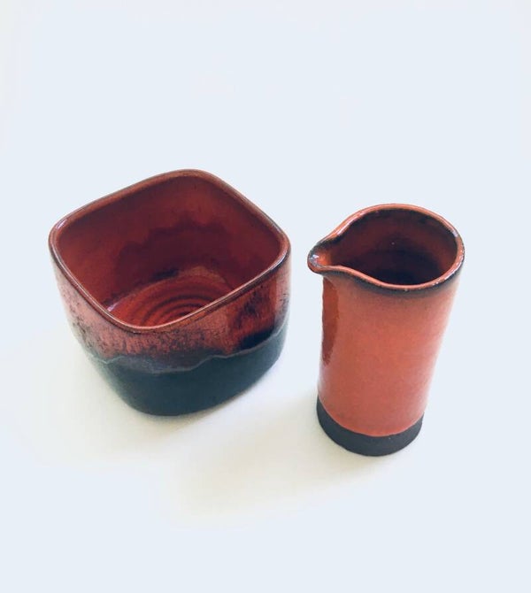 Vintage Midcentury Studio Art Pottery Ceramic Milk and Sugar set. Made in Belgium, 1960's. Orange fat glazed on dark clay milk jug. Dark brown and orange glazed on orange clay sugar bowl. Not a real set, but they fit very well together. Both are in very good condition. Milk jug measures 9cm x 5cm x 4cm. Sugar bowl measures 6cm x 8,5cm x 8,5cm. Sold as a set.