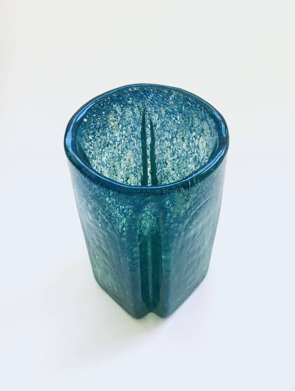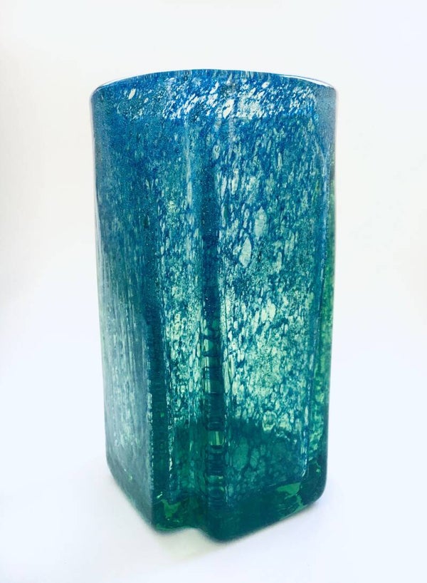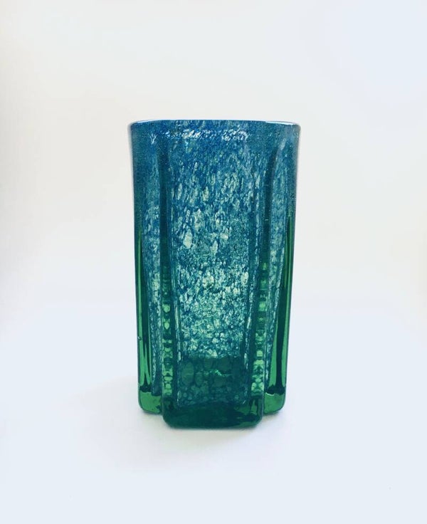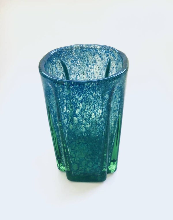 Art Deco Art Glass Square modernist vase, made in Czechoslovakia 1930's. Handblown glass in green with blue fragments. Comes in perfect condition. Measures 17,3cm x 9,5cm x 9,5cm.