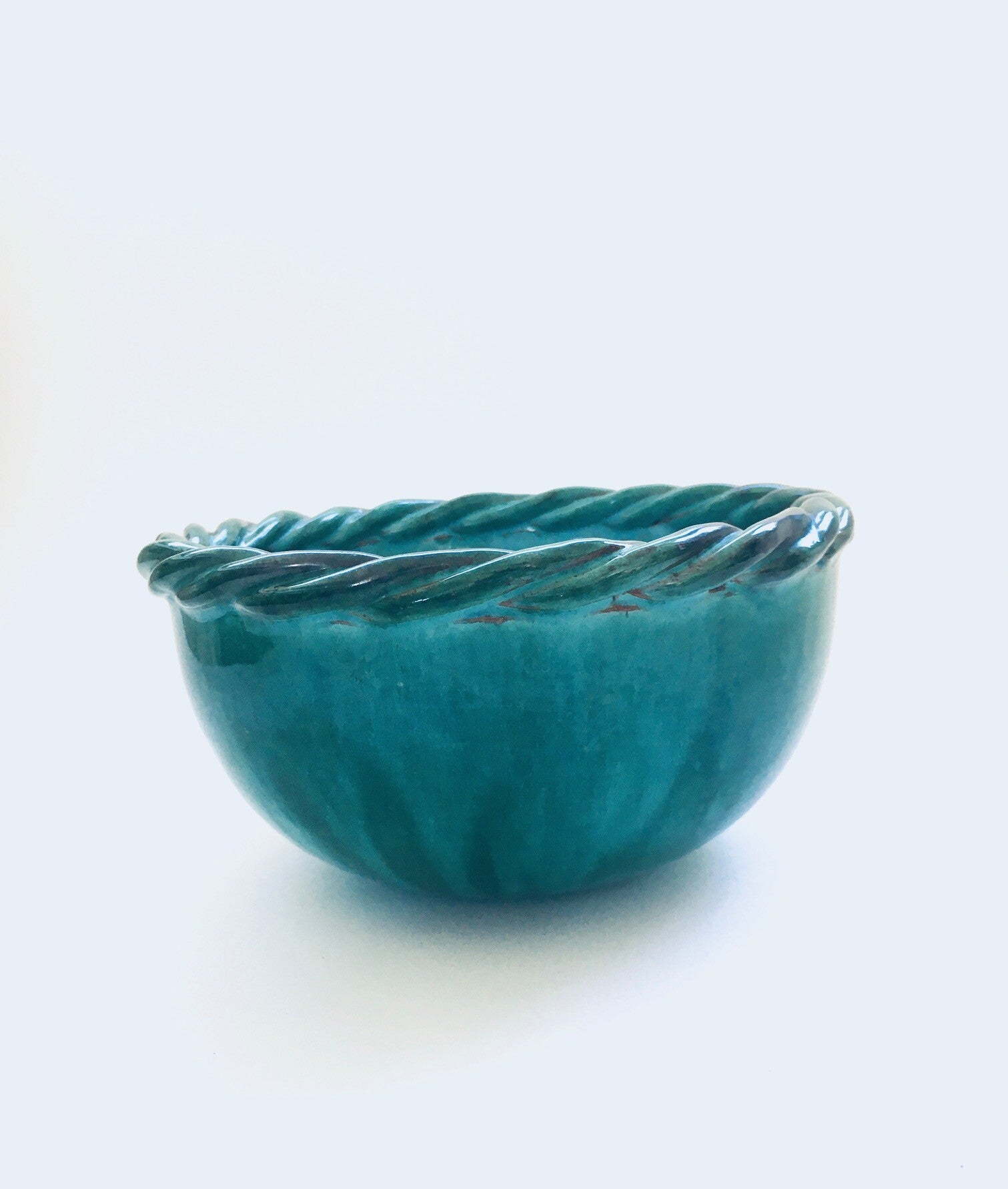 Vintage Art Studio Pottery Rope Bowl by Alexandre De Wemmel (1909 - 1964), Belgium 1950's. Signed and stamped on the bottom, Alexandre, Made in Belgium, Model 703. Turquoise green flamed glazed bowl in very good condition. Measures 10cm x 19,5cm x 19,5cm.
