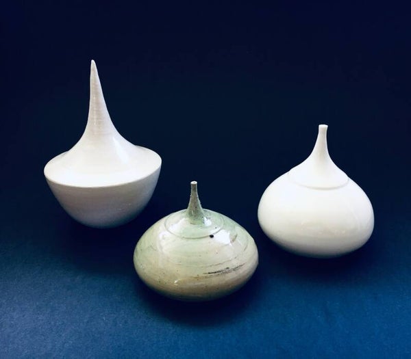 Handmade Belgian Design Studio Ceramics set of 3 fluited Art objects. One in gloss white glaze, one in a pale green glaze and one in a light grey white glaze. Beautifully made, one is signed at the bottom. Unknow artist. Very good condition. Tallest one measures 19cm x 14cm x 14cm.