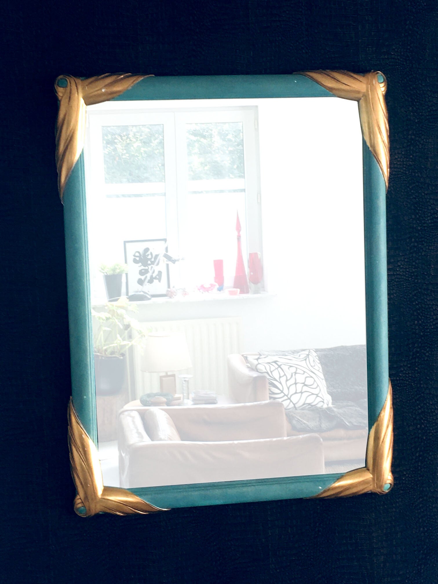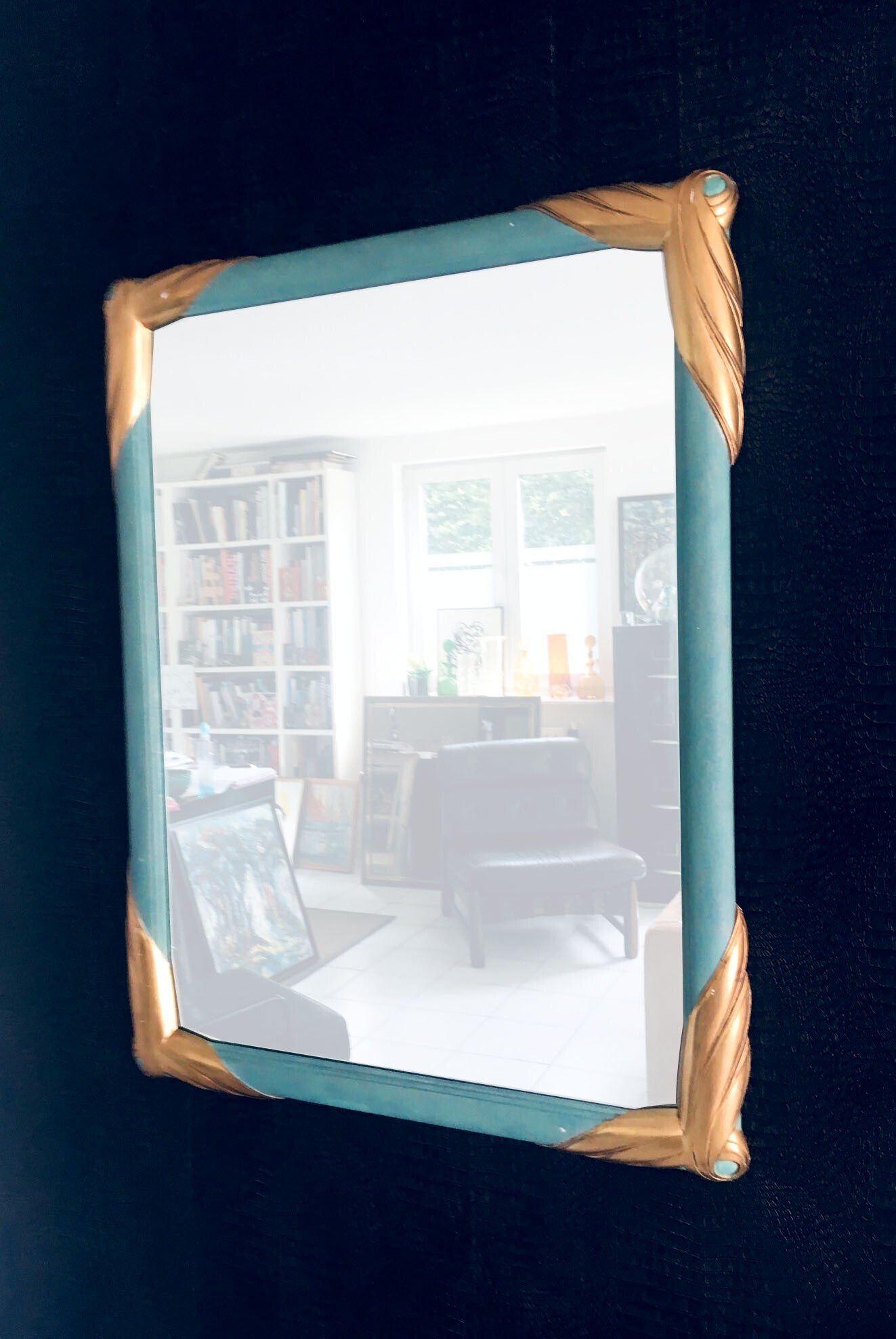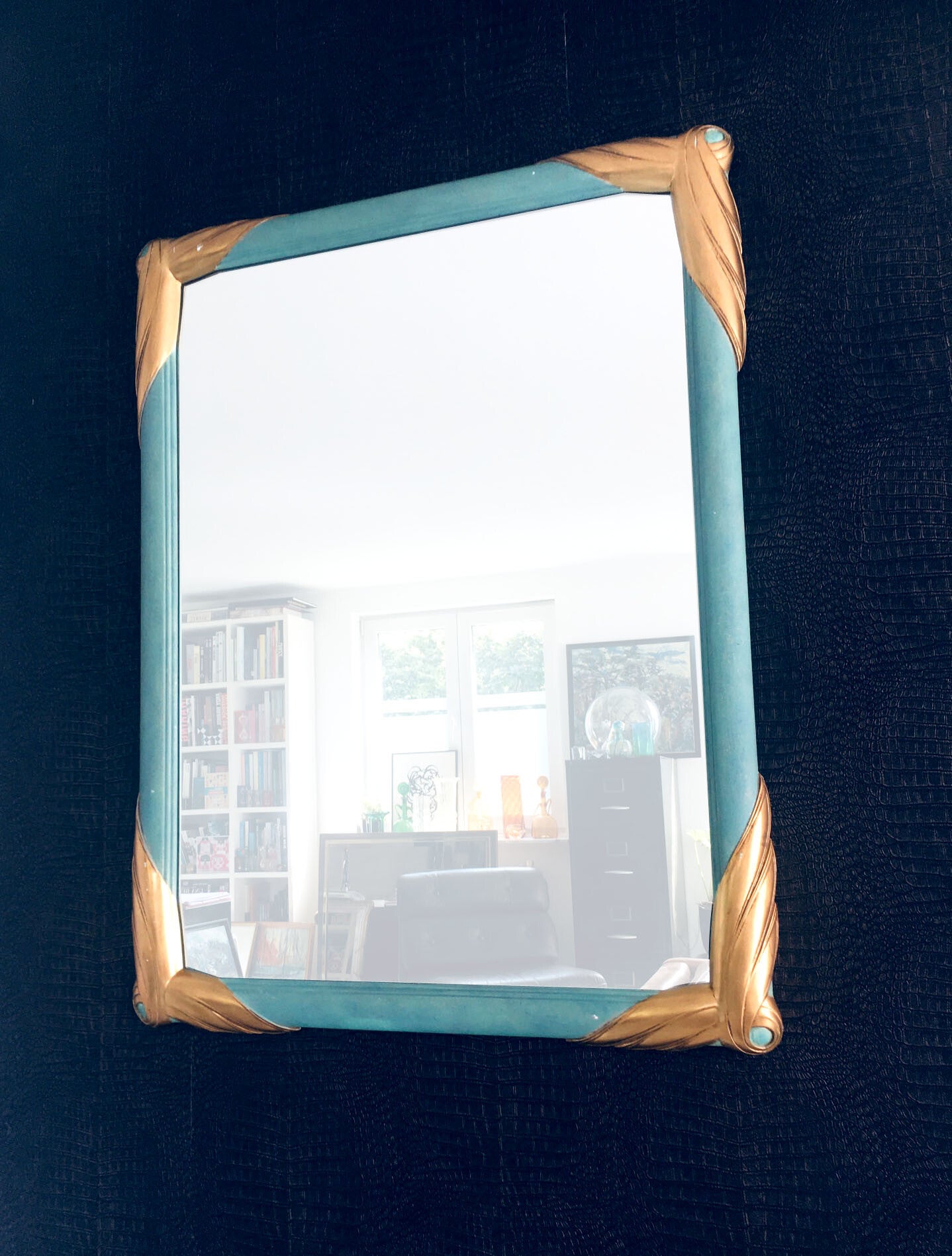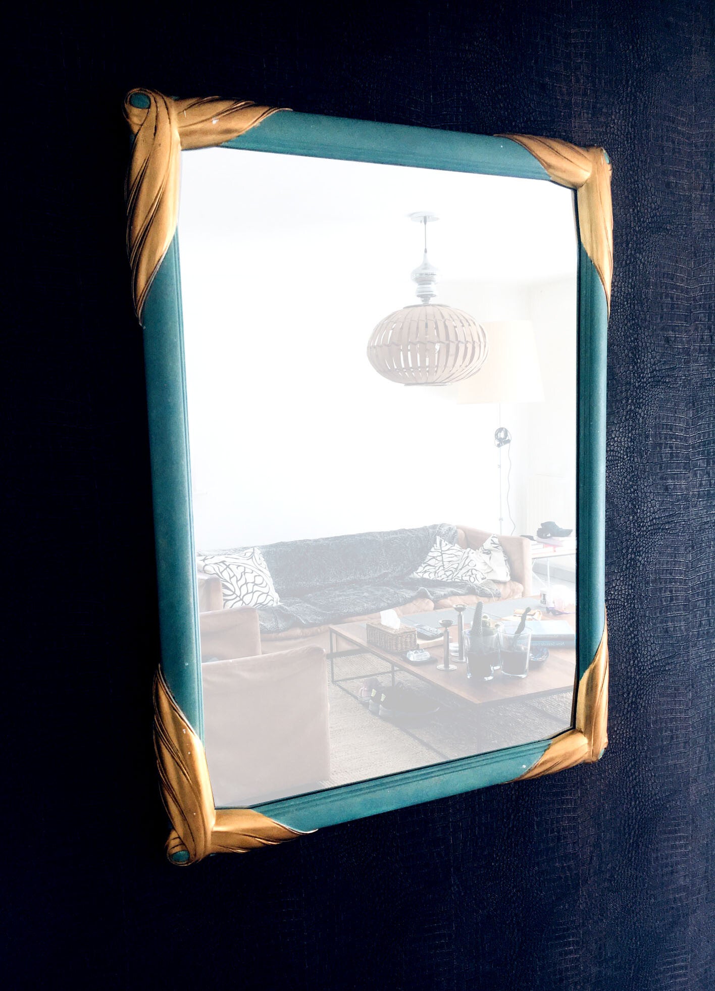 Vintage XL Hollywood Regency Style Design Framed Mirror by Deknudt Mirrors, Belgium 1970's. Flat framed mirror with one piece cut wooden border in turqoise and gold foldover leaf corners. Mirror in very good condition, border has some minor chipping and scuffs in green and gold. You can use this horizontal and vertical. In overal good condition. Measures 105cm x 80cm x 5cm.