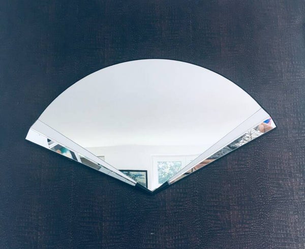 Vintage Postmodern Belgian Design FAN Shape Mirror by Deknudt Mirrors, Belgium 1970's. Black stained wooden frame with facet placed mirror pieces and flat mirror middle part comes in overal good condition. With original label. Mirror has some minor blemishes on mirror and border. Measures 110cm x 61,5cm x 4cm.