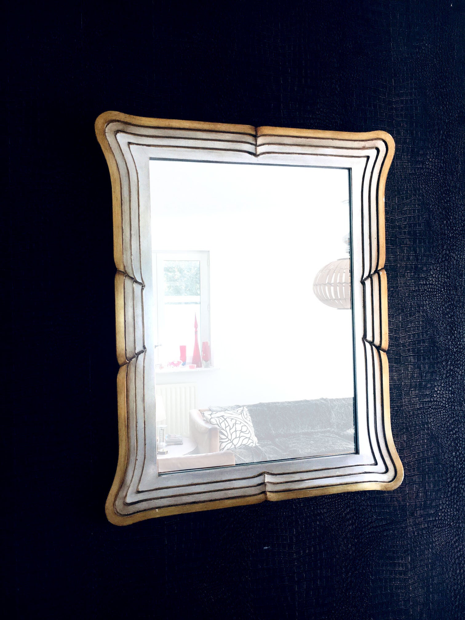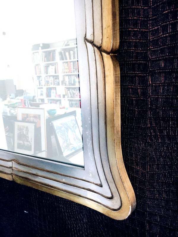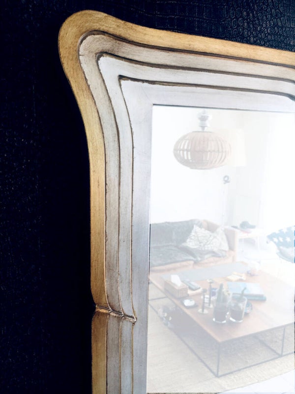Vintage Hollywood Regency Style Belgian Design FOLDOUT Mirror by Deknudt Mirrors, Belgium 1970's. Plastic formed border in silver and gold tones with flat mirror. Original label attached on back. Can be used horizontal and vertical. In overal good condition, some minor blemishes on border. Measures 63cm x 77cm x 2,5cm.