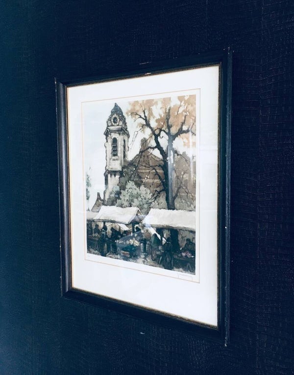 "Early morning market" Original Art Lithograph Etching Print by Roger Hebbelinck (1912 - 1987) Brussels, Belgium. Signed and numberd by the artist. 120/350. Belgian artist, worked and lived in Belgium, who mainly made etchings with city and country scenes. Well framed under glass. Wooden frame has some scrapings at borders. Print measures 38cm x 47cm - frame measures 56cm x 70cm x 3,5cm.