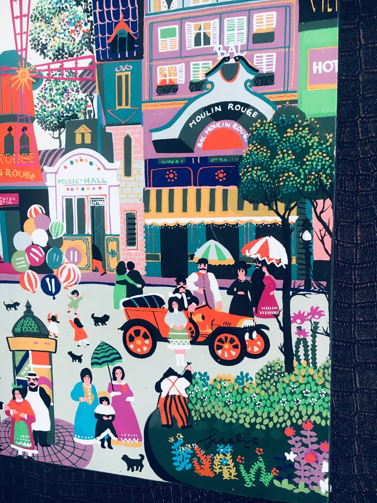 Original Art Painting on Canvas "Paris - Montmartre", signed by Artist, 1975 France. Unknown artist. Acryl paint on canvas. Colorful historic comical street scene with lot's of figures and nice details, like the ladder to the moon, just above the Theatre Moulin Rouge. Comes in very good original condition. Measures 61cm x 50cm.