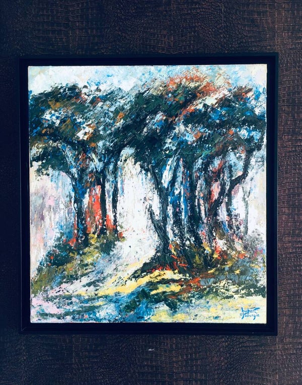 Original Art Painting "Light in the dark" Oil on Canvas by Hubert P.M. Estourgie (1924 - 1982), Nijmegen, Holland 1960's. Painter, drawings and glass artist, born, worked and lived in Nijmegen, the Netherlands. Signed by artist. Oil on canvas painting work with pallet knife in very good overal condition. Well framed in black floating border frame. Painting measures 60cm x 65cm - frame measures 66cm x 71cm x 3cm.