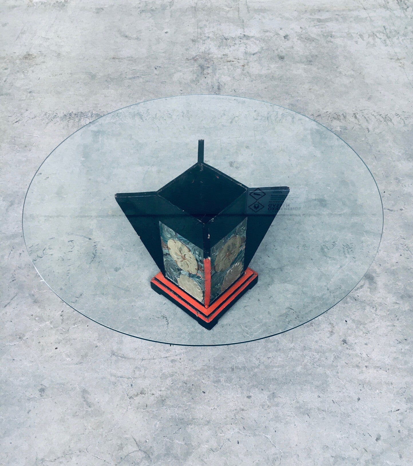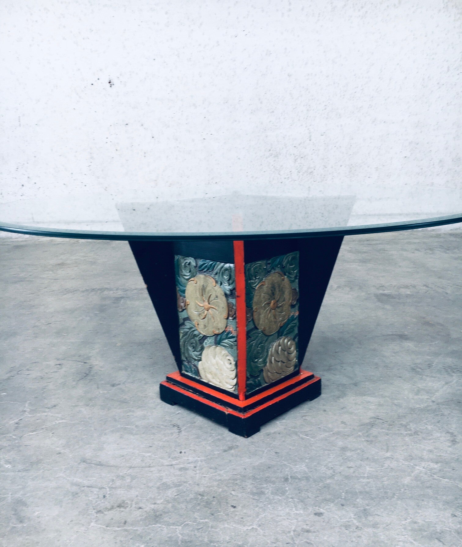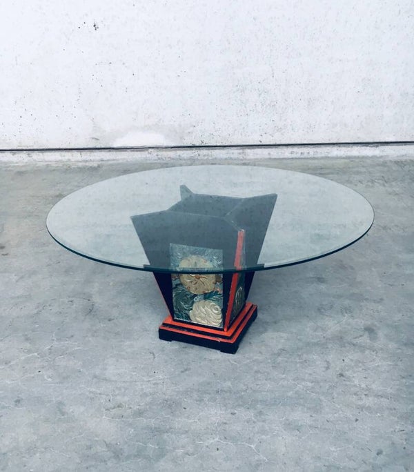 Vintage Art Deco Design Japonesque Style Coffee Table. Made in the 1920's. Black & Red Laquered wooden construction with flower illustrated carved side panels and glass round top. Base has some splitting in trap, constructional sturdy. In overal good condition for it's age. Measures 99cm x 45cm x 99cm.