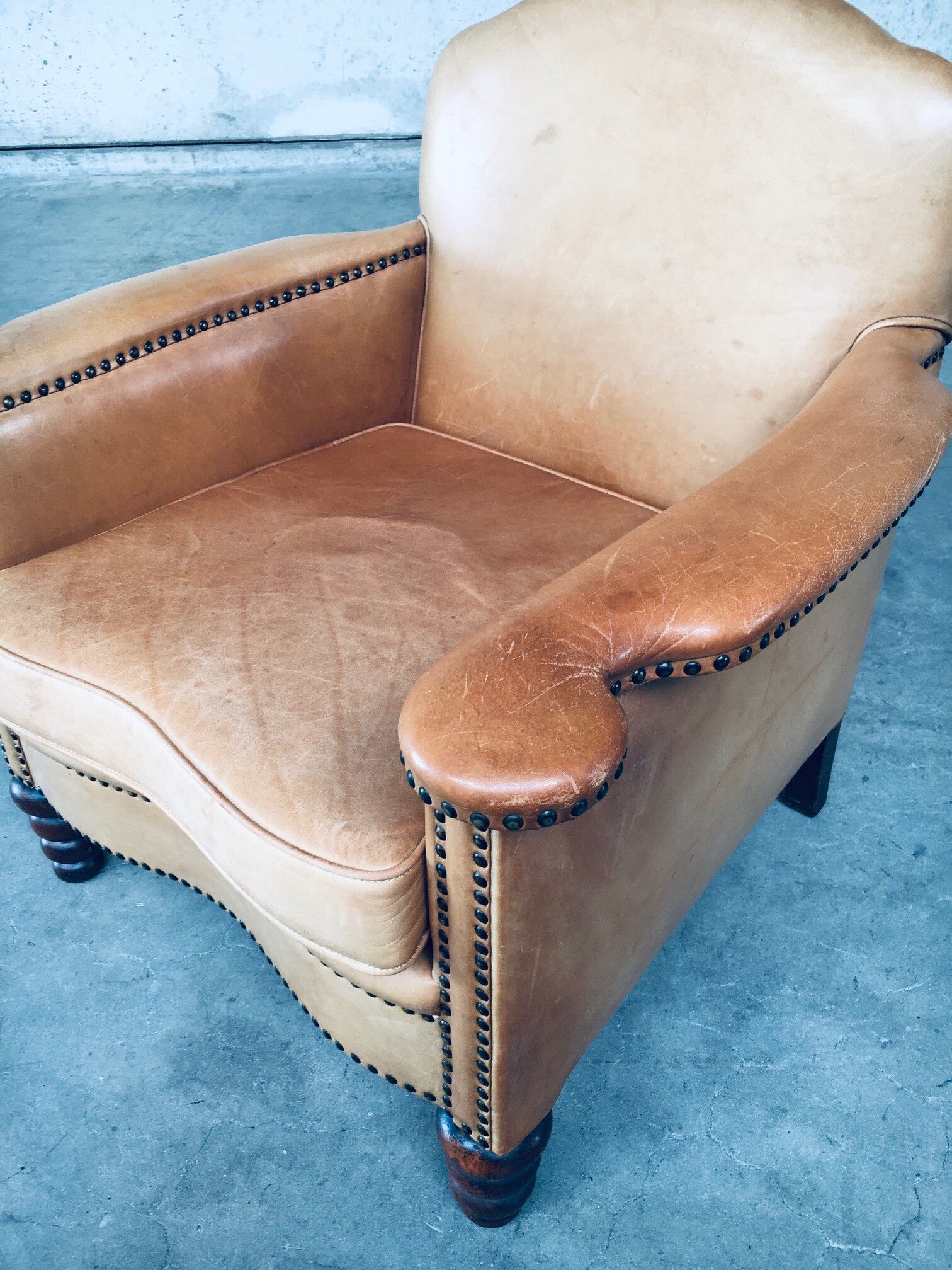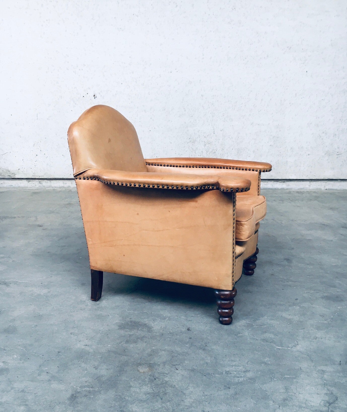 Vintage late Art Deco Design Cognac Leather Club Chair Armchair, made in Belgium 1940's. Cognac color leather with studs and turned oak feet. In good condition, with a patina consistant with it's age. Has a slight smoke odor due to it's previous owners. Measures 78cm x 81cm x 78cm.