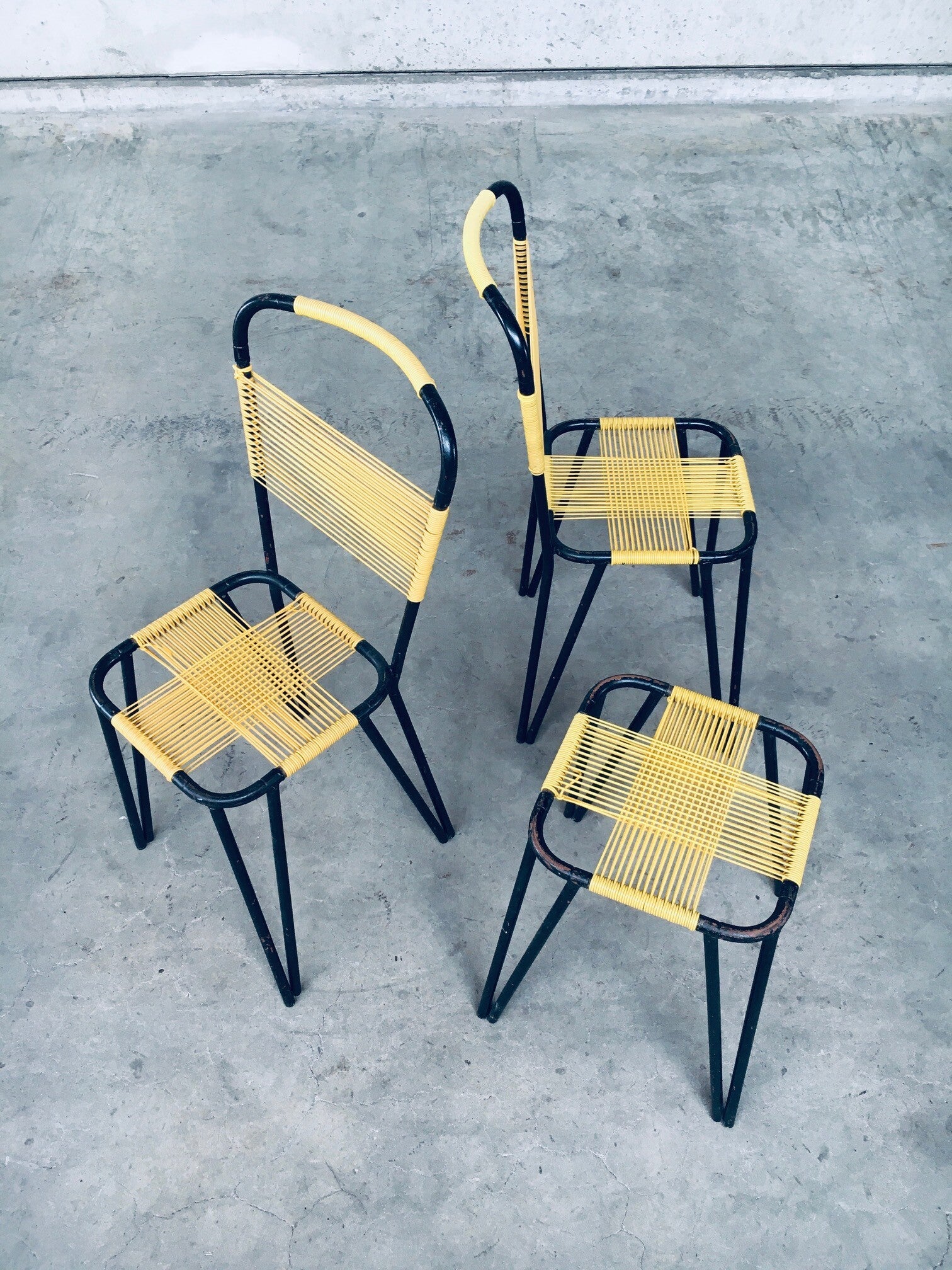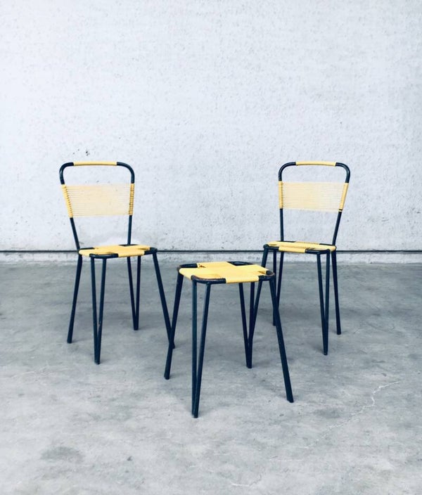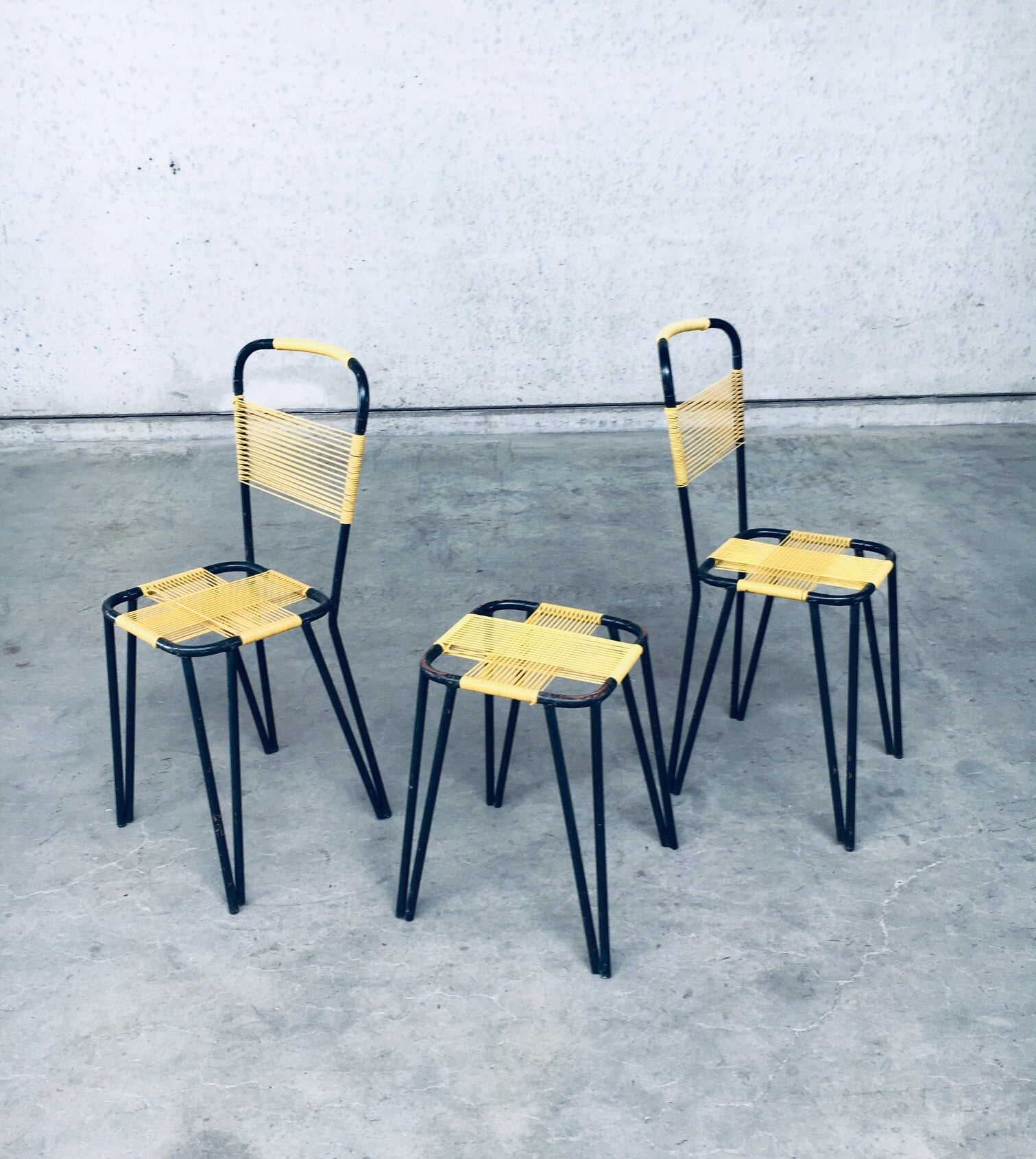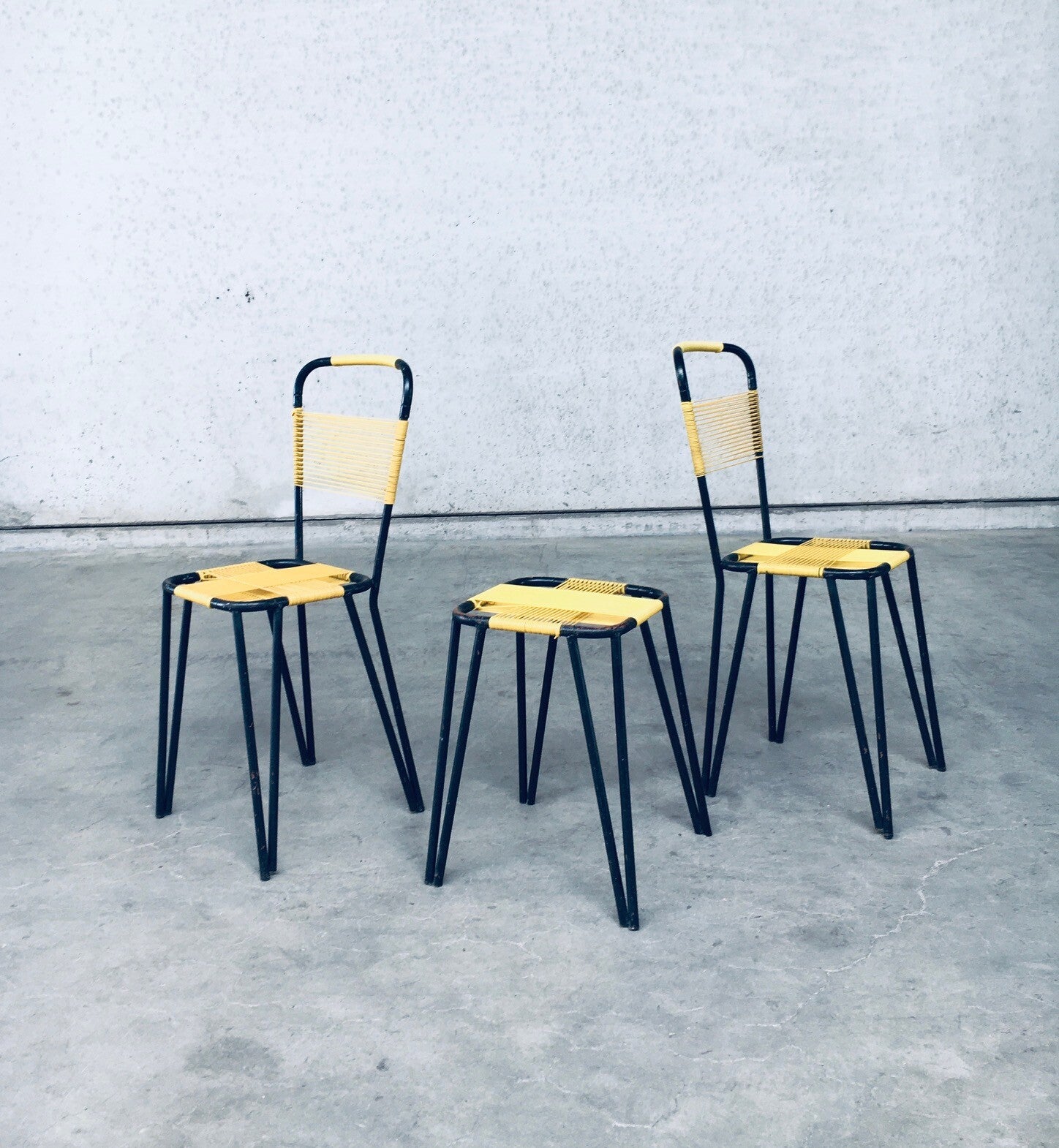 Vintage Midcentury Modern Belgian Design Spaghetti Chair & Stool set, made in Belgium 1950's. Black stained metal frame with yellow plastic woven seat and back. All three are in very good original condition, with a nice patina constistant with their age. Chairs measure 88cm high, Stool measures 47,5cm high.