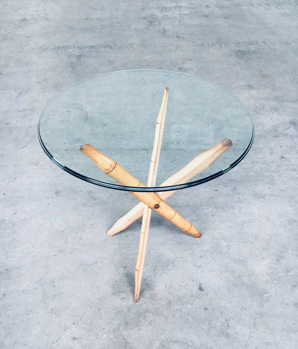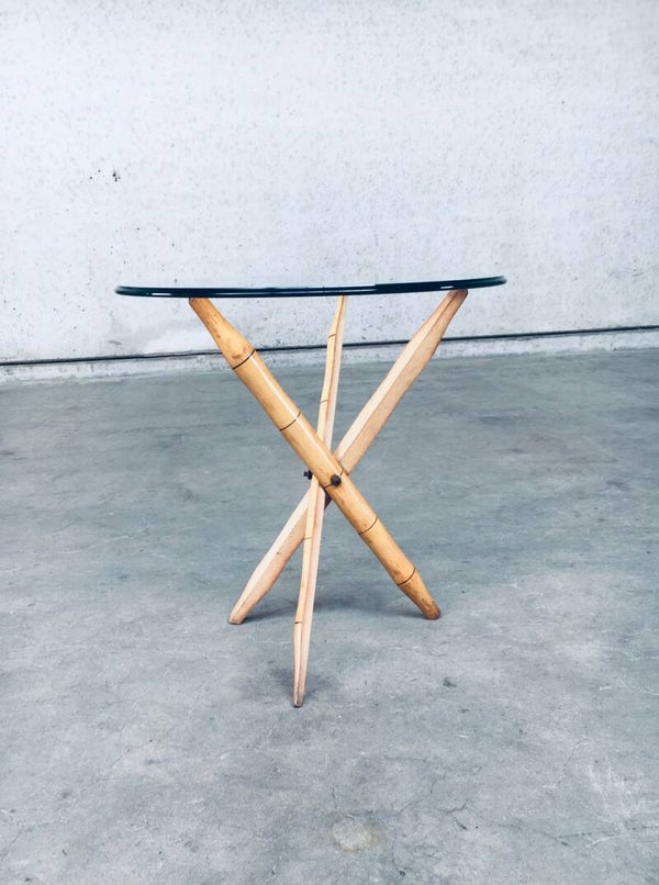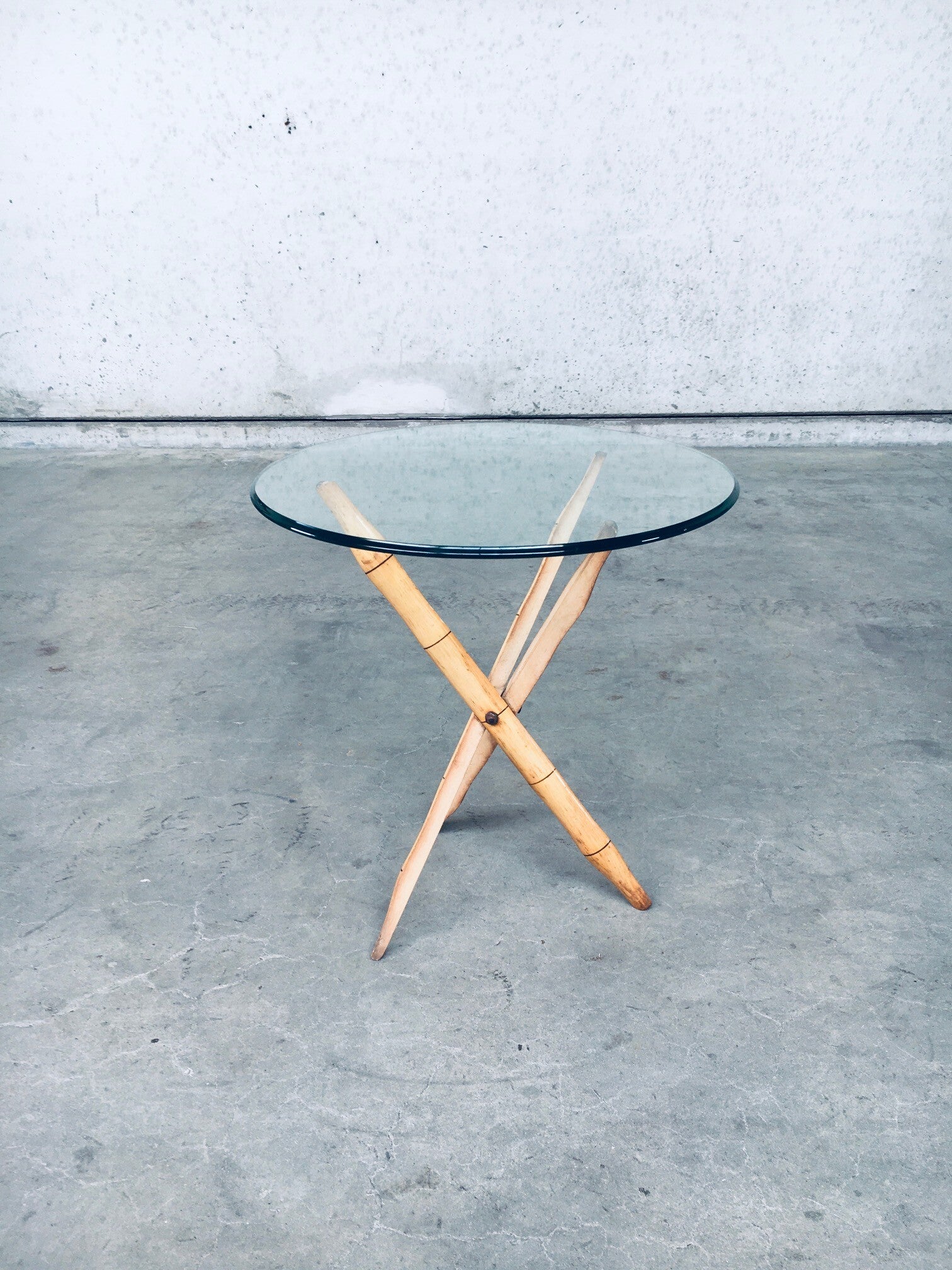 Vintage Design Faux Bamboo Tripod Side Table with Glass Top, made in the 1970's. Faux Bamboo folding wooden base with cut glass top. You can fold the tripod to a single stick. Cool designed piece. In very good original condition. Measures 49cm x 50cm x 49cm.