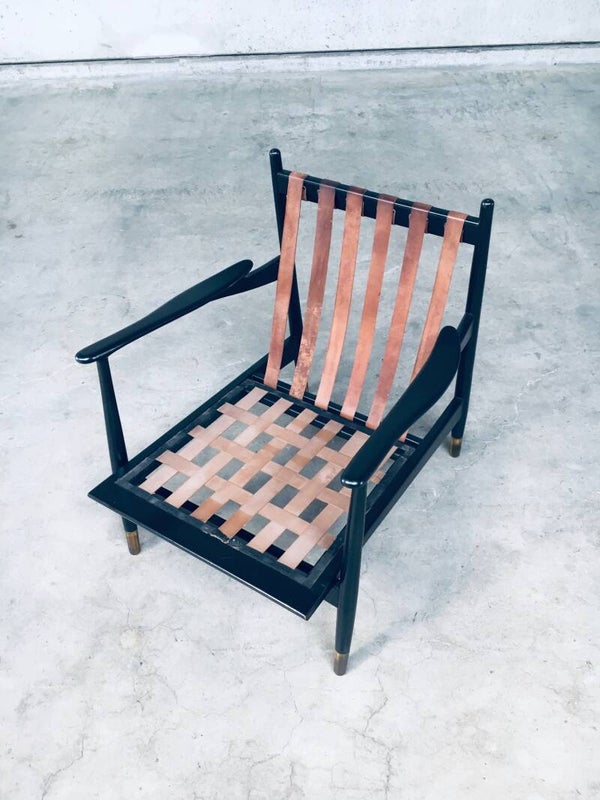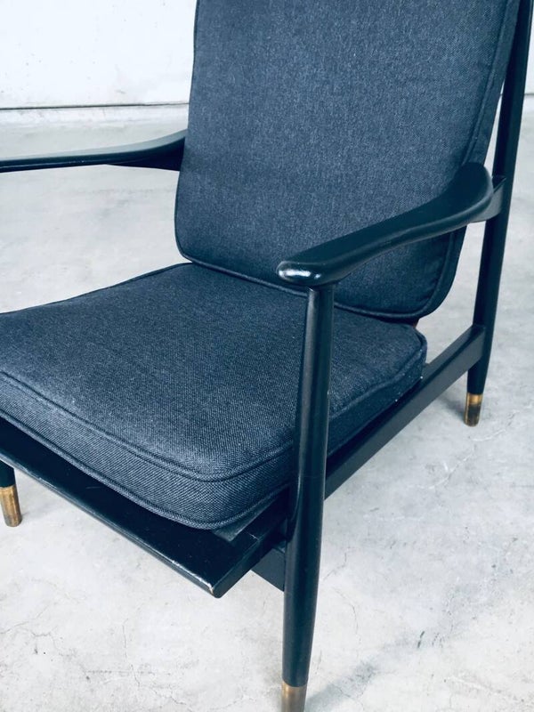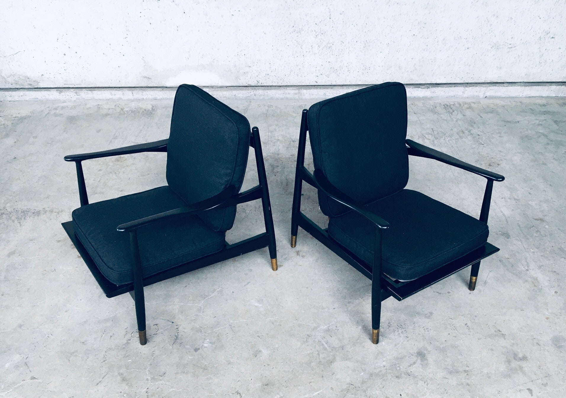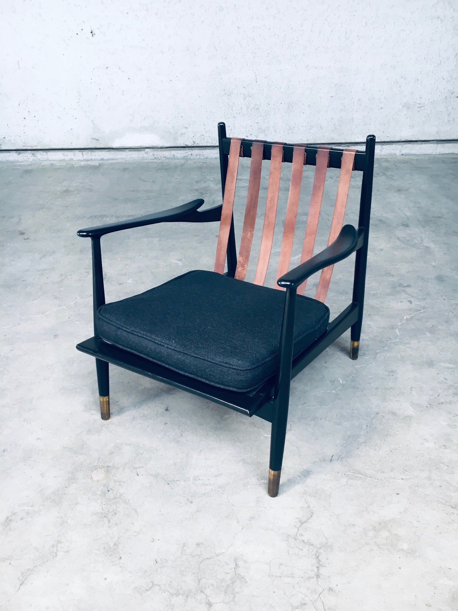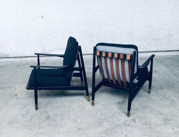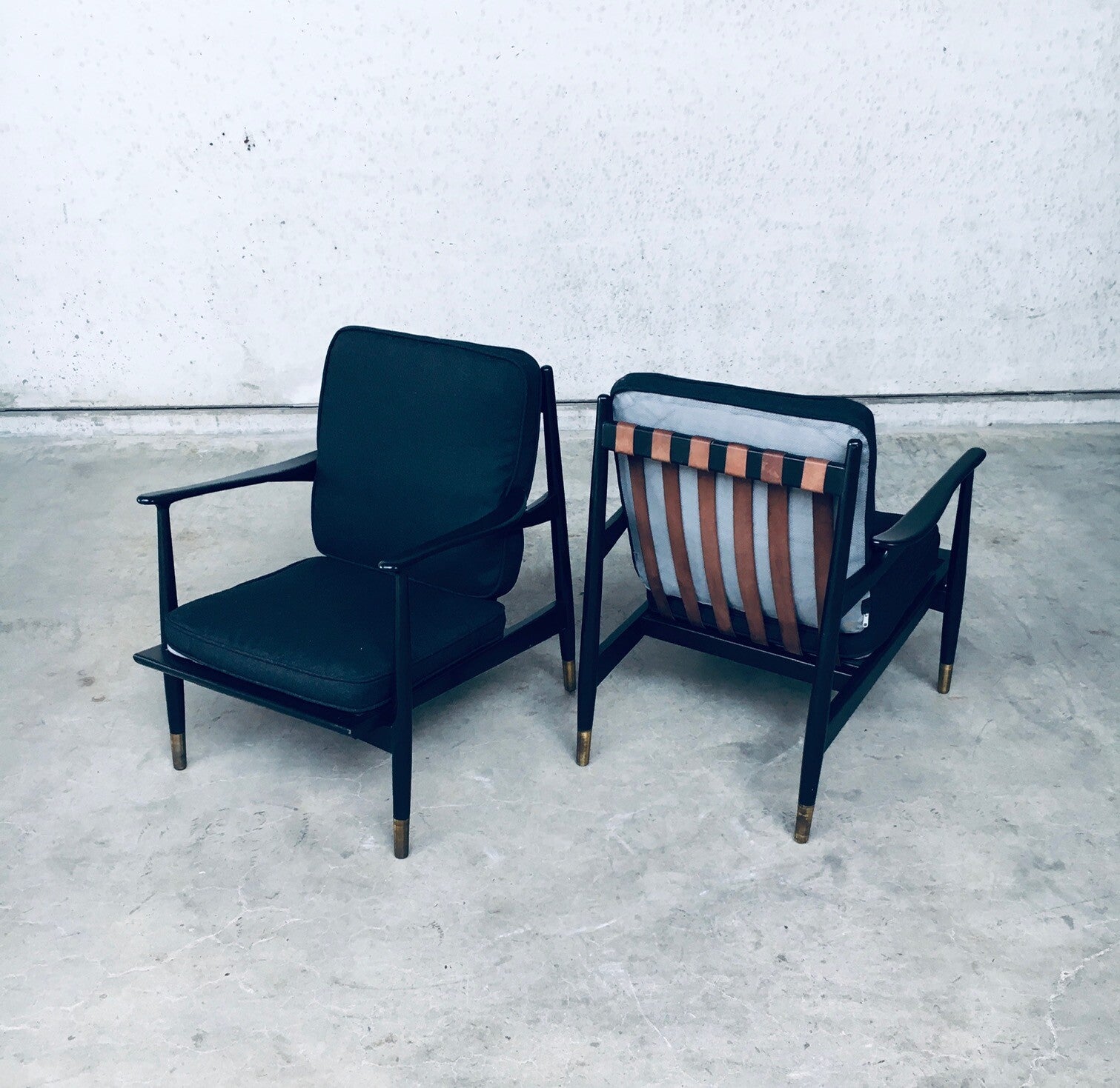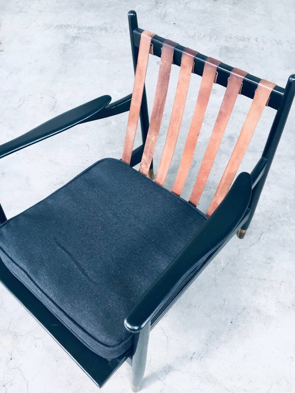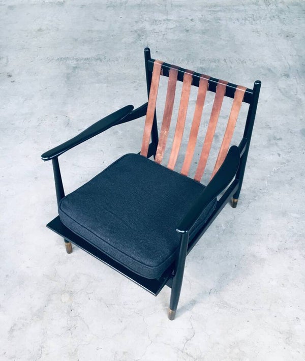 Vintage Midcentury Modern Scandinavian Design Black Laquered Lounge Armchair Set of 2, made in Denmark 1950's / 60's. Black laquered wooden frame with leather strap back and strapped seat bottom, and brass tipped feet. Complete with new cushions in dark grey. Both are in very good condition. Each chair measures 62cm x 80cm x 77cm.