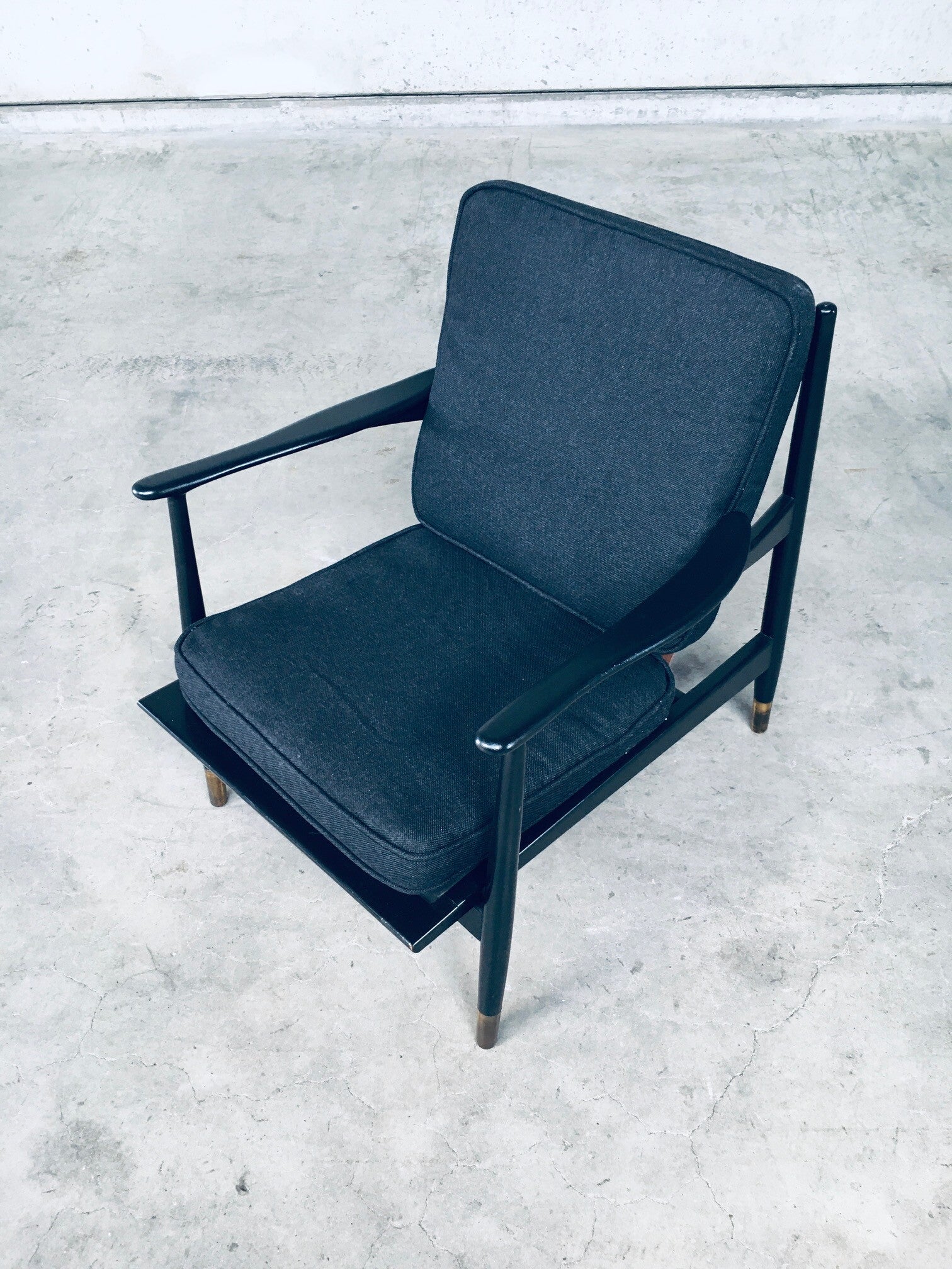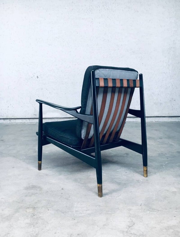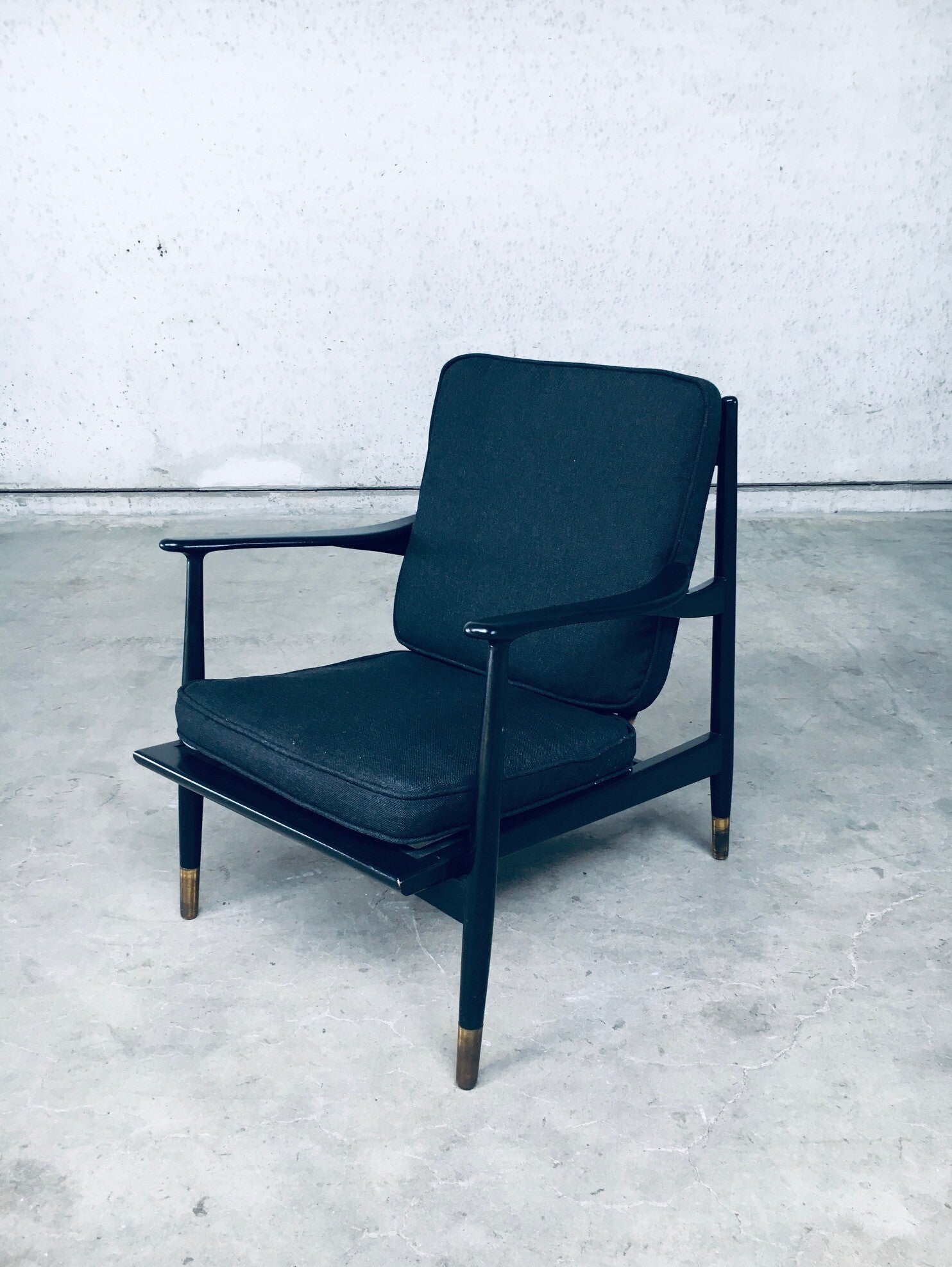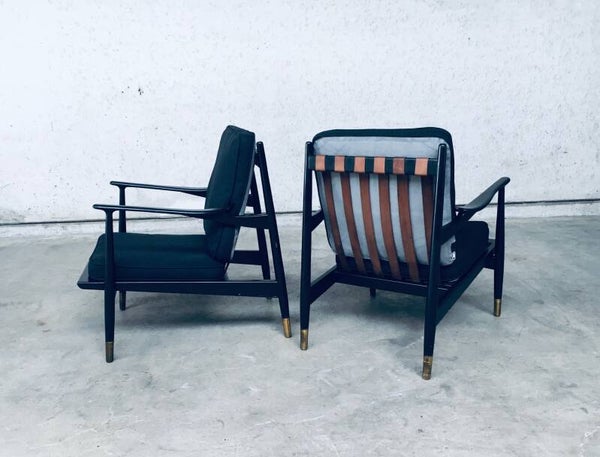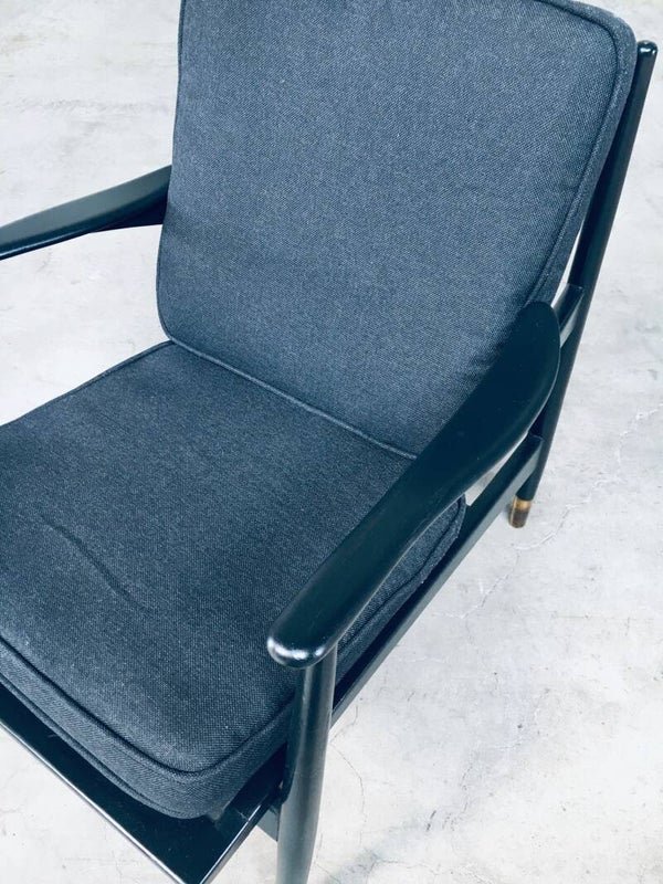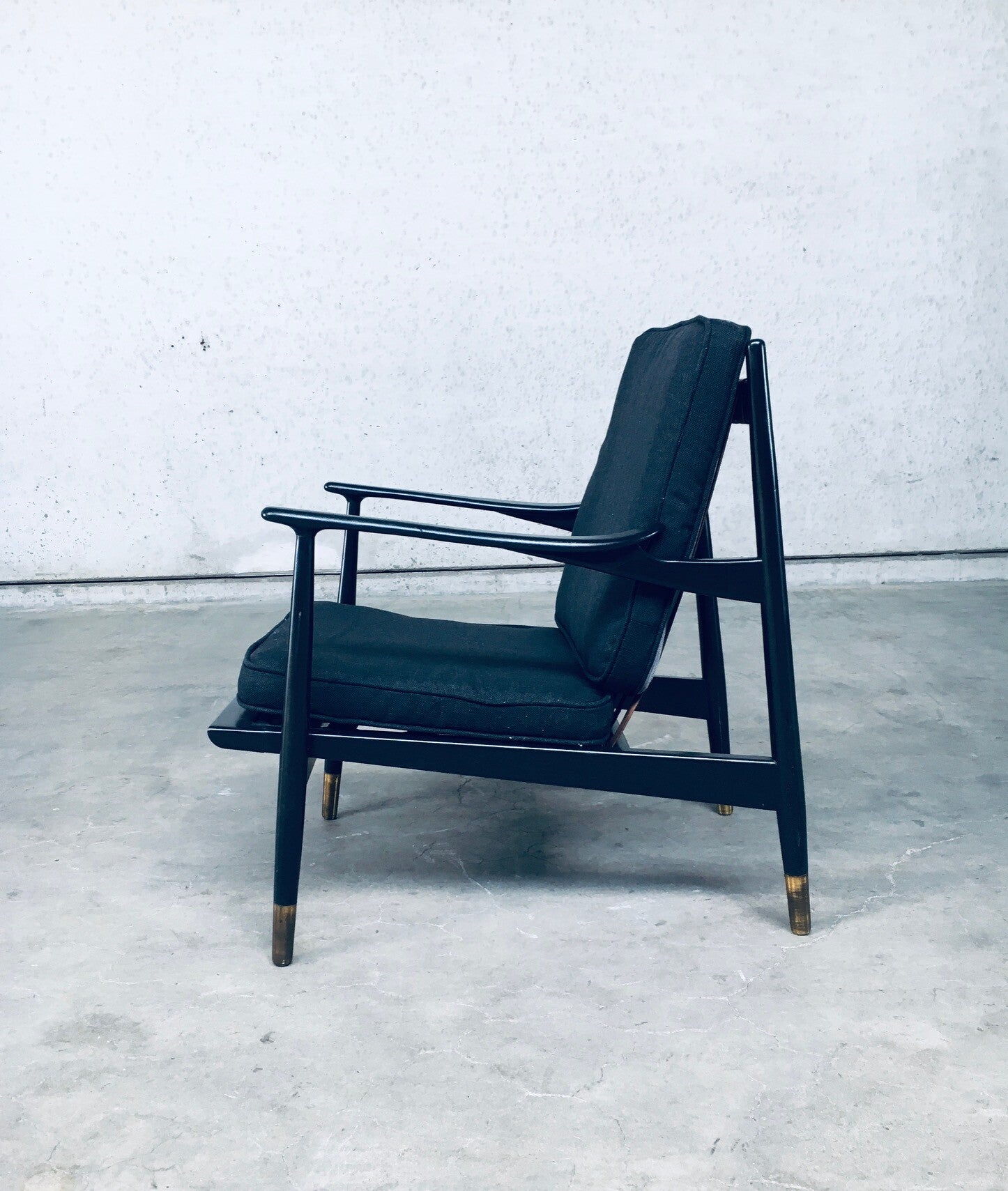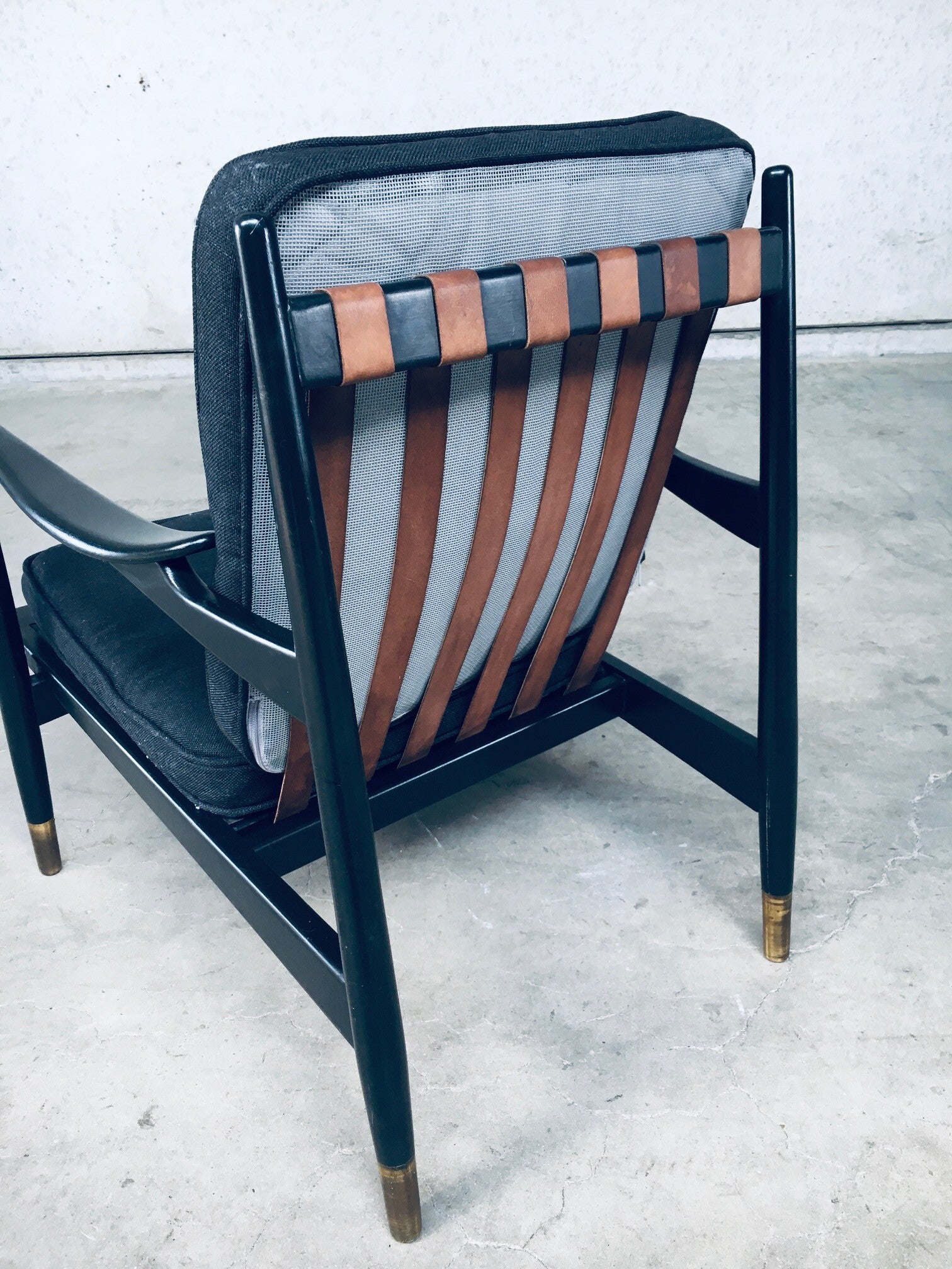 Vintage Midcentury Modern Scandinavian Design Black Laquered Lounge Armchair Set of 2, made in Denmark 1950's / 60's. Black laquered wooden frame with leather strap back and strapped seat bottom, and brass tipped feet. Complete with new cushions in dark grey. Both are in very good condition. Each chair measures 62cm x 80cm x 77cm.
