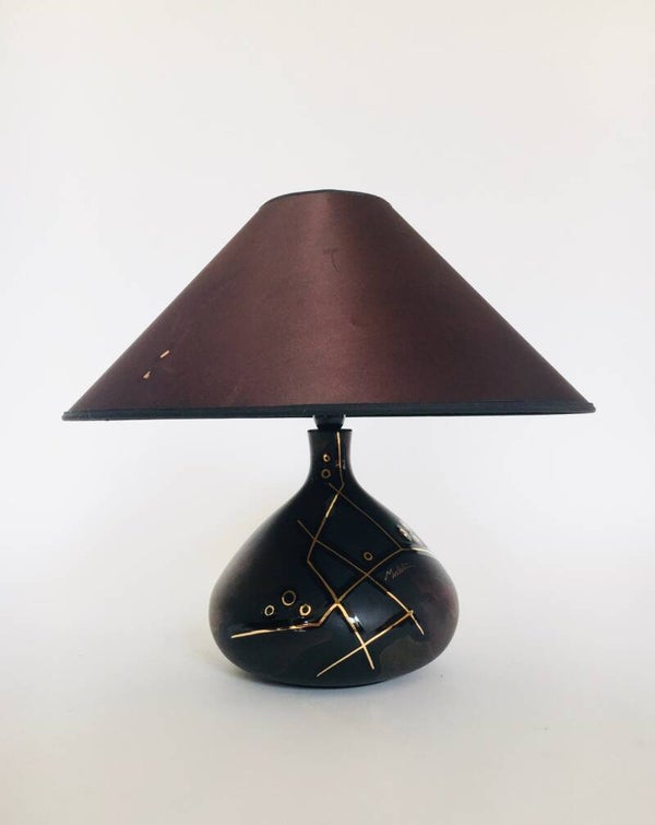 Vintage Postmodern Italian Design Table / Bedside Lamp set by Renzo Verzolini, Made by Questa Maiolica, fatta a mano, Italy 1980's. Black iridescent ceramic glazed and gold painted lamp base with original lampshades. Both lamp bases are different in illustration. Both are in very good condition. Each lamp measures 37cm x 40cm x 40cm.