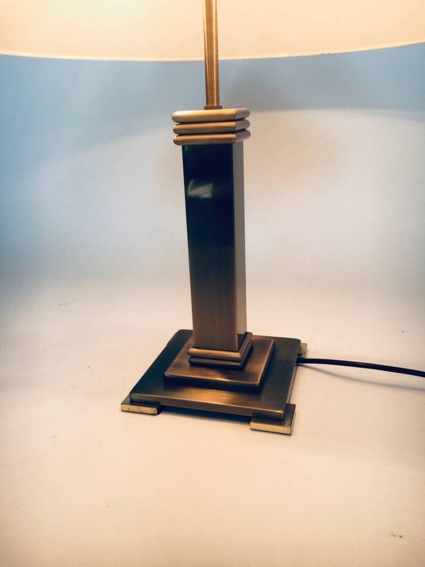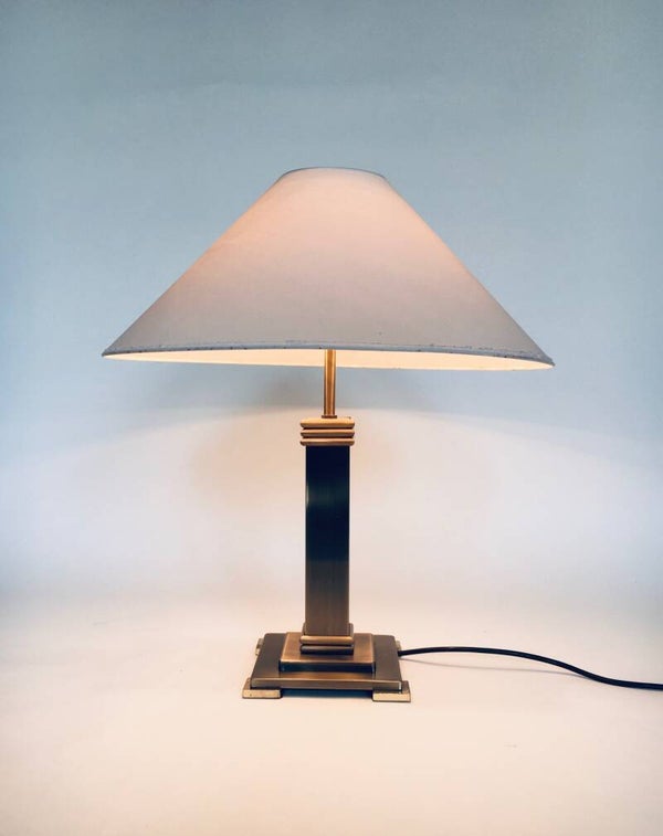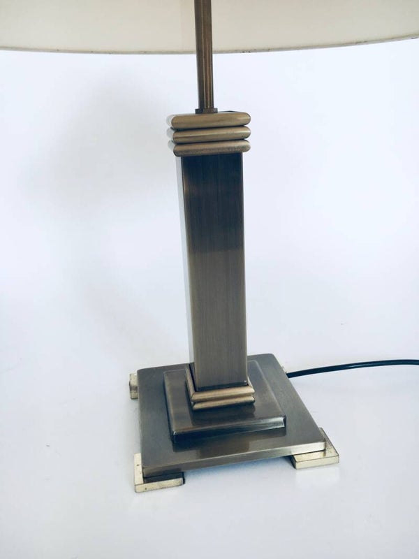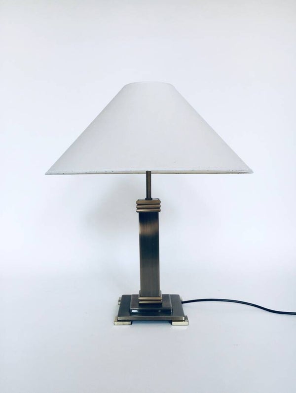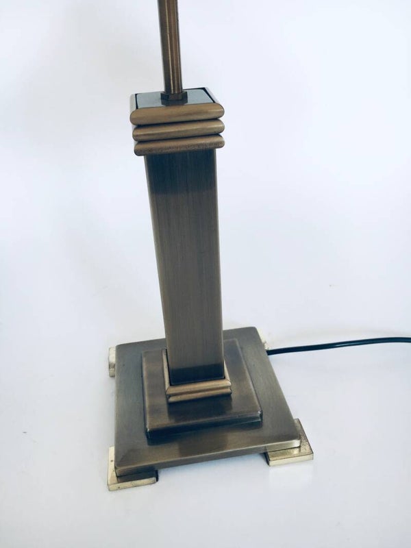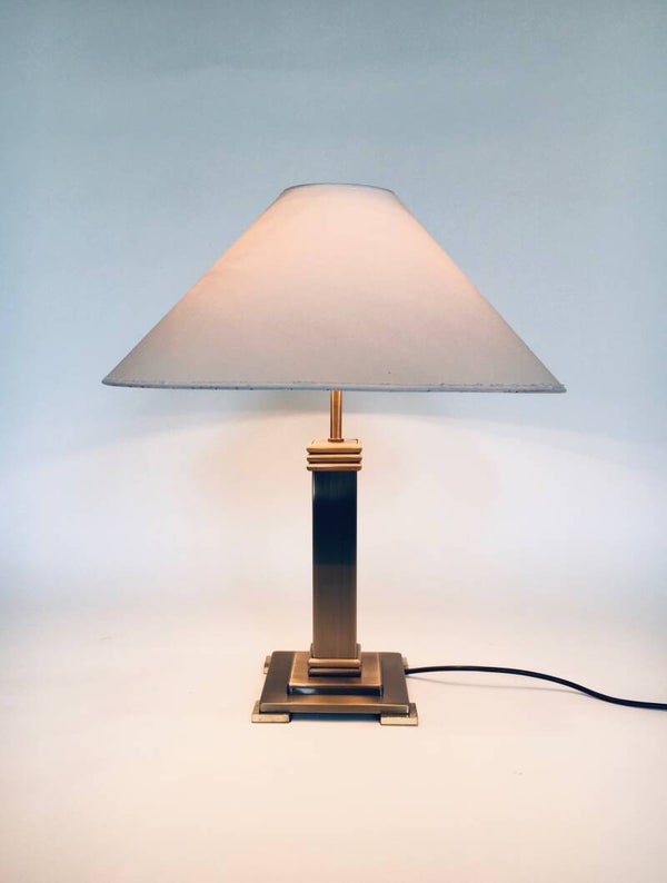 Vintage Postmodern Architectural Design Table Lamp by Belgo Chrom, Belgium 1980's. Brushed metal and brass base with original lamp shade. In very good original condition. Measures 57cm x 50cm x 50cm.