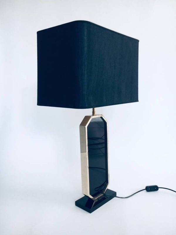 Vintage Hollywood Regency Design Brass Etched Maho Table Lamp by George Mathias for M2000, Belgium 1970's. Designo Maho, numbered 65/250. 23 carat gold plated brass etched with black perspex. Black with gold inner lampshade. 2 light points. In very good, original condition. Adjustable height. As pictured this measures 80cm x 45cm x 28cm.