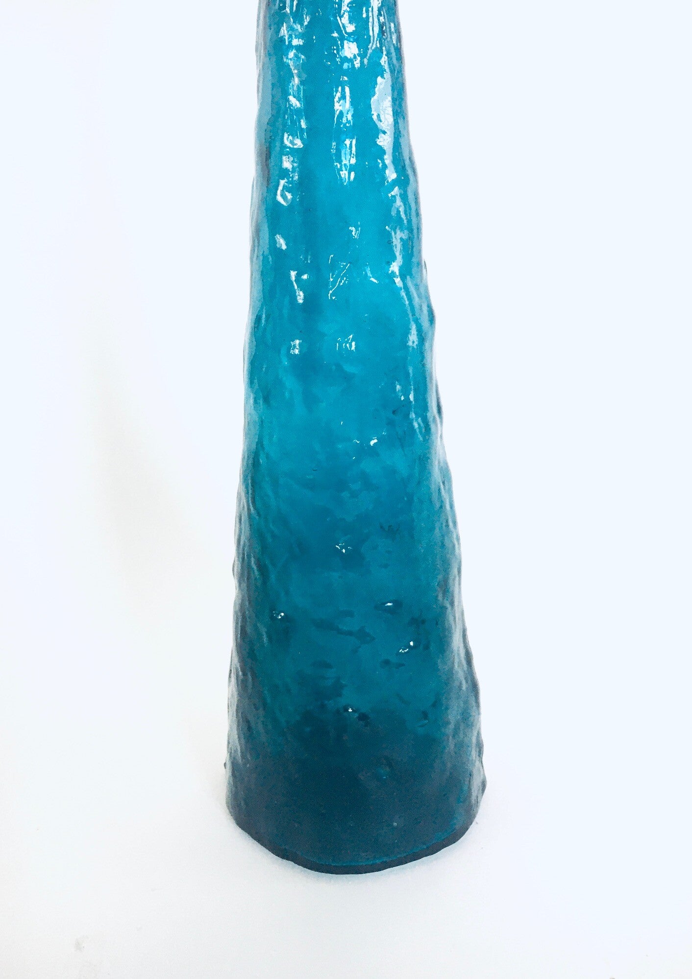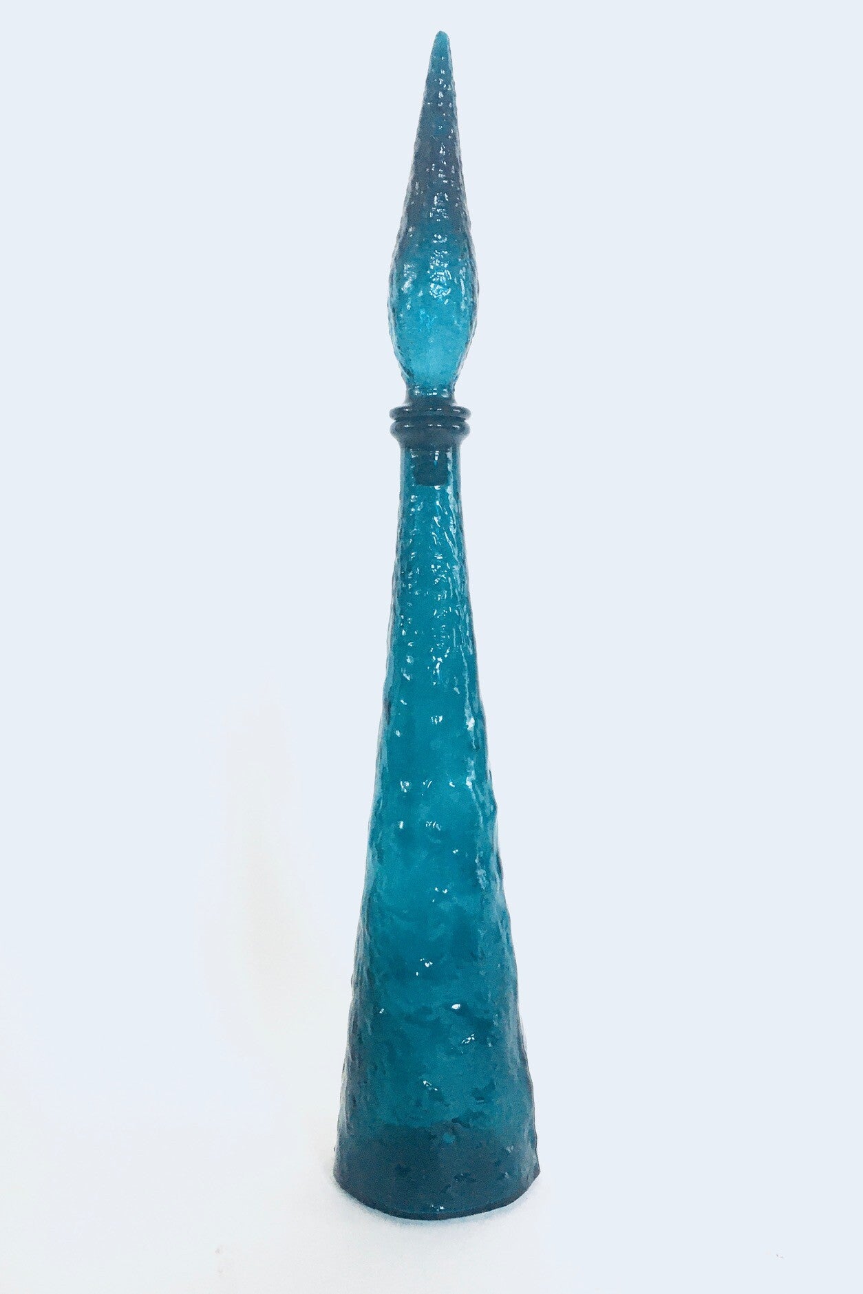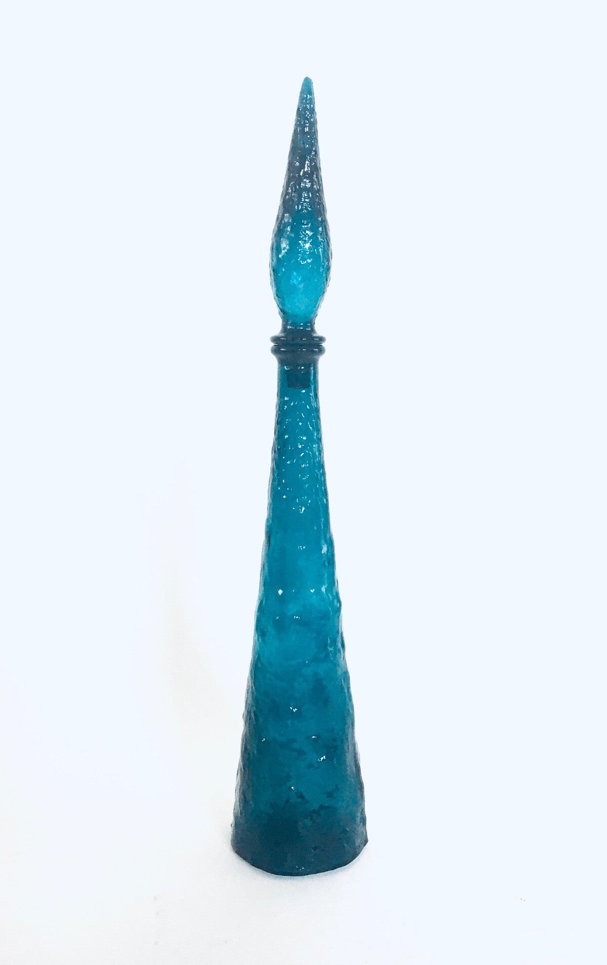 Vintage Midcentury Modern Italian Design Prussian Blue Glass GENIE Decanter Bottle with stopper, Empoli, Italy 1960's. Impressive prussian blue pressed bark relief glass decanter bottle with original stopper. In very good condition. Measures 57cm x 11cm x 11cm.