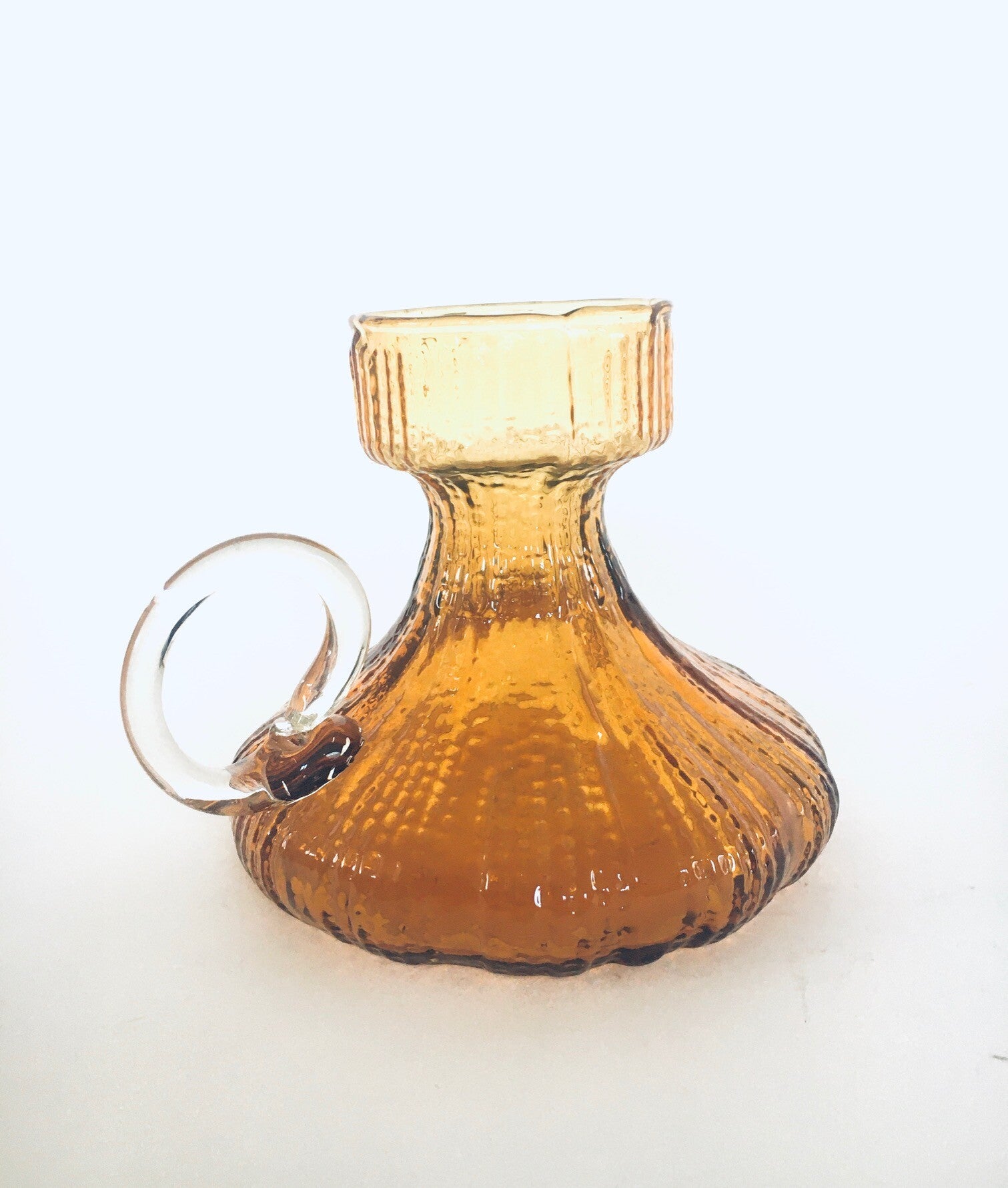 Vintage Midcentury Modern Scandinavian Art Glass Decanter, made in Finland 1960's. Heavy amber pressed glass with rope motif and handblown created clear glass handle. No maker markings. In very good condition. Measures 16,5cm x 18,5cm x 22cm.