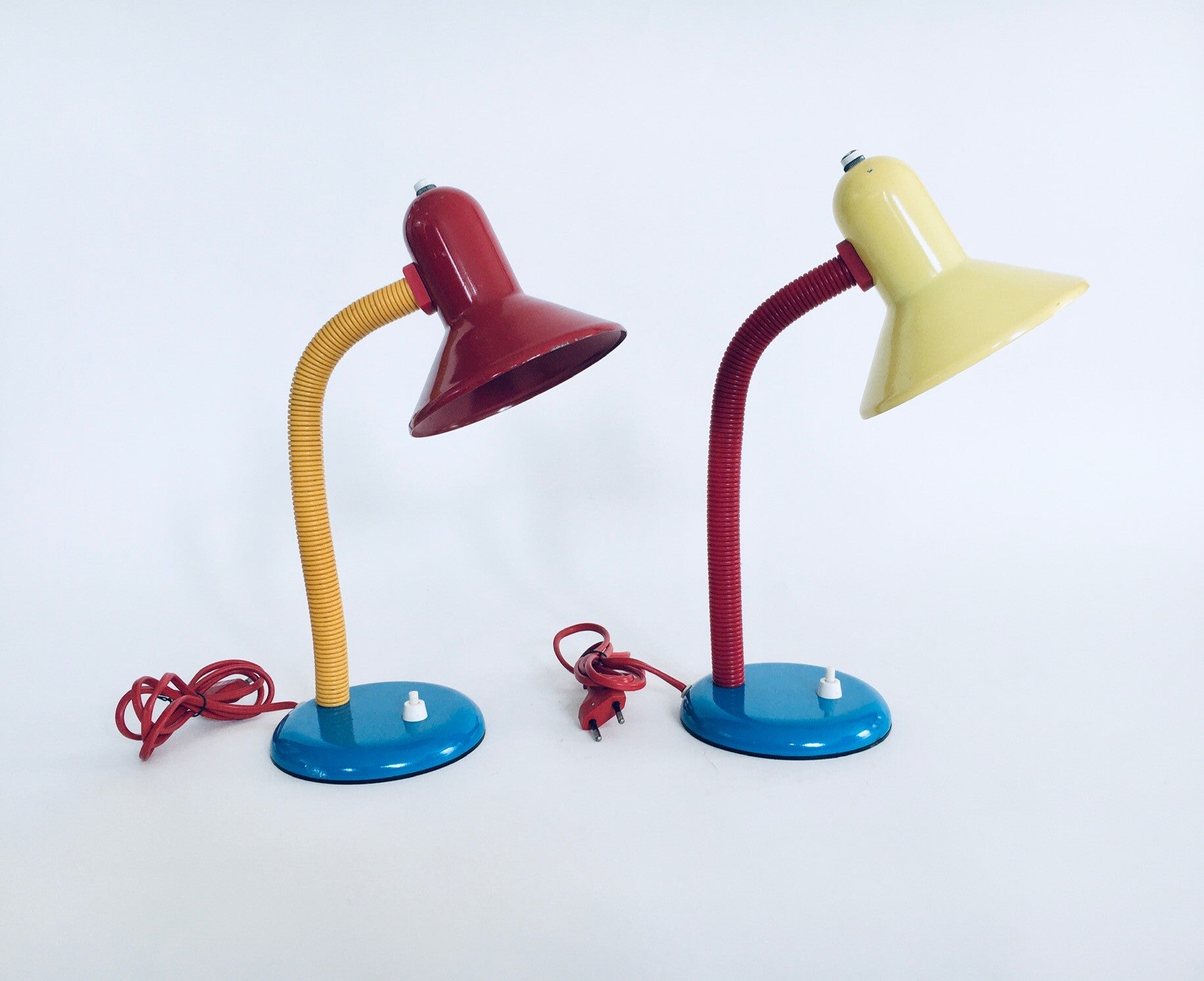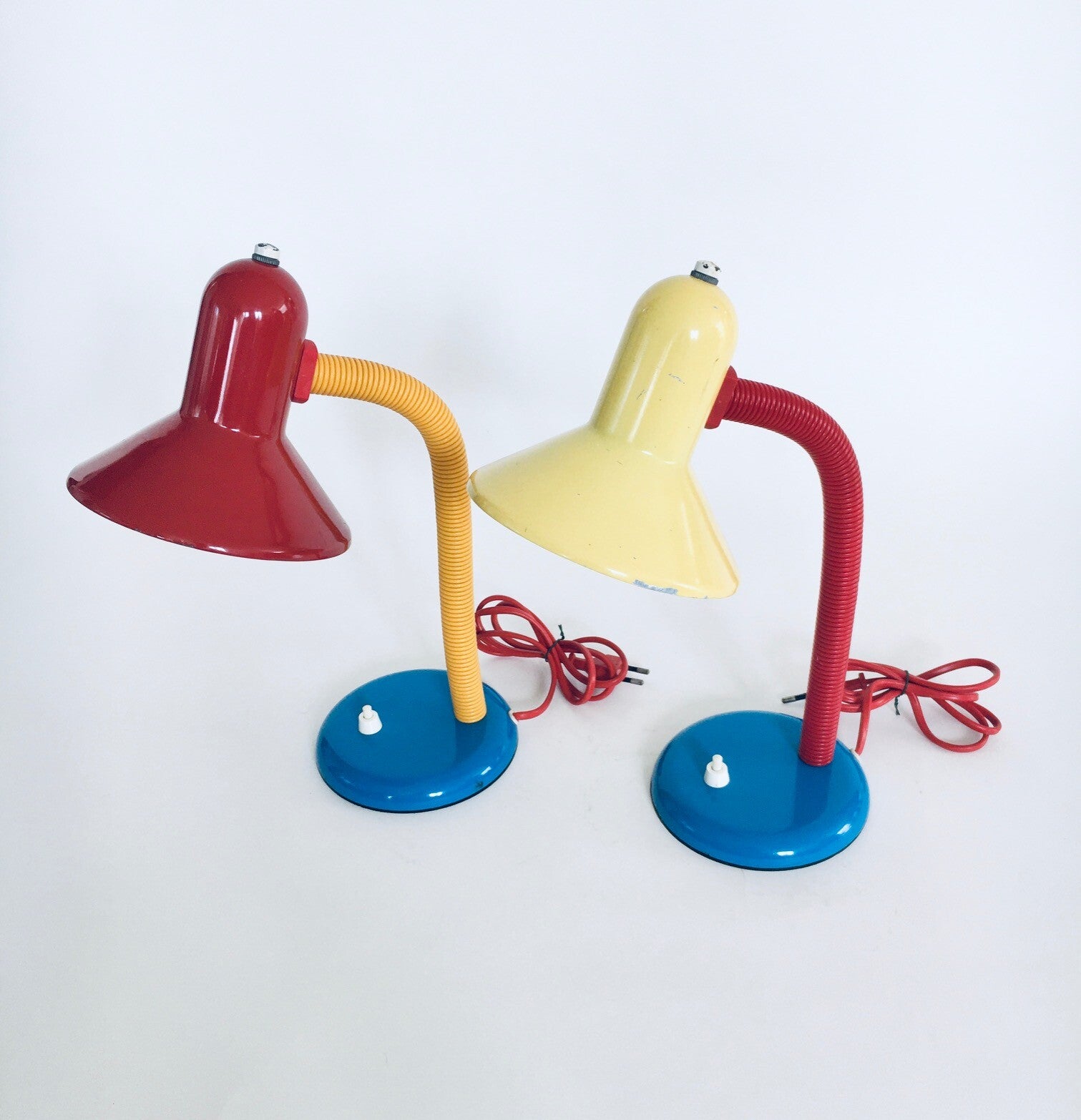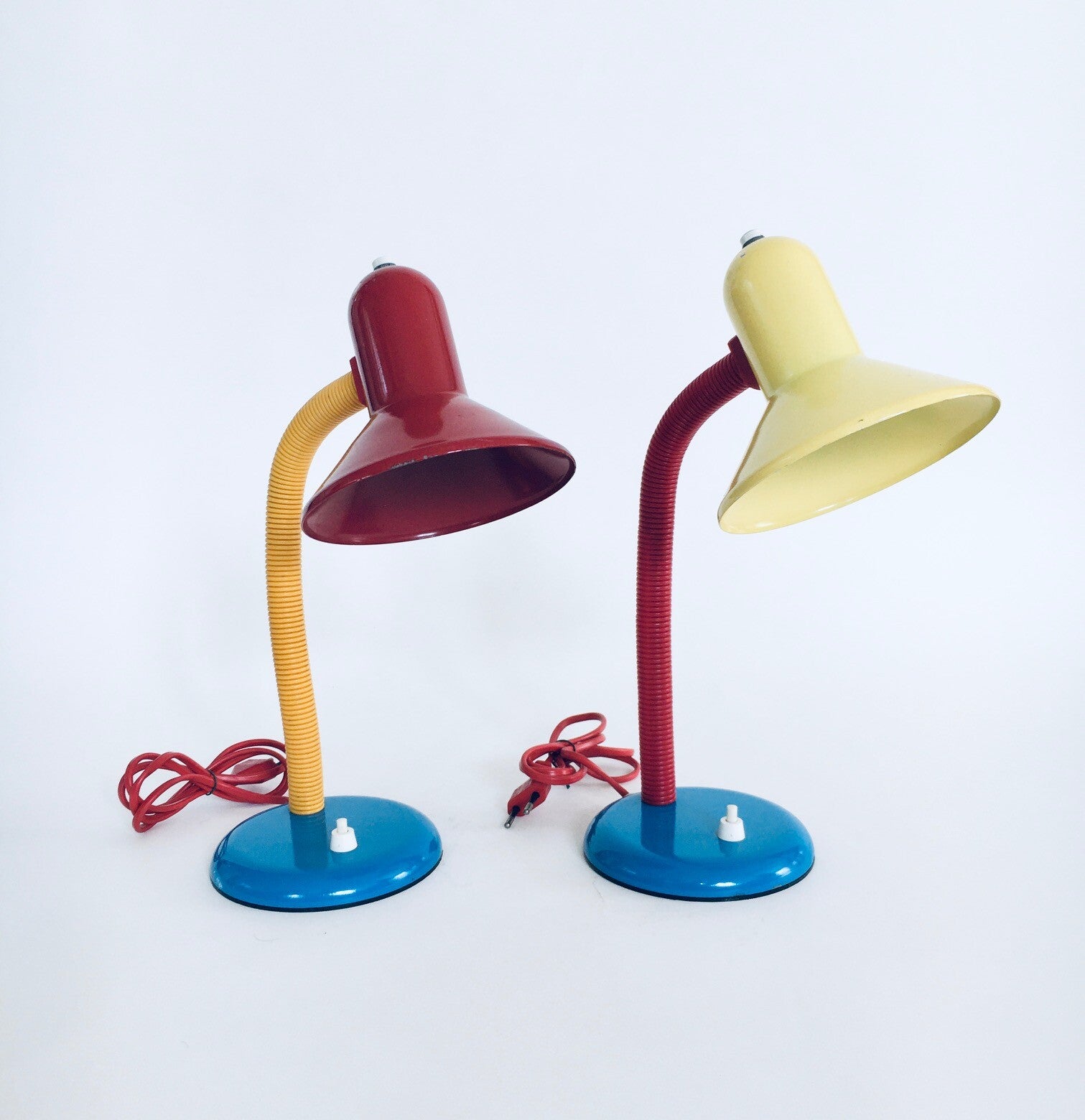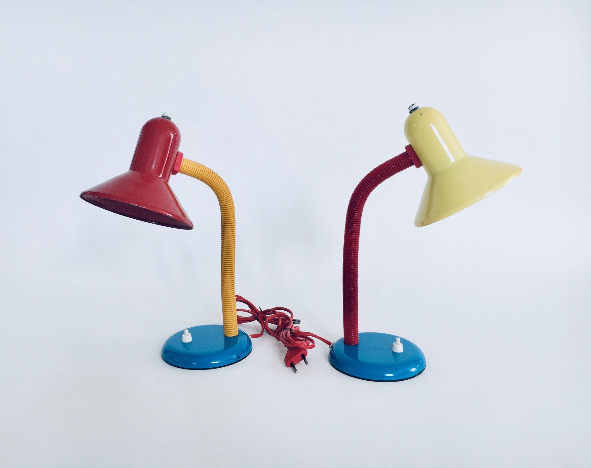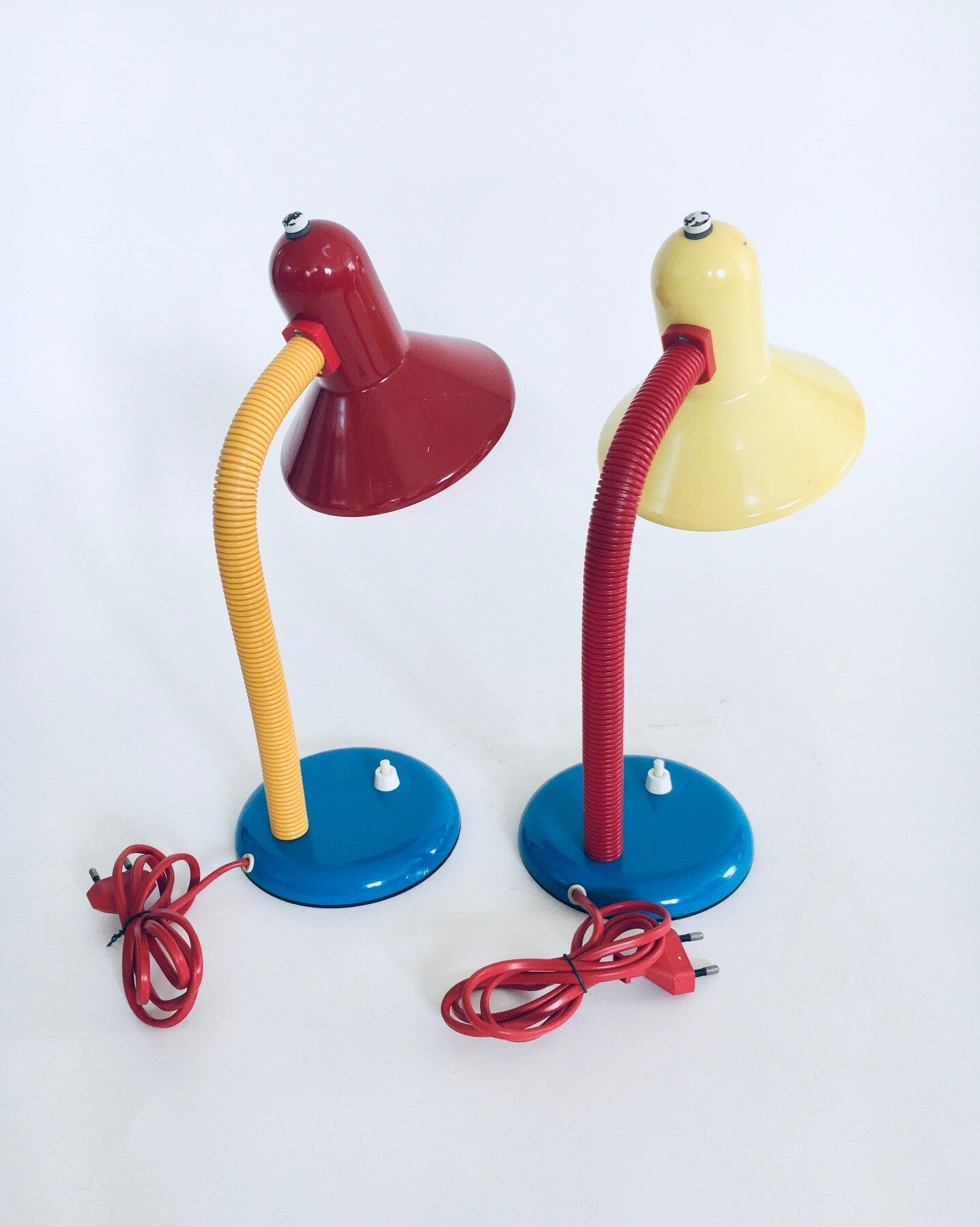 Vintage Postmodern Memphis Era Design Desk Lamp set by Eurolux, 1980's Germany. Set of 2 colorful small desk lamps, metal construction with plastic cover on bendable shaft. Both are in very good condition, with minor wear. Each lamp measures about 35cm x 14cm x 22cm.
