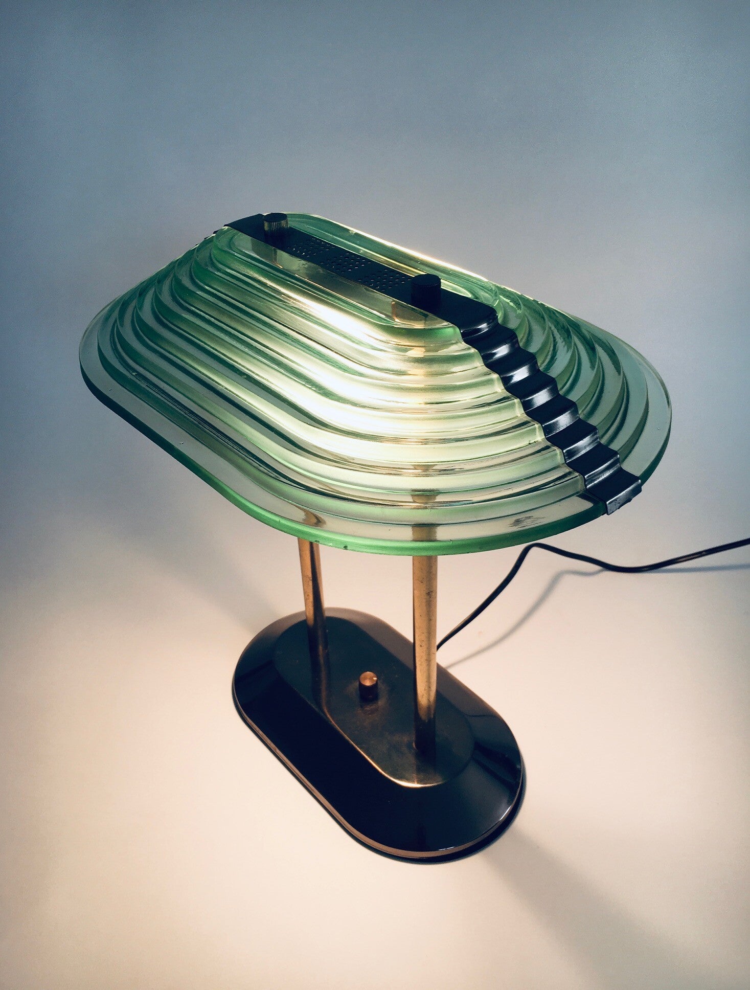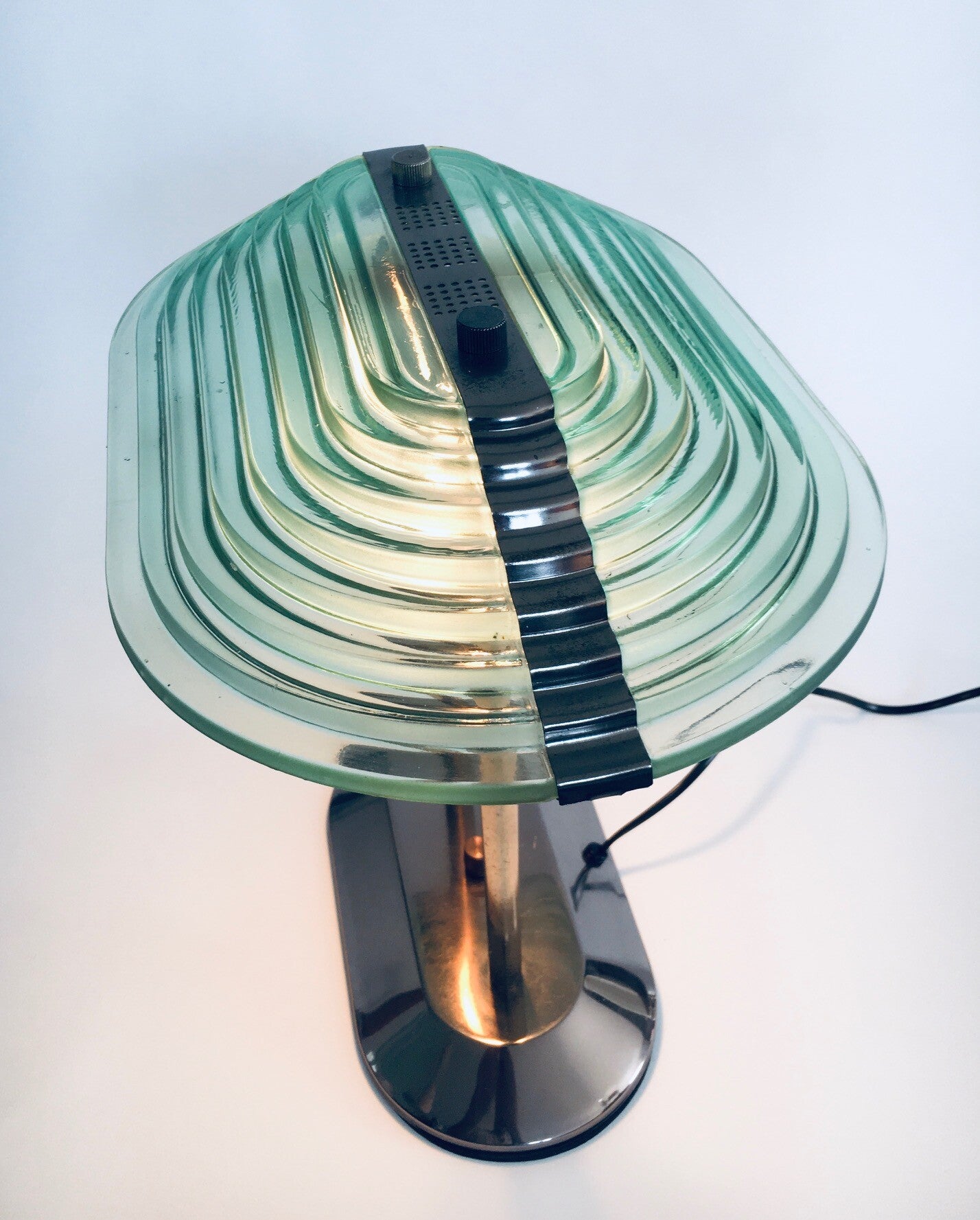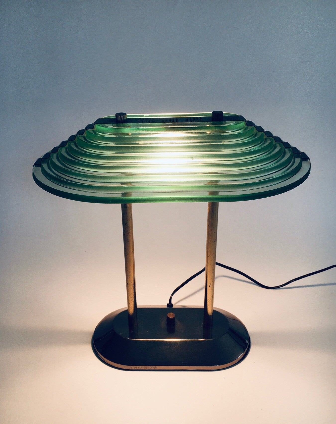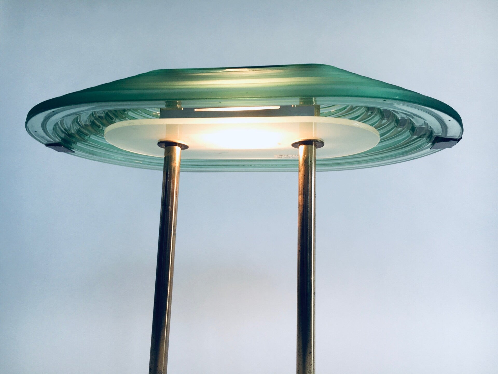 Vintage Memphis Style Era Architectural Design Desk Lamp, made in the 1980's / 90's. Bronzed metal and glass construction with halogen lamp. Adjustable light strenght. In very good condition, with minor wear. Etched with a serial number: A-MYK1947-59. Measures 39cm x 38,5cm x 25,5cm.
