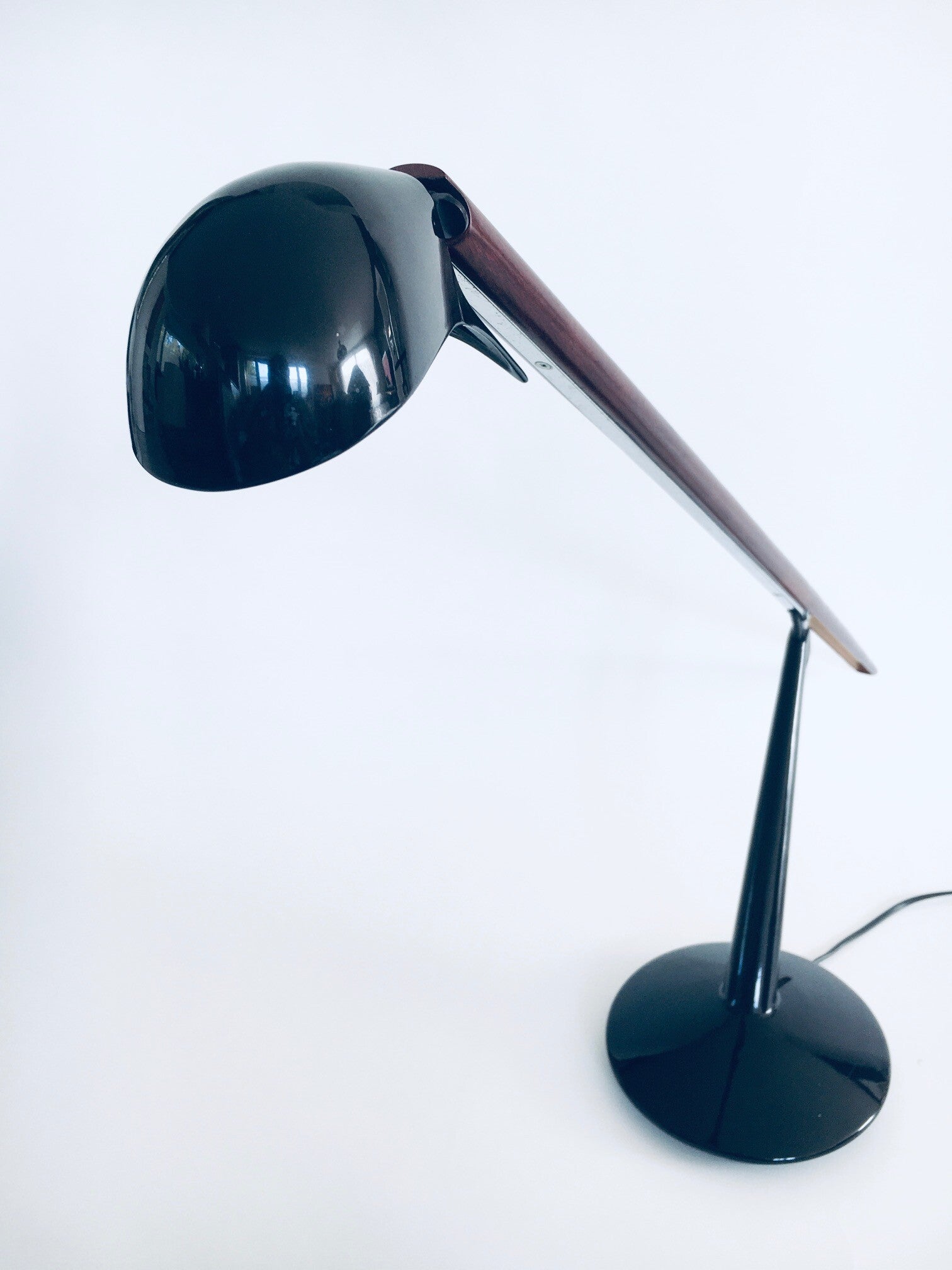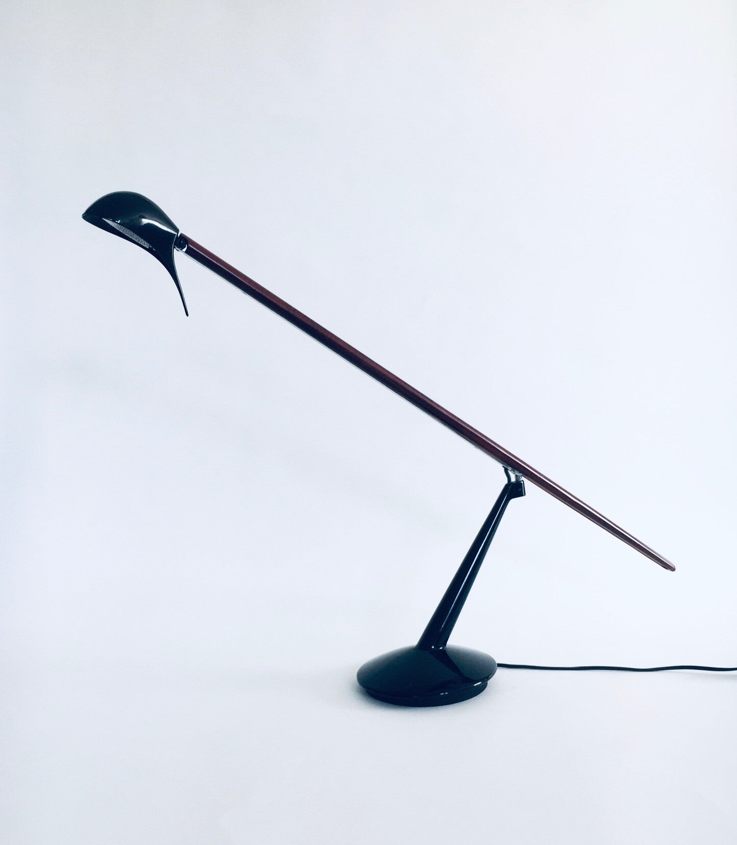 Vintage Postmodern Design "BLUEBIRD" Desk or Table Lamp by Jorge Pensi for B. Lux, made in Spain 1990's. Pivoting and adjustable in height desk or table lamp in black metal and mahogany wood with halogen lamp. Comes in very good condition. Measures about 65cm x 95cm x 19cm.