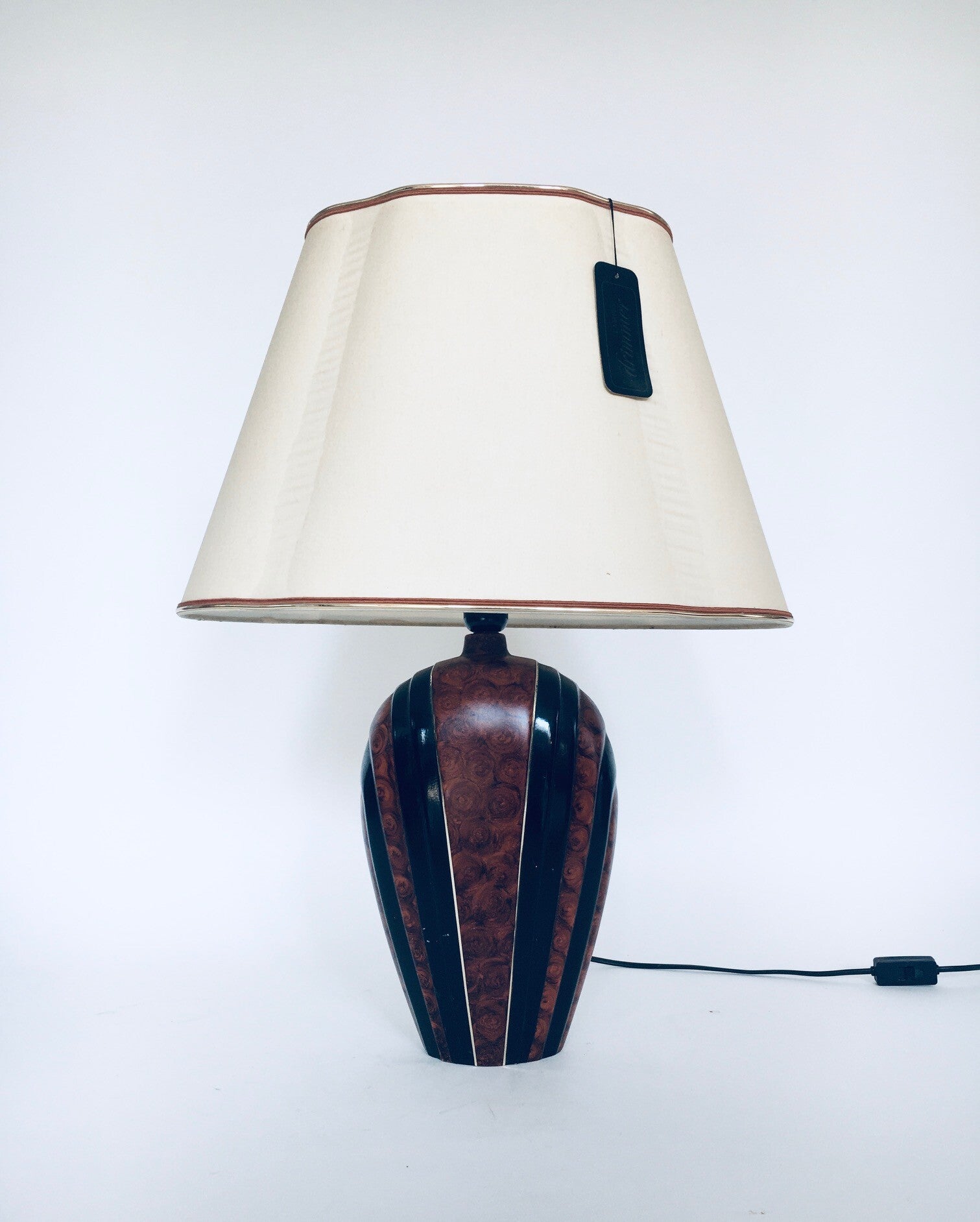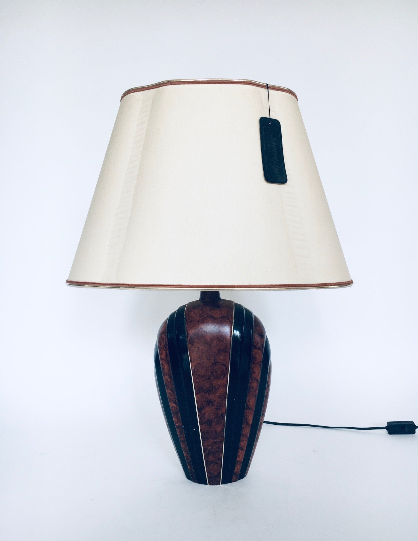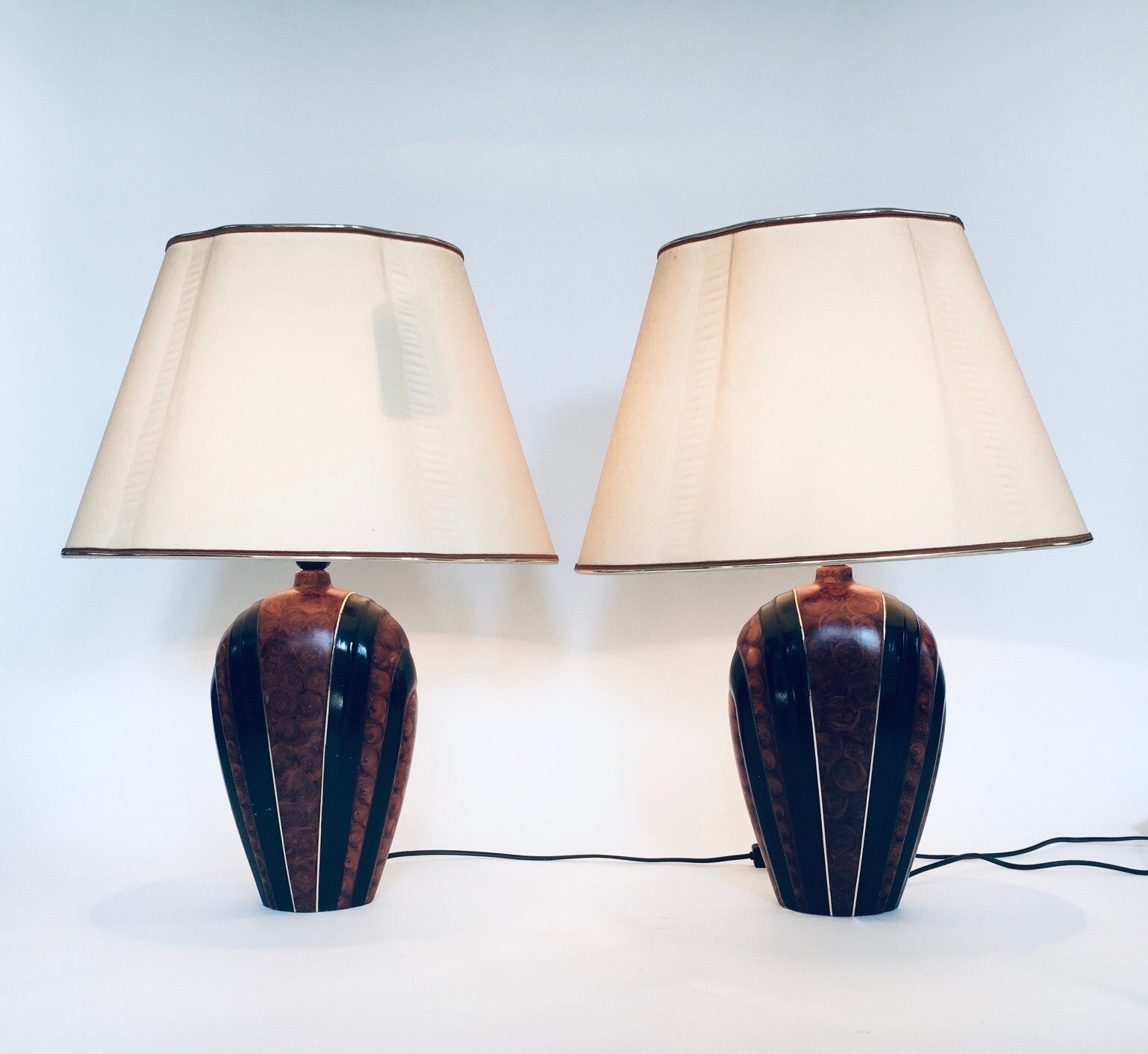 Vintage Hollywood Regency Style Design Table Lamp set by Lampes Drimmer, France 1970's. Ceramic base with original lamp shades. Brown wood imitation painted with black and gold trim. One lamp has it's original label. Both are in very good condition. Each lamp measures, including lampshade; 64cm x 47cm x 30cm.