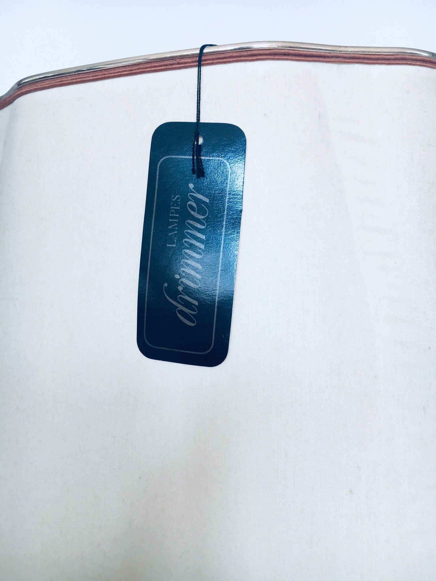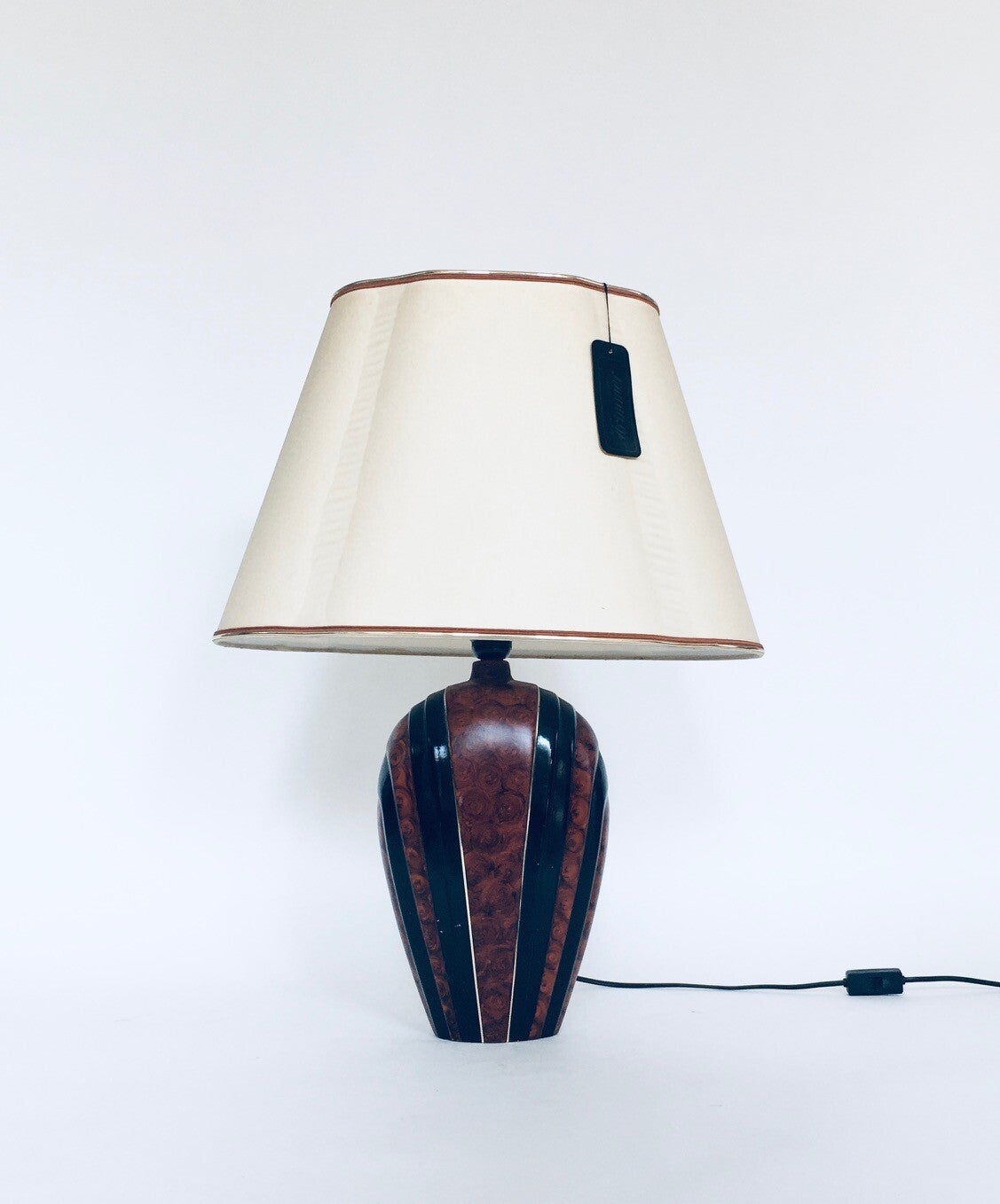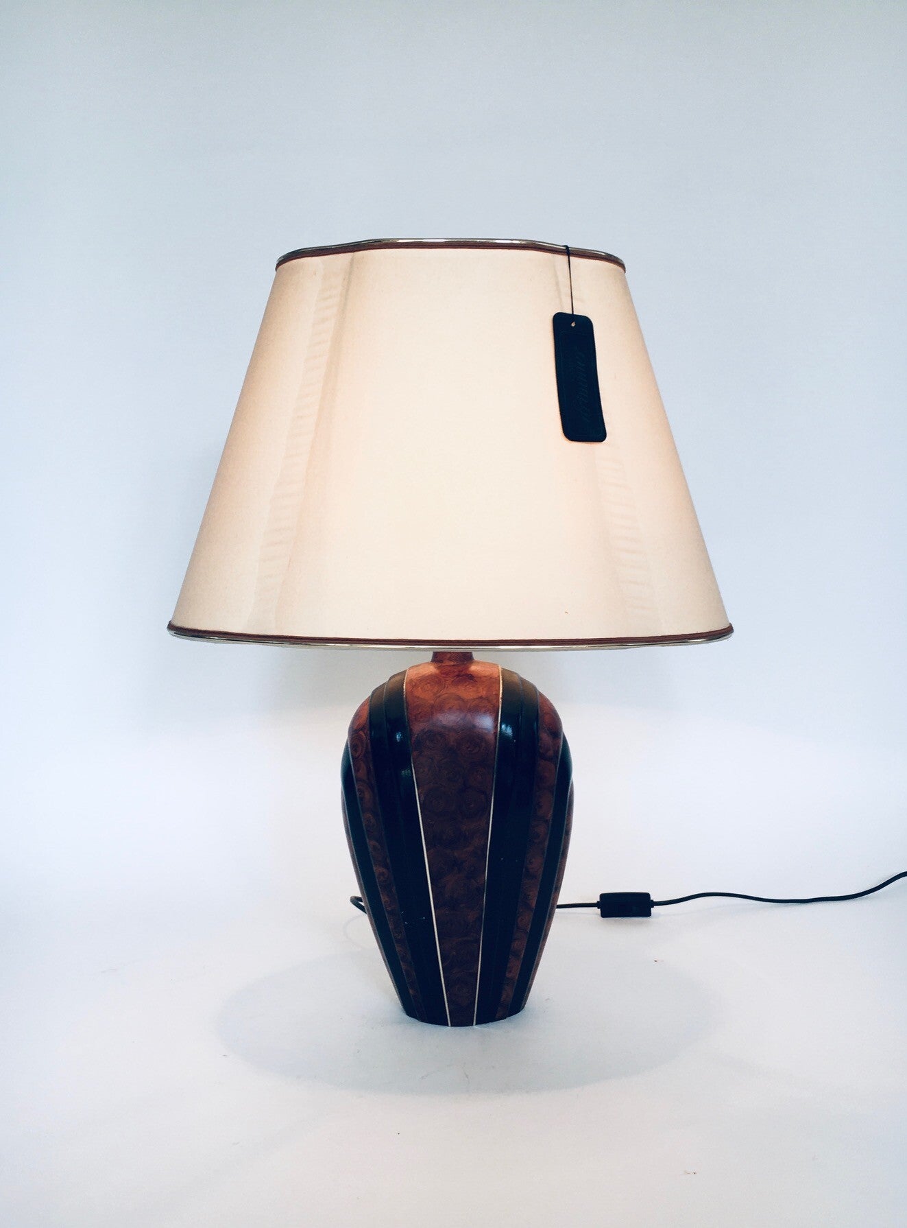 Vintage Hollywood Regency Style Design Table Lamp set by Lampes Drimmer, France 1970's. Ceramic base with original lamp shades. Brown wood imitation painted with black and gold trim. One lamp has it's original label. Both are in very good condition. Each lamp measures, including lampshade; 64cm x 47cm x 30cm.