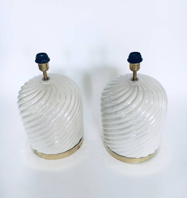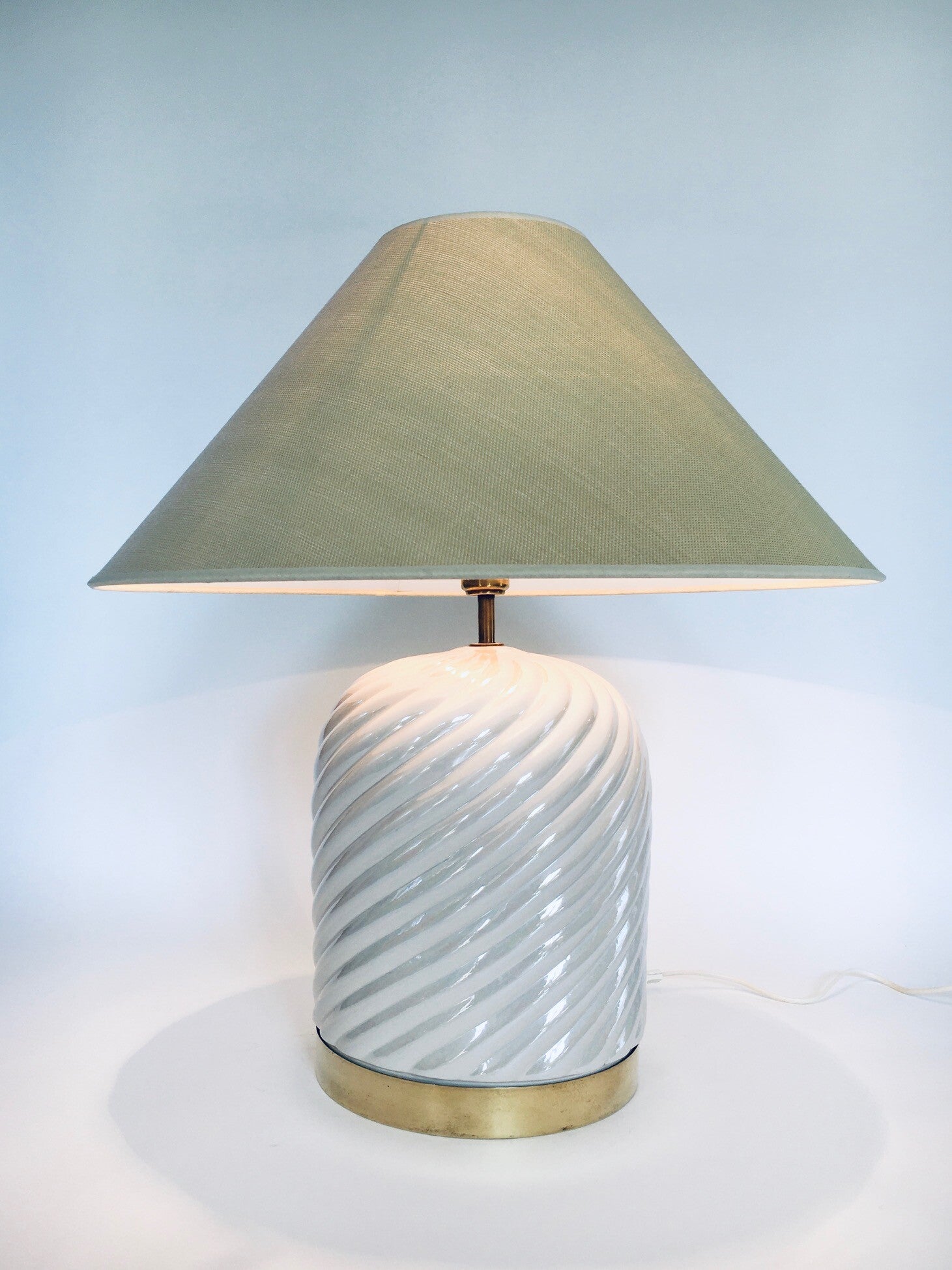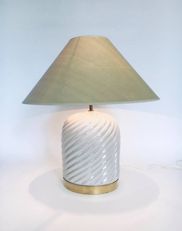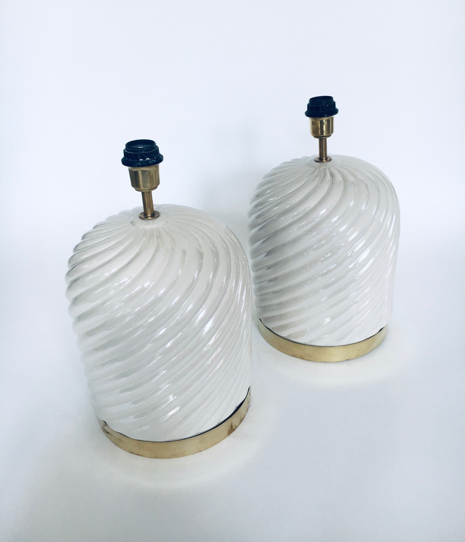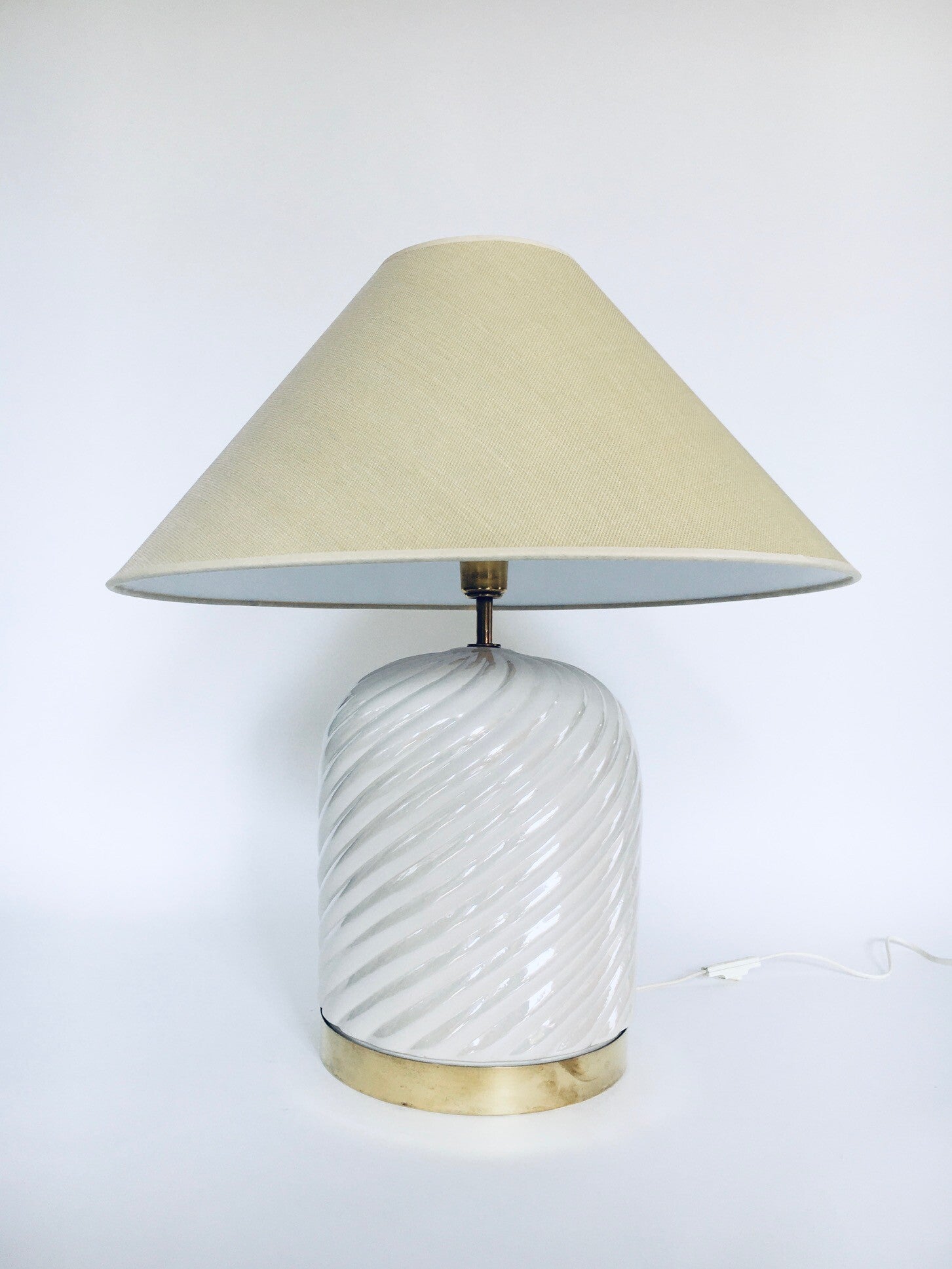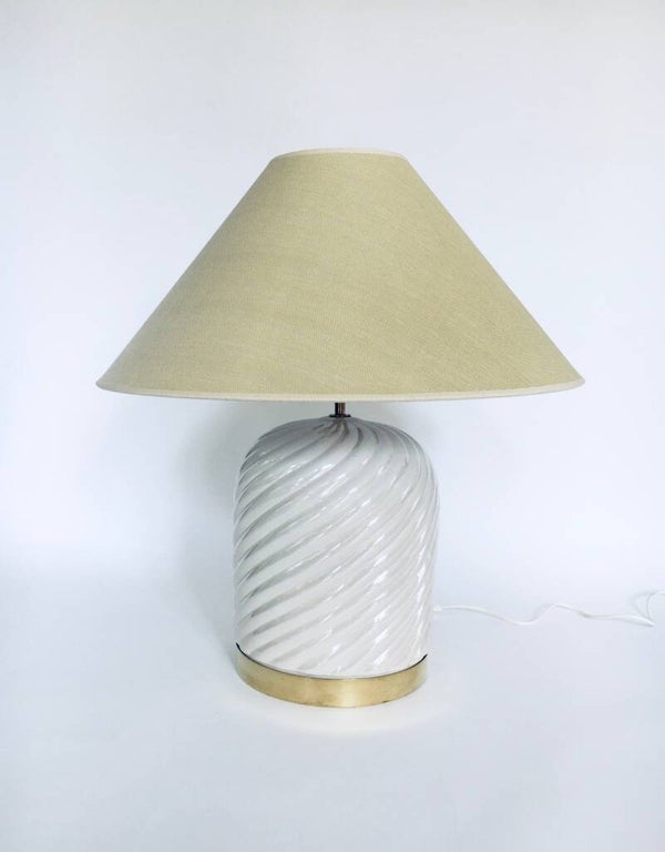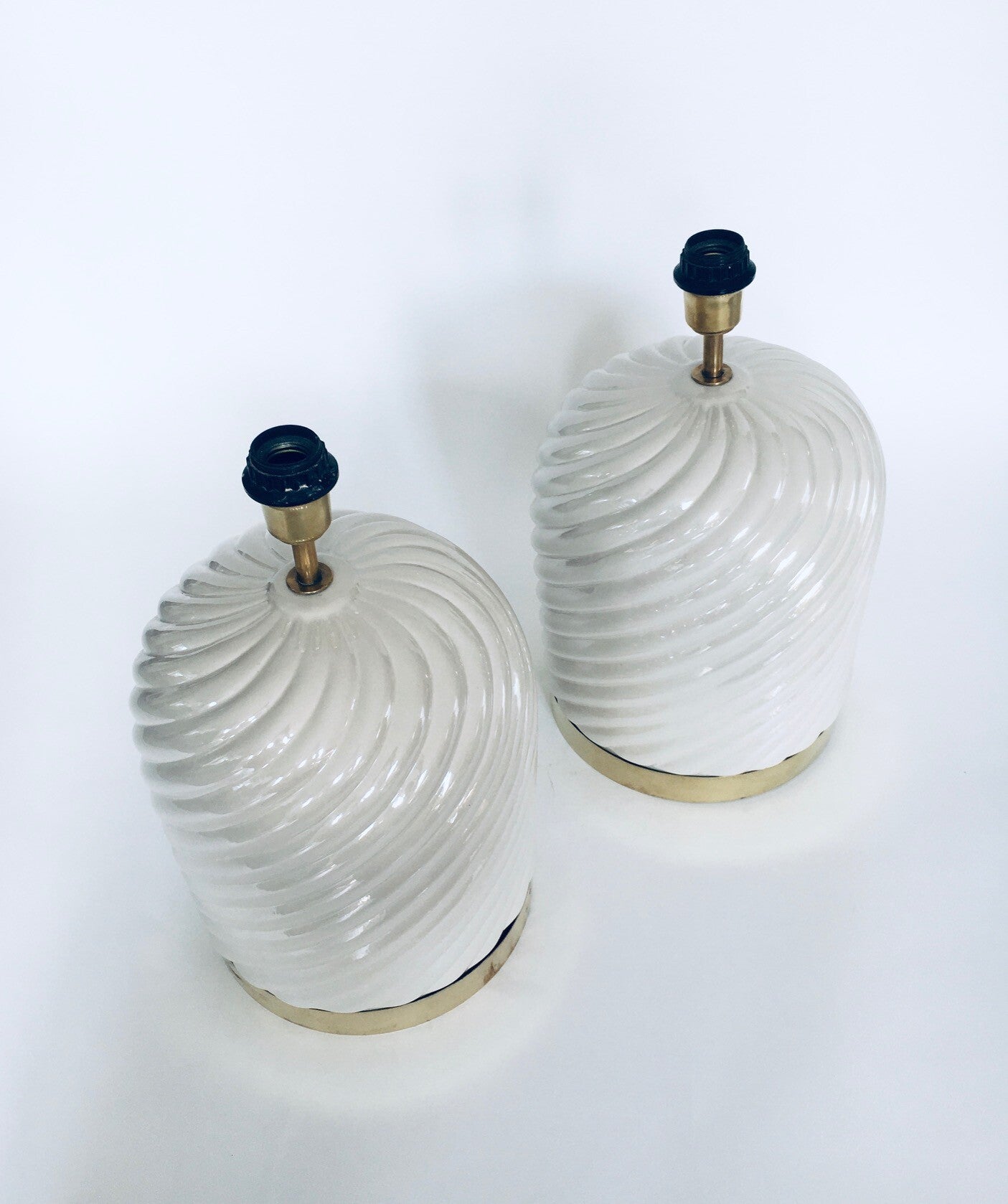 Vintage Hollywood Regency Style Italian Design Table Lamp Set by Tommaso Barbi, Italy 1970's. Ceramichi, Ceramic base with brass trim table or side board lamp with new lampshade. Whipcream twisted ceramic base in a creamy luster glaze. Majestic table lamp set. Both lamps are in very good condition. Each lamp measures 44cm x 26cm x 26cm. Including it's lampshade these measure 68cm x 60cm x 60cm.