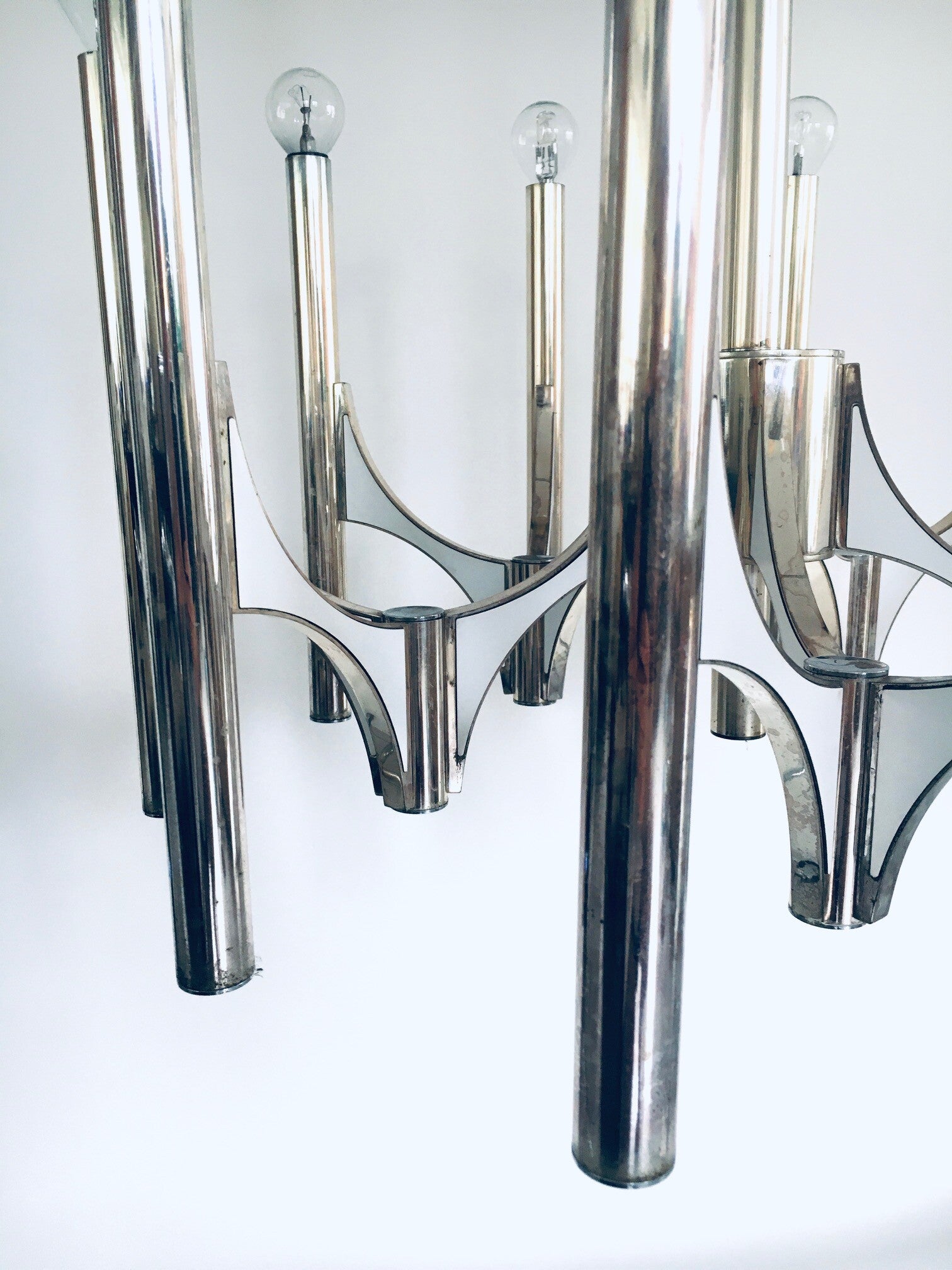 Vintage Midcentury Modern Italian Design chrome 10 lightpoint Chandelier designed by Gaetano Sciolari for Sciolari, Italy 1970's. Model 'orbit'. Chrome frame with white lacquered metal panels. The chandelier is in good condition. Tested and ready for use. The chandelier works with regular E14 screw light bulbs. Measures 70cm x 58cm x 58cm.