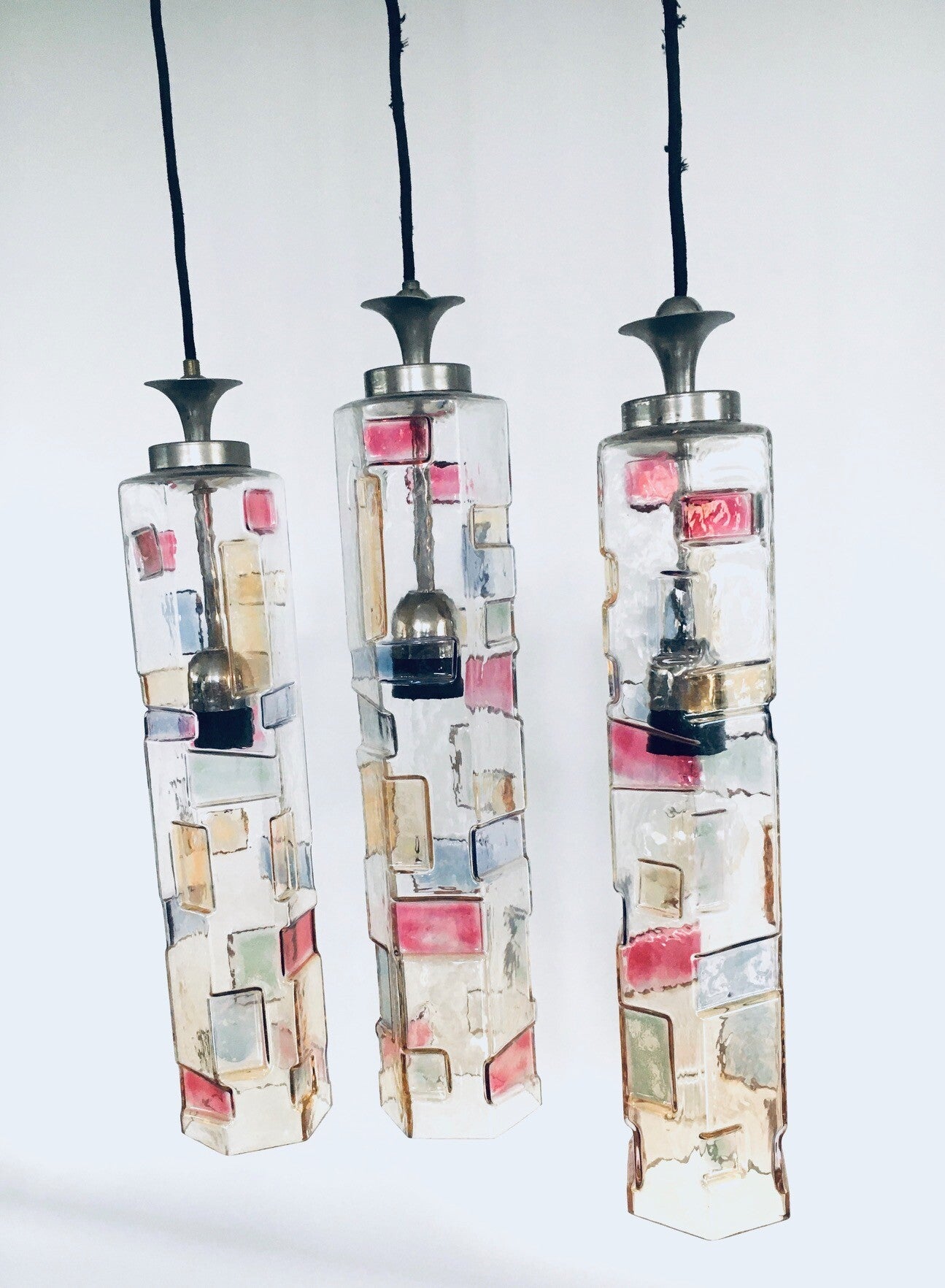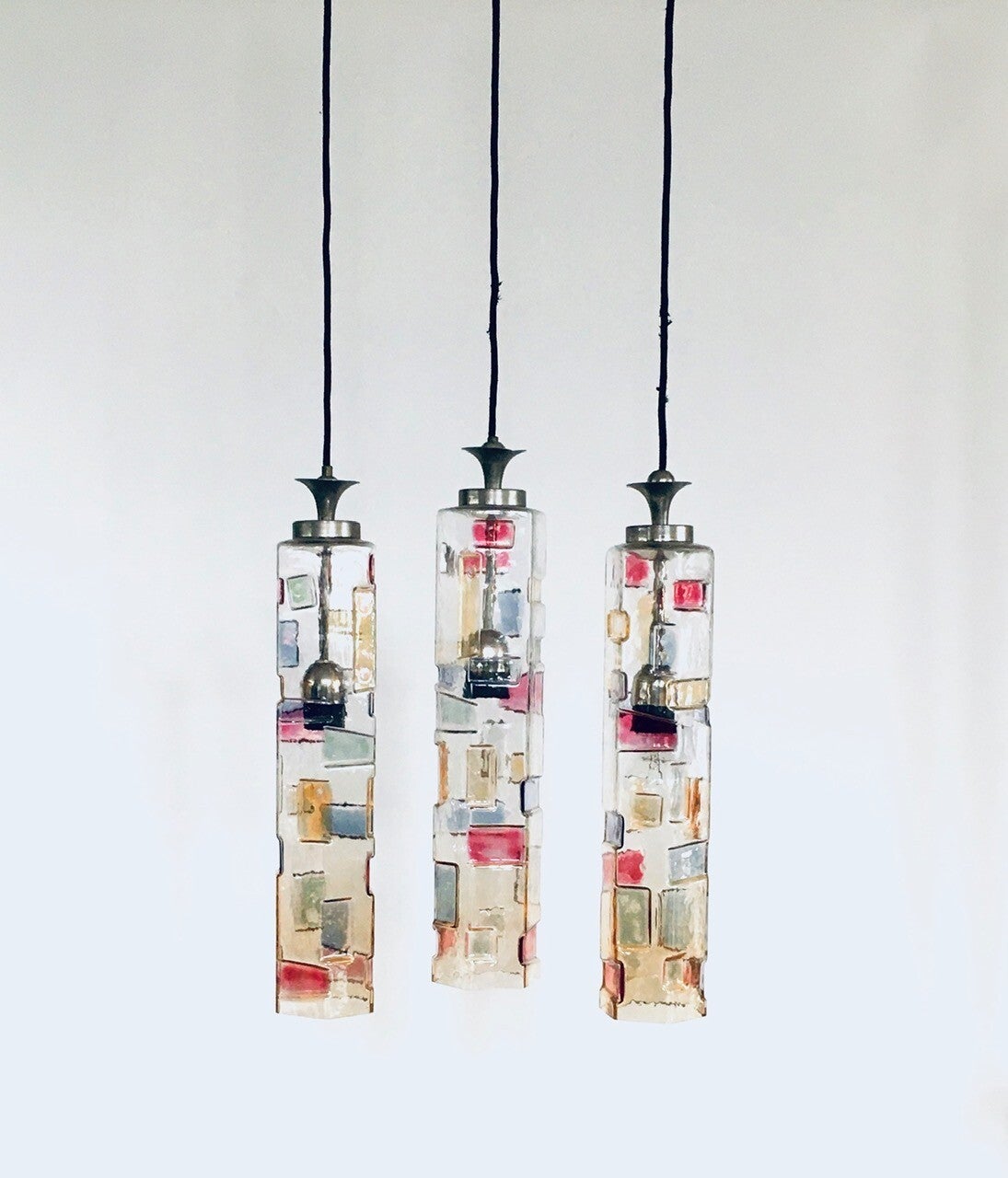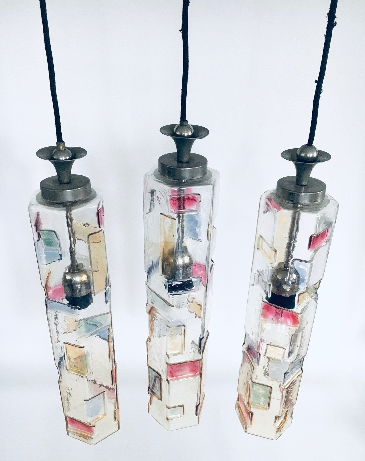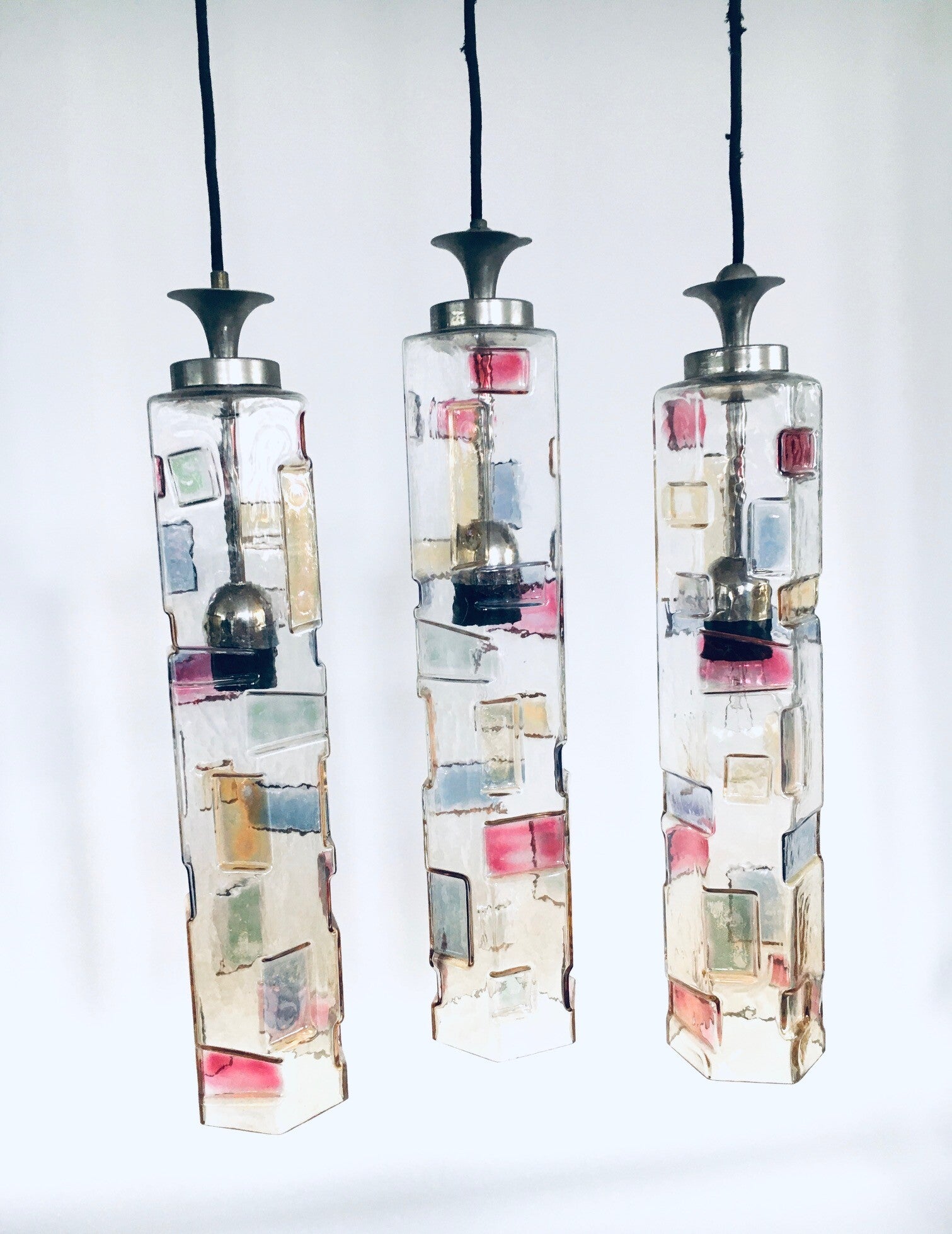 Vintage Midcentury Modern Italian Design Poliarte Colored Glass Pendant Lamp set of 3, Poliarte, Italy 1950's - 1955. Hexagonal glass tube. 3 Dimensional with colored patterns. Very RARE Lamps. 3 seperate hanging lamps. All original glass with original metal parts and wire. Tested and in working order. Each lamp measures 46,5cm x 9cm x 9cm.