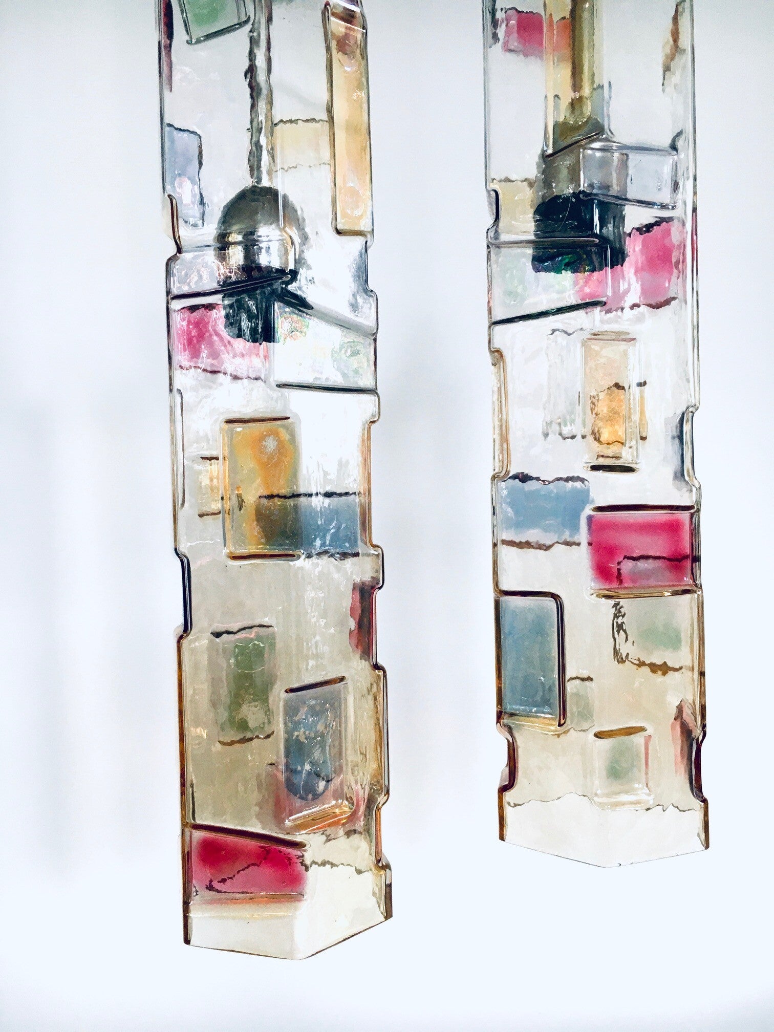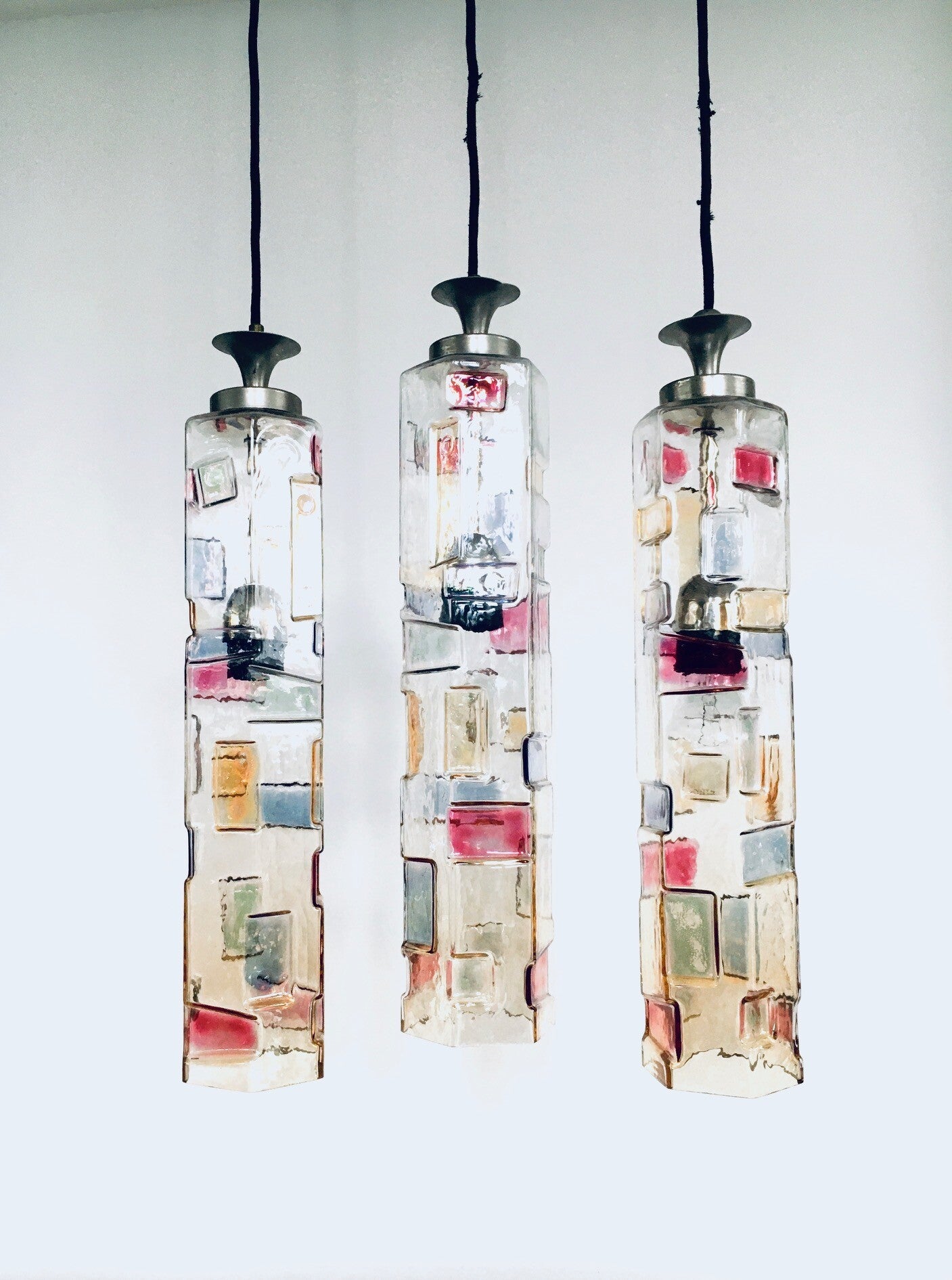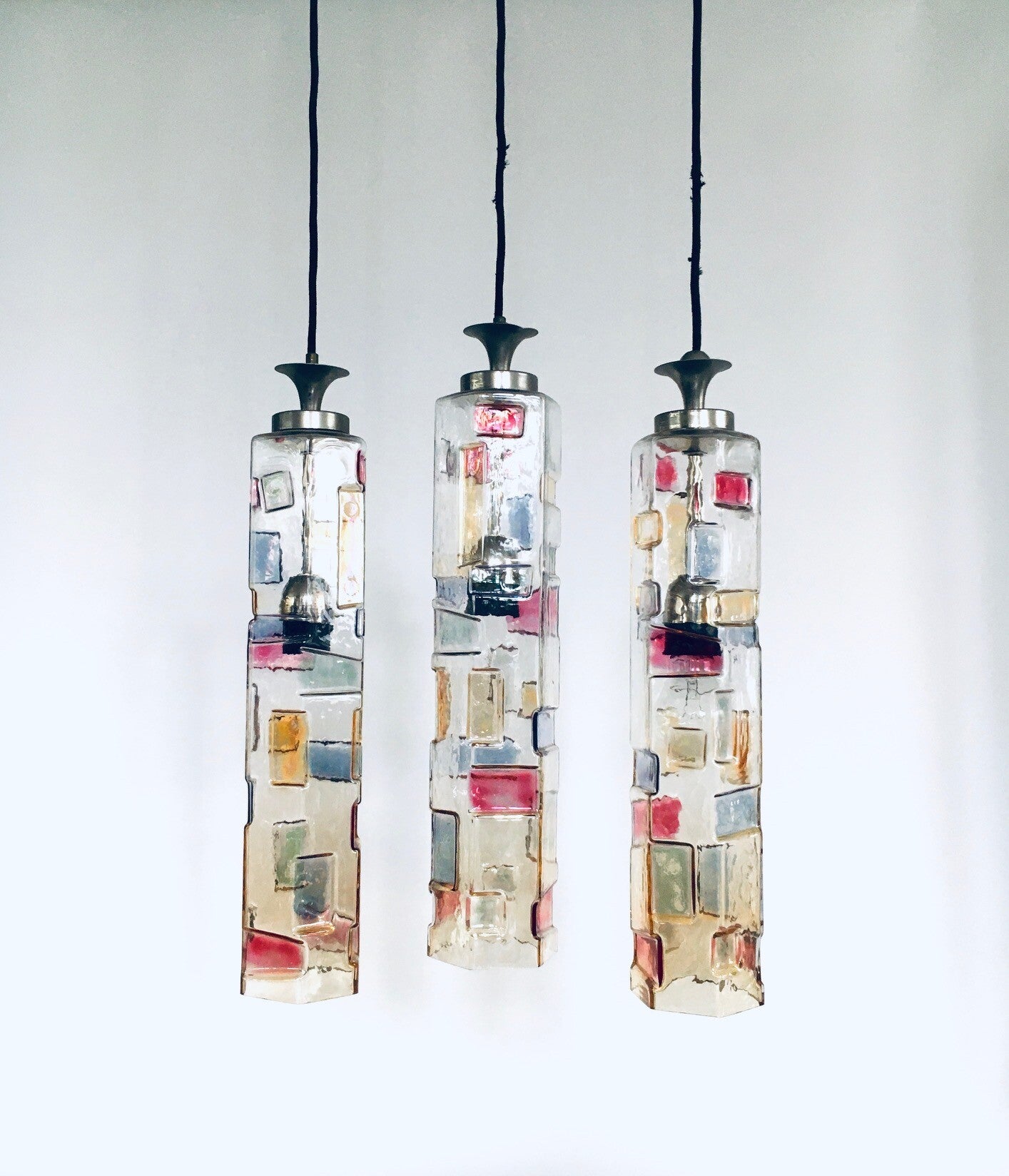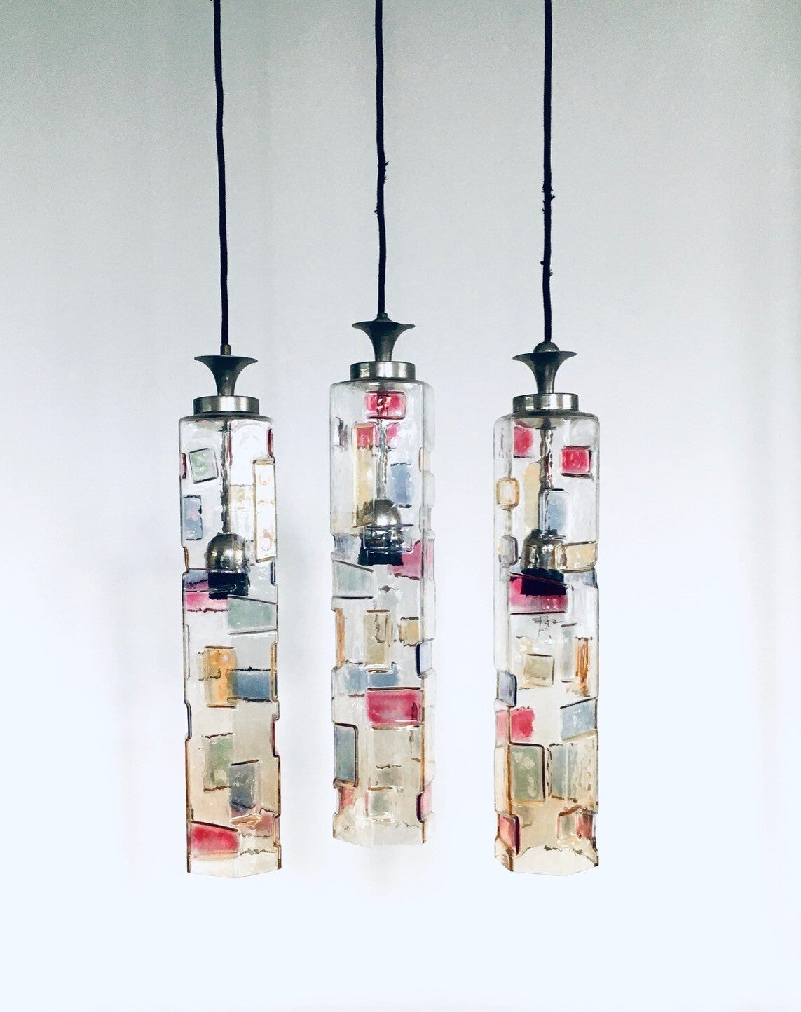 Vintage Midcentury Modern Italian Design Poliarte Colored Glass Pendant Lamp set of 3, Poliarte, Italy 1950's - 1955. Hexagonal glass tube. 3 Dimensional with colored patterns. Very RARE Lamps. 3 seperate hanging lamps. All original glass with original metal parts and wire. Tested and in working order. Each lamp measures 46,5cm x 9cm x 9cm.