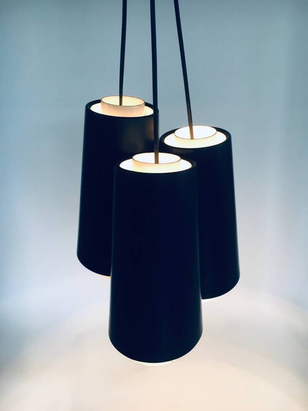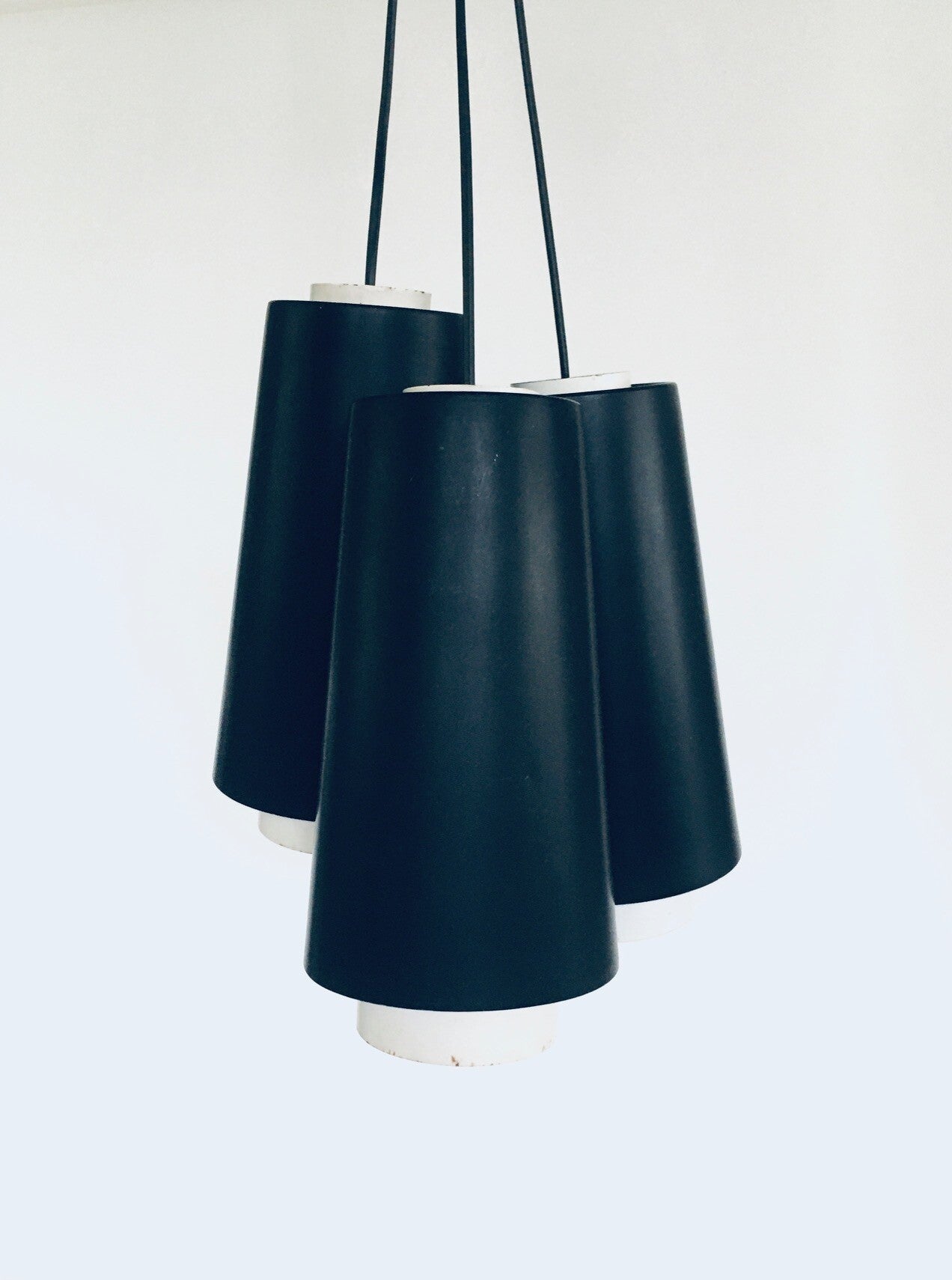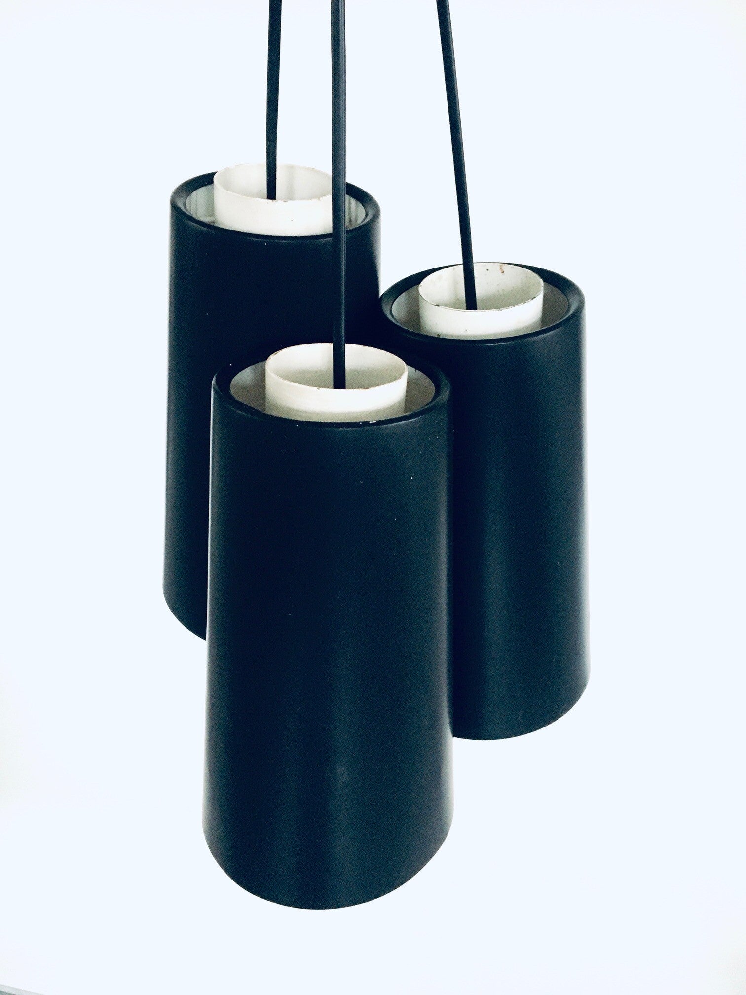 Vintage Midcentury Modern Dutch Design 3 Pendant Lamps by Raak Amsterdam, Holland 1960's. 3 Hanging lamps in black and white metal. Set up as one pendant lamp. All 3 lamps are in good condition with minor corrosion on the white metal parts. Black cone tube with white partial tube on top and bottom gives a very nice light up and down. Each lamp measures 29cm x 14cm x 14cm.