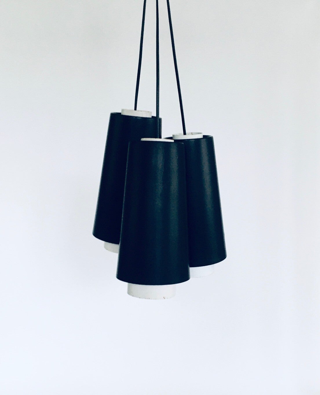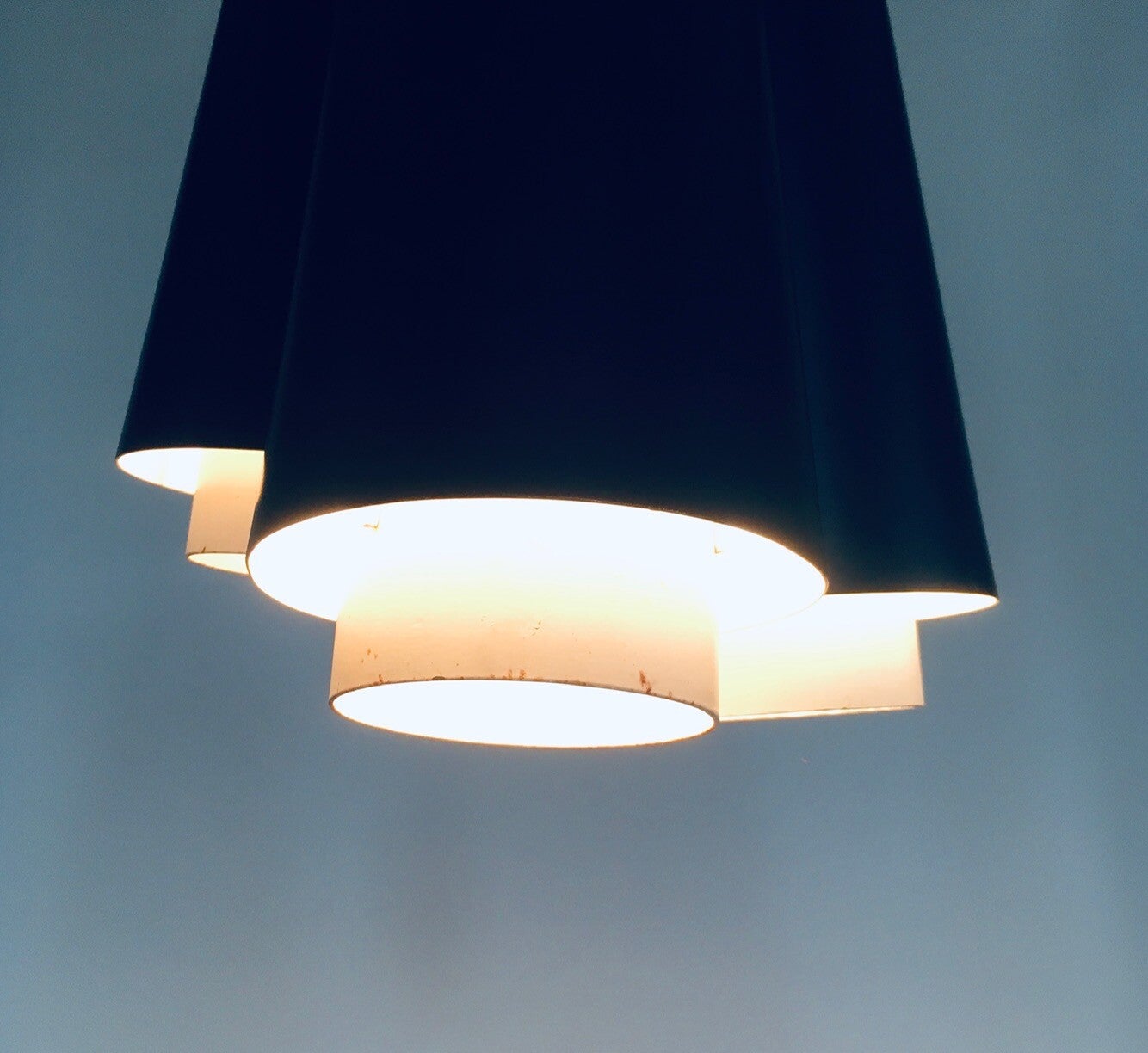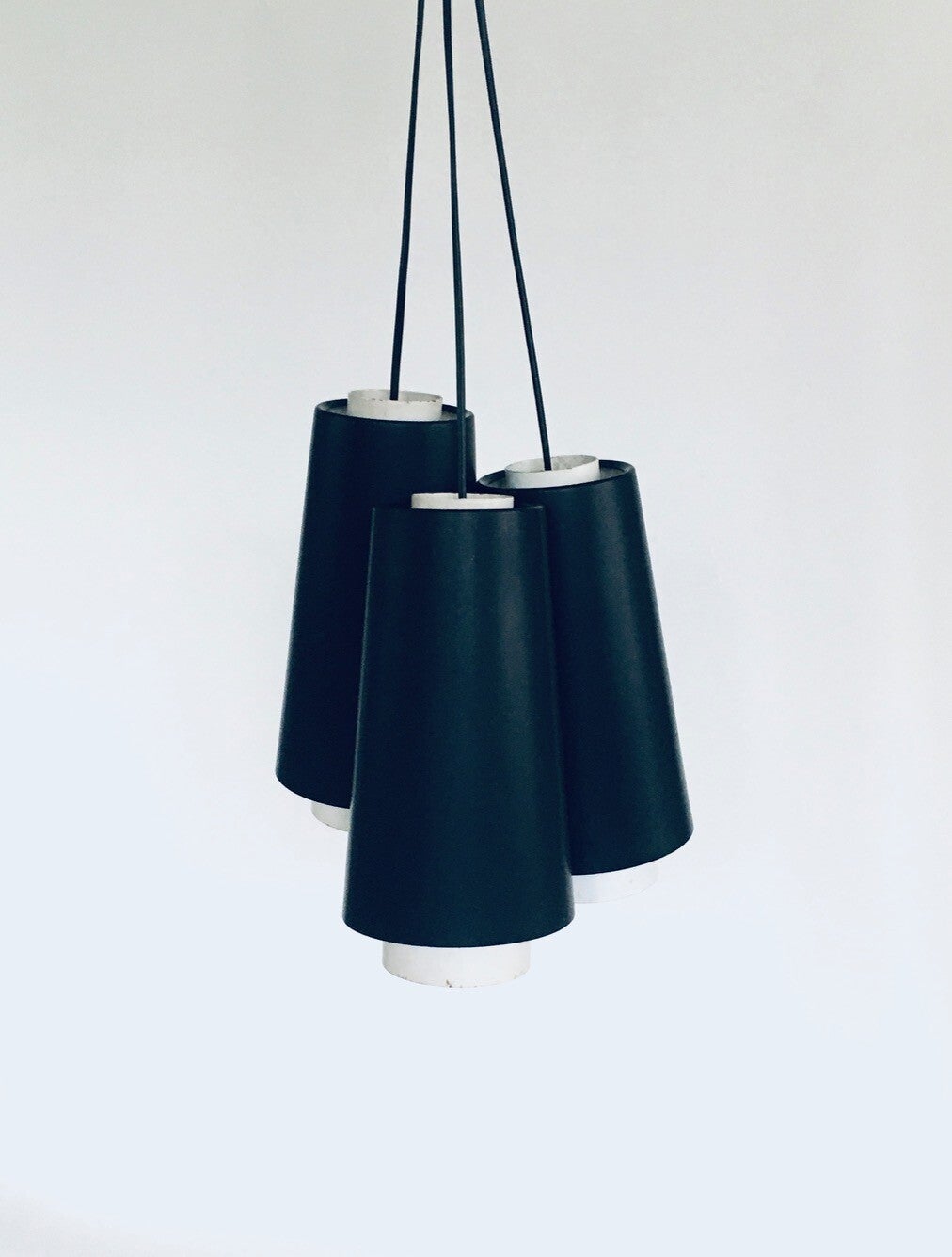 Vintage Midcentury Modern Dutch Design 3 Pendant Lamps by Raak Amsterdam, Holland 1960's. 3 Hanging lamps in black and white metal. Set up as one pendant lamp. All 3 lamps are in good condition with minor corrosion on the white metal parts. Black cone tube with white partial tube on top and bottom gives a very nice light up and down. Each lamp measures 29cm x 14cm x 14cm.