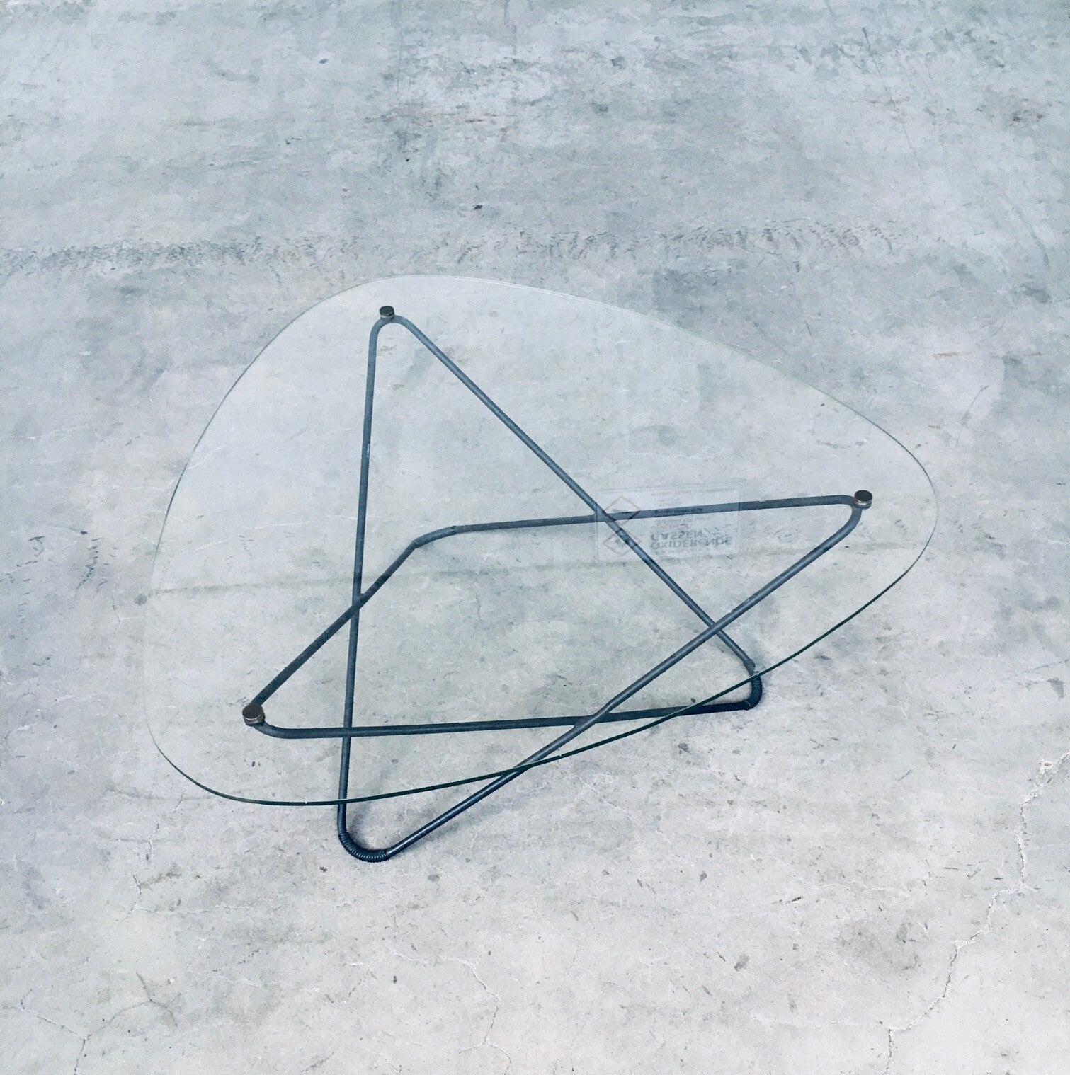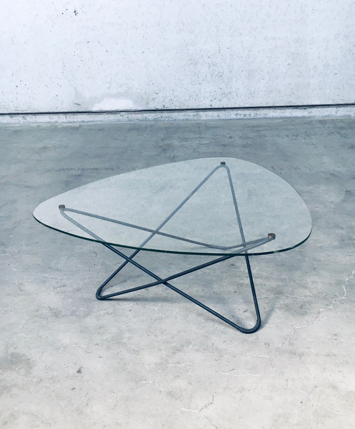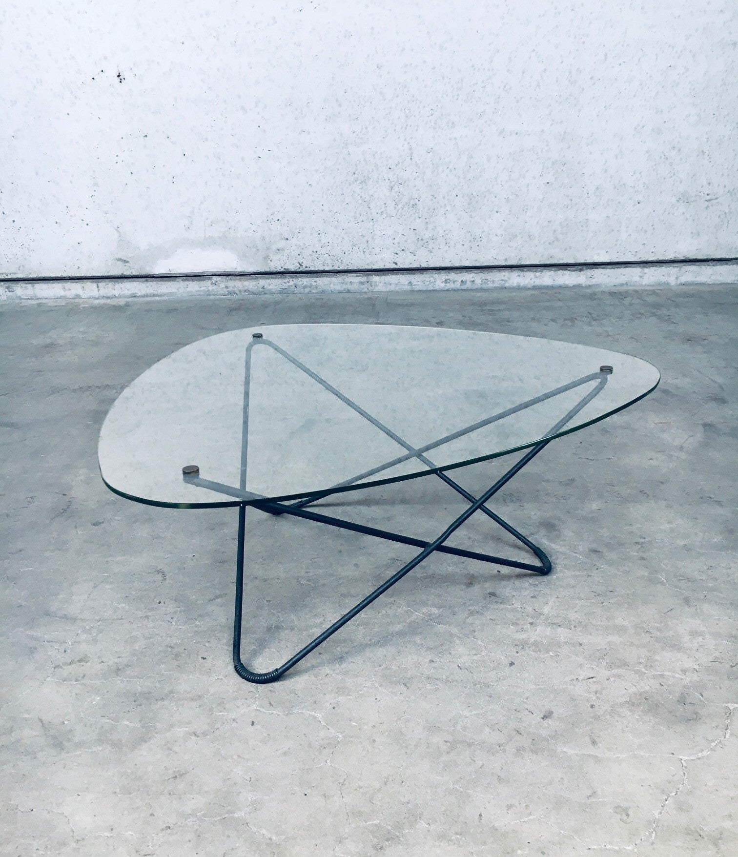 Vintage Midcentury Modern French Design Space Age 'JASMIN' Coffee Table by Florent Lasbleiz for Airborne, France 1954. Tubular structure in black laquered metal with clear handmade glass top and brass fittings to hold the glass top firm. Iconic design from the 1950's. Free form glass top has some minor edge chipping in 2 places. In overal very good original condition. Measures 86cm x 36,5cm x 86cm.