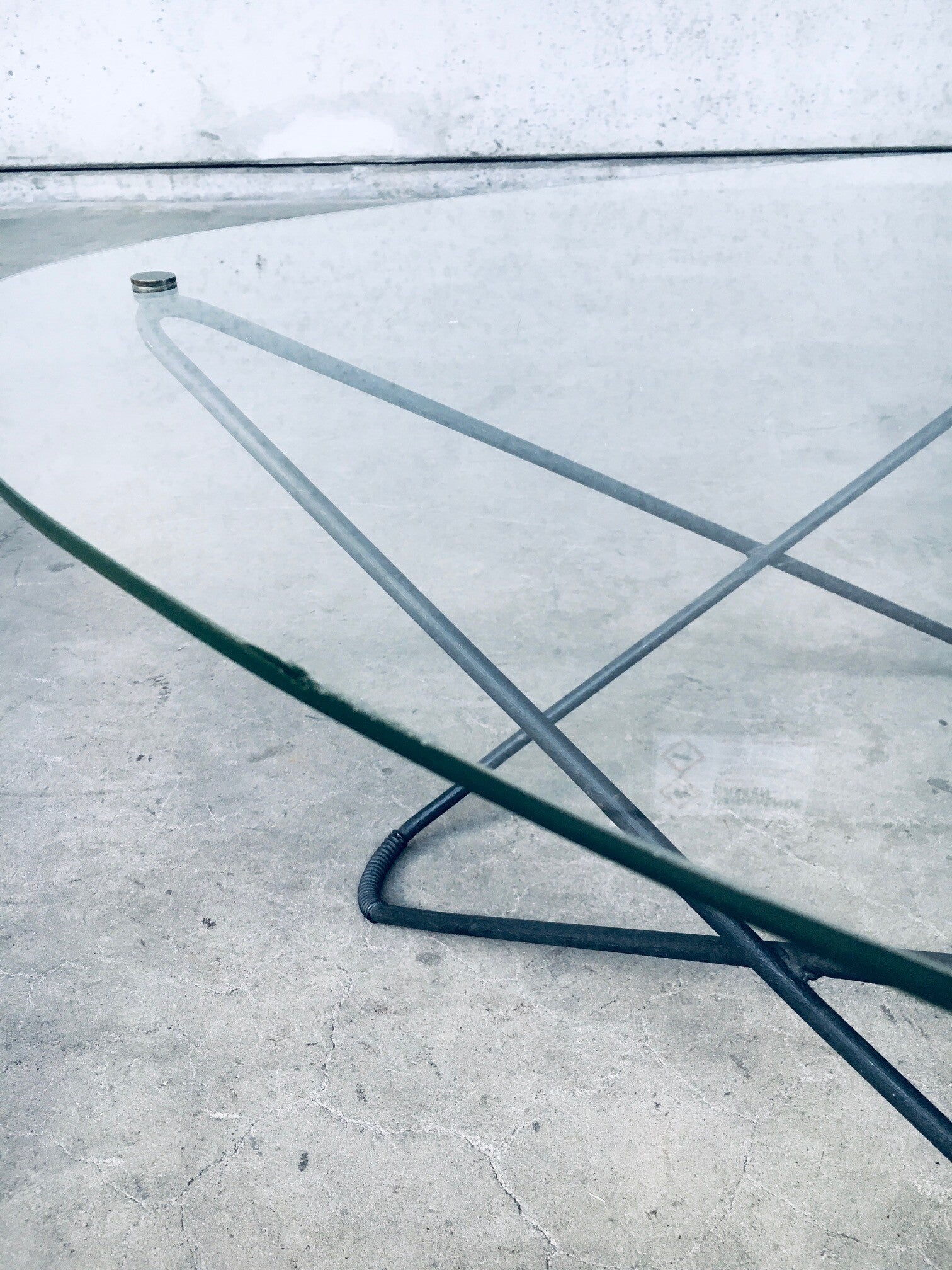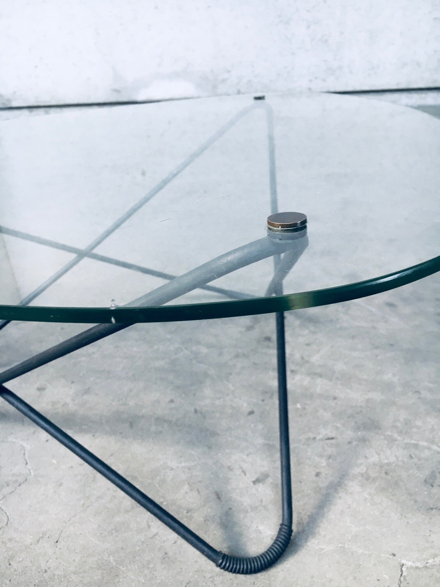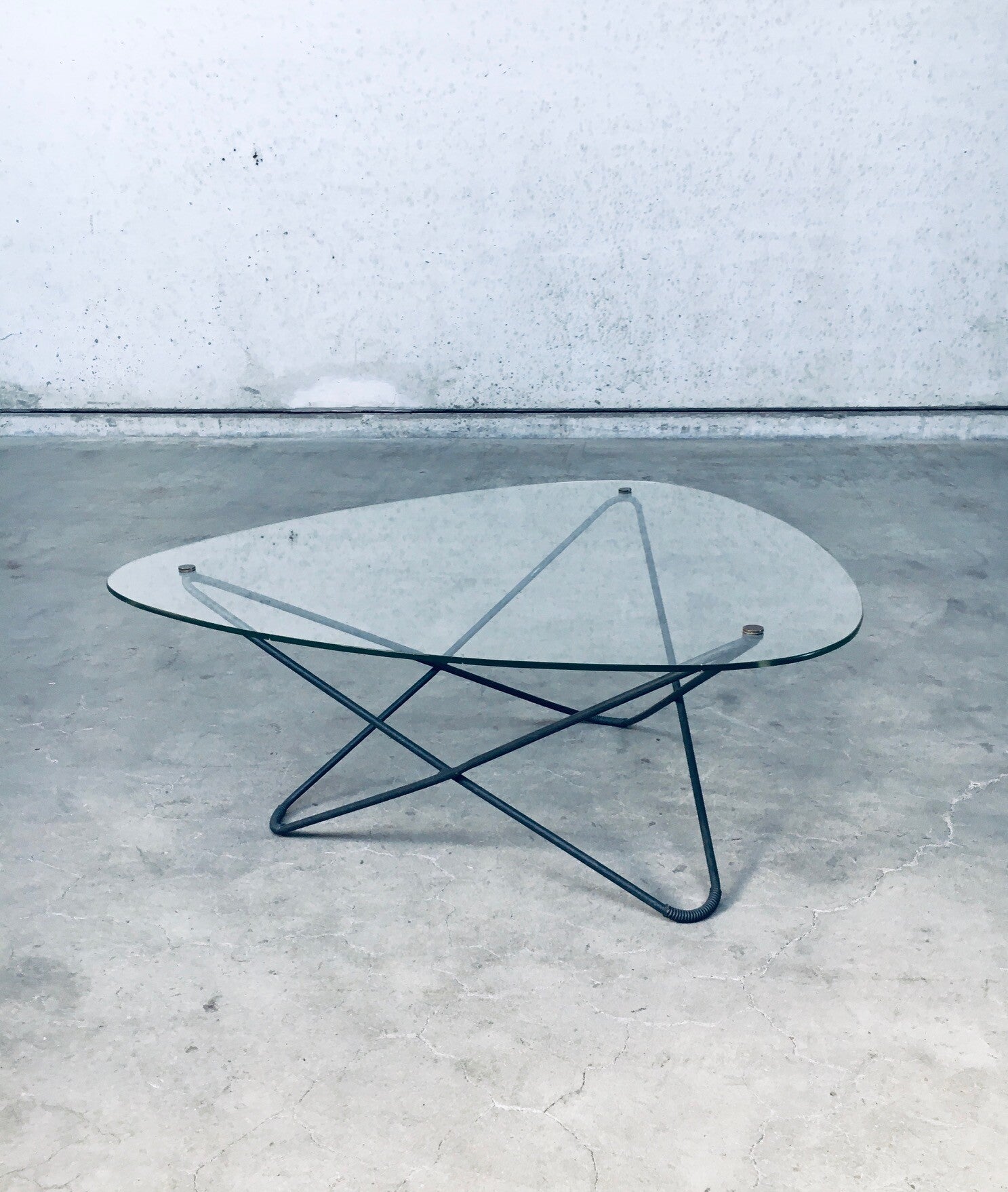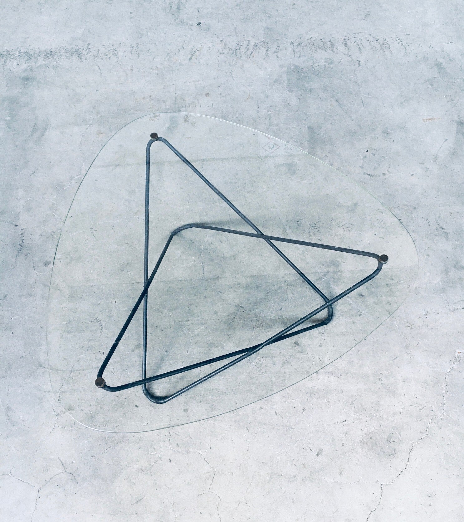 Vintage Midcentury Modern French Design Space Age 'JASMIN' Coffee Table by Florent Lasbleiz for Airborne, France 1954. Tubular structure in black laquered metal with clear handmade glass top and brass fittings to hold the glass top firm. Iconic design from the 1950's. Free form glass top has some minor edge chipping in 2 places. In overal very good original condition. Measures 86cm x 36,5cm x 86cm.
