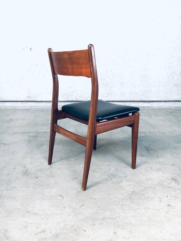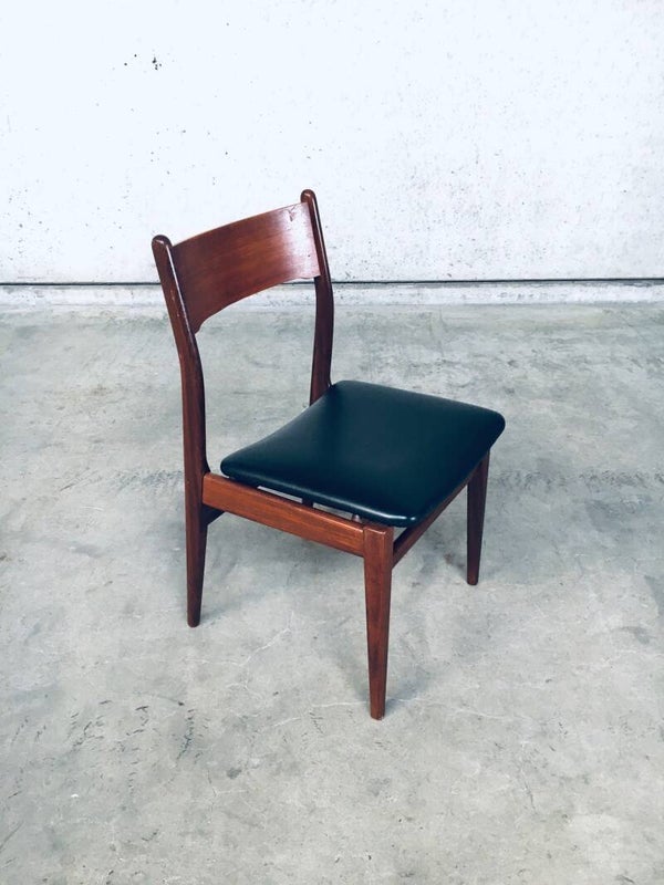 Vintage Midcentury Modern Scandinavian Design Teak dining chair set of 4. Made in the 1960's. Teak wooden frame with bend plywood back rest & black leatherlook seat. Well constructed chairs in very good condition. Small blemishes on black leatherette. Each chair measures 46cm x 82,5cm x 50cm.
