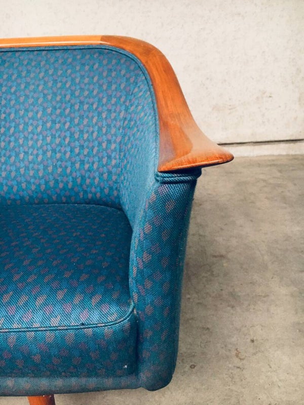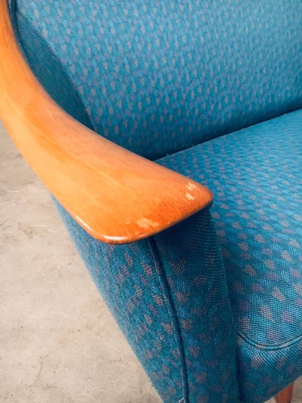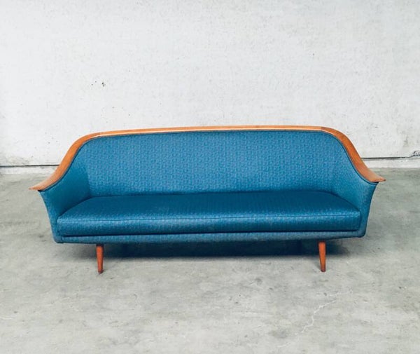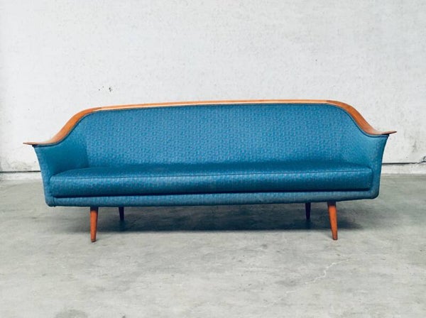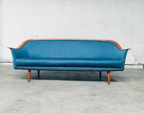 Vintage Midcentury Modern Scandinavian Design 3 Seat Sofa by Dux, Denmark 1960's. Teak wood formed and bend arm and back top rest with a more recent 1980's blue fabric on 4 legs. This 3 seat sofa has been reupholstered in the late 1980's by it's previous owners. Very well done. Fabric has some staining on the bottom at the sides. In overal very good condition. Measures 205cm x 81cm x 73cm.