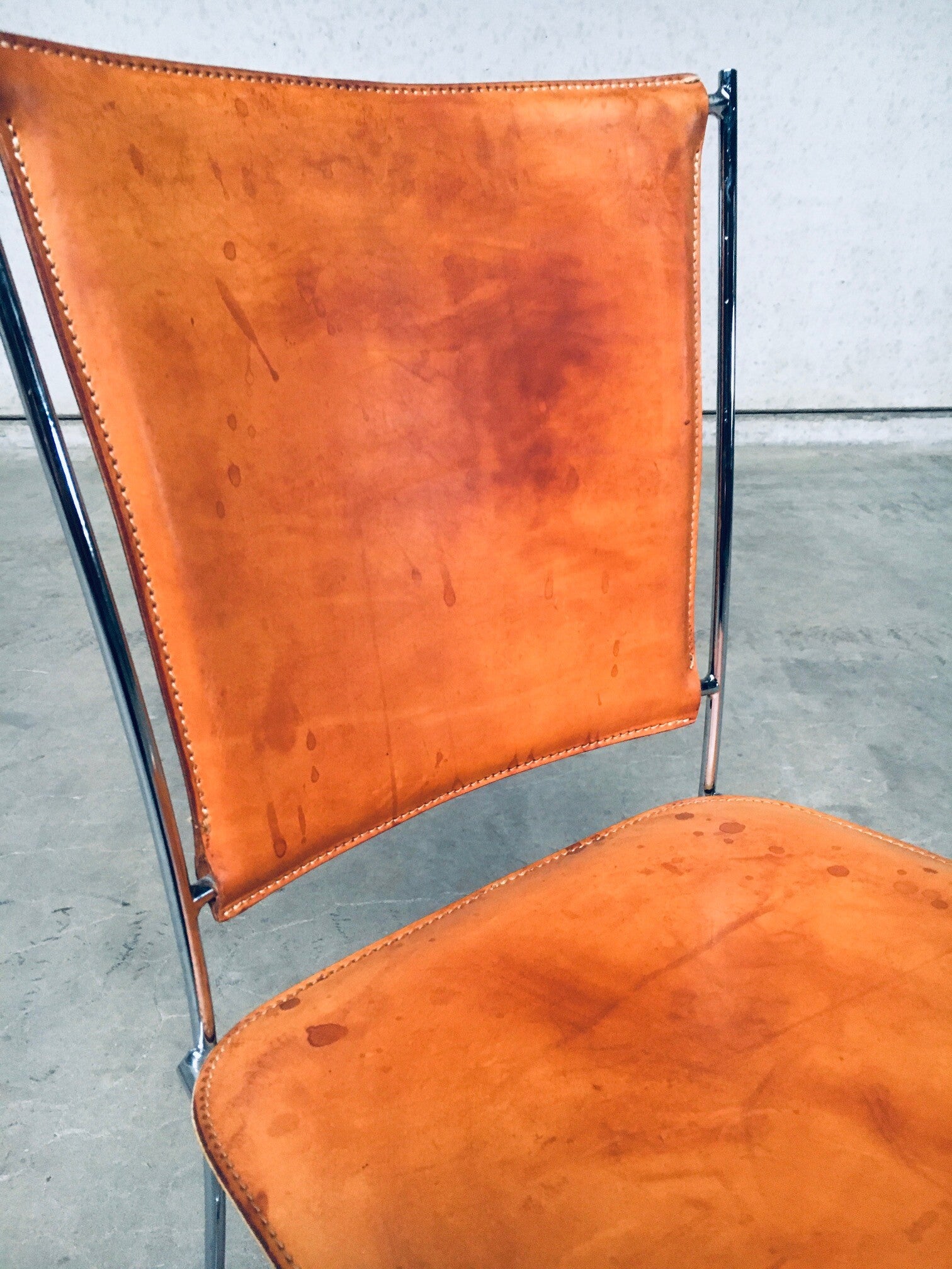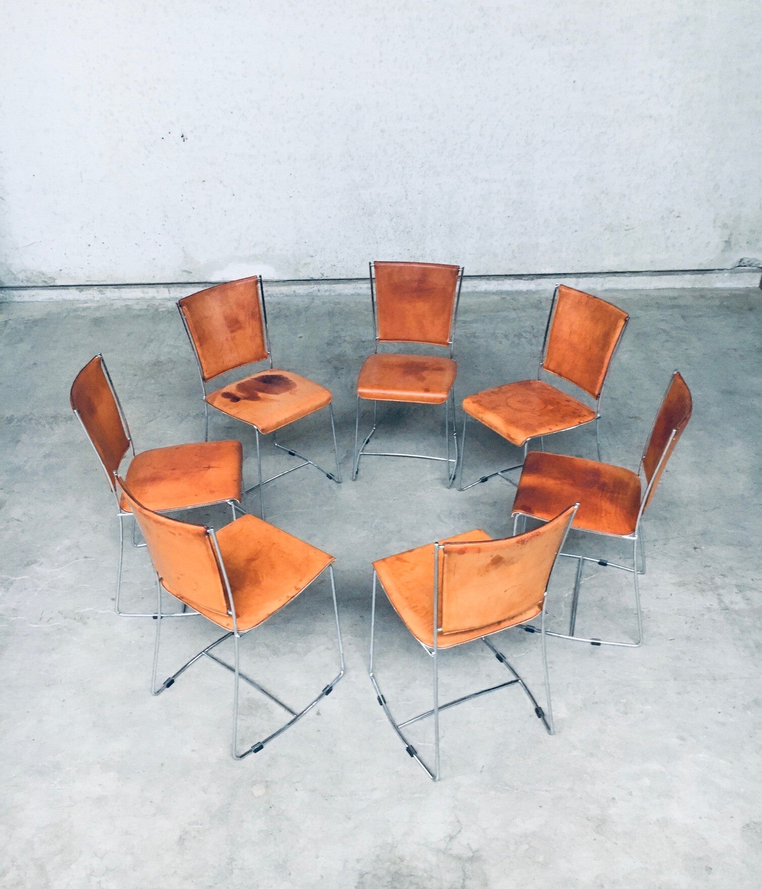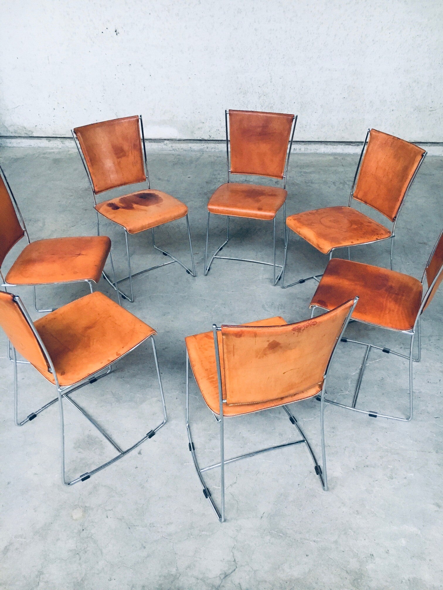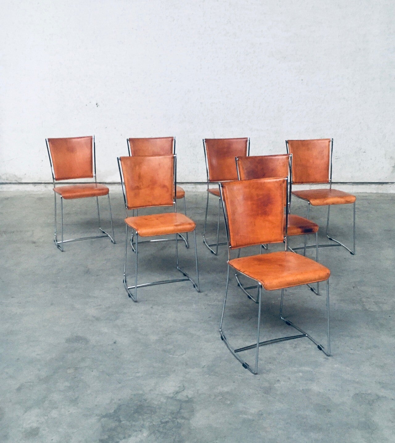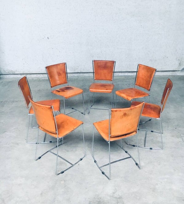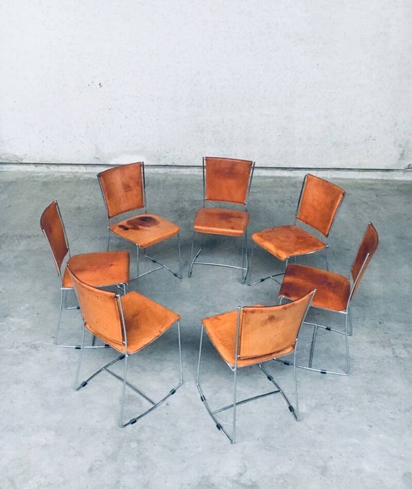 Vintage Postmodern Italian Design Natural Leather Dining Chair set by Segis, Italy 1990's. Thick natural leather on chrome metal frame. Well patinated natural leather from it's age and use. Beautiful in their form and minimalist design. The patina gives these chairs an extra dimension. You can imagine their lives and stories. All are in very good original condition. Each chair measures 41cm x 84cm x 41cm.