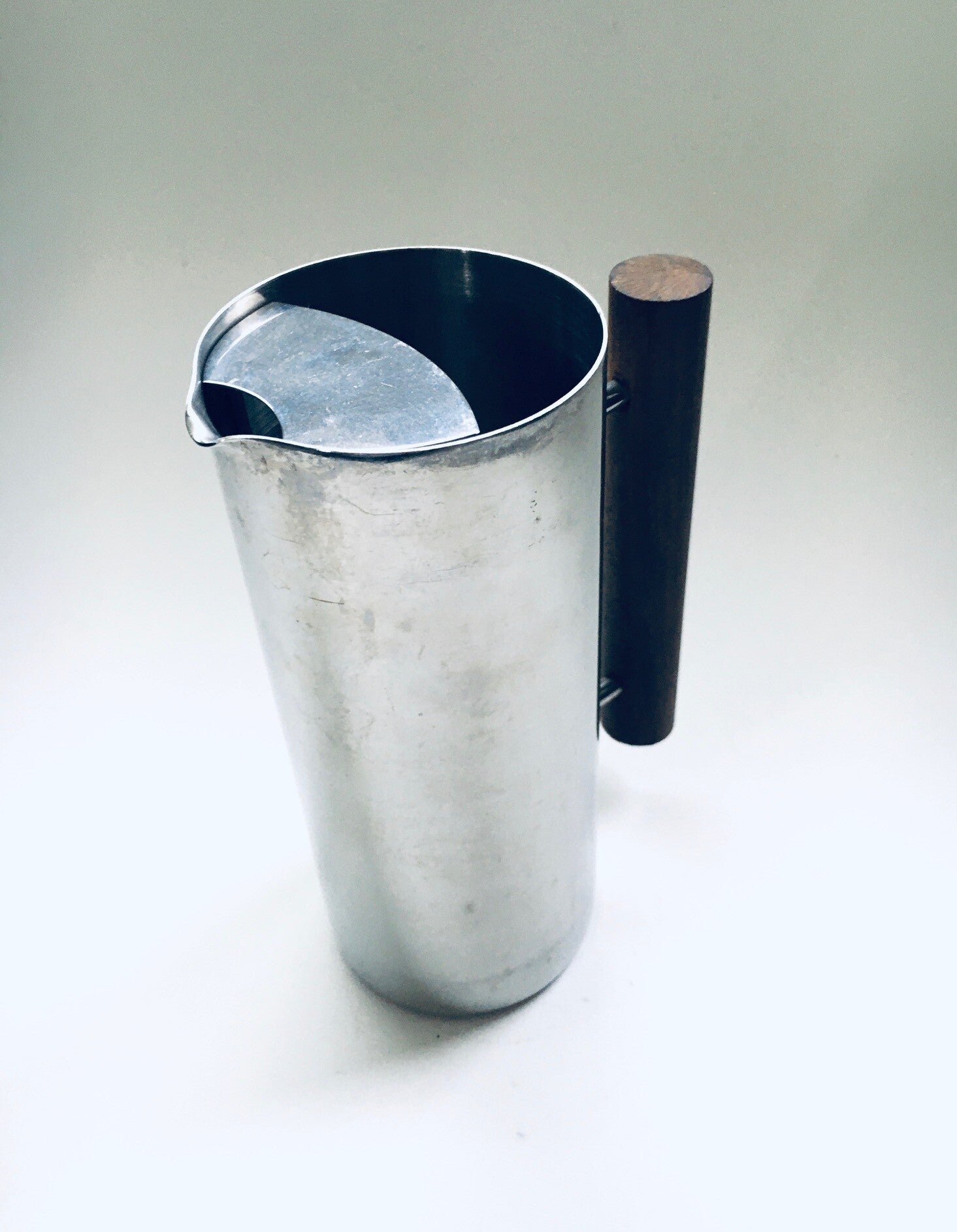 Vintage 'Art de la Table' Design Coffee & Tea Pot by Guy Degrenne, France 1980's. Caraffe, decanter, jugg, pot in Inox metal with Wengé wood handle. One has a strainer. Both are in very good original condition. Each measures 20cm x 13,5cm x 8,5cm.