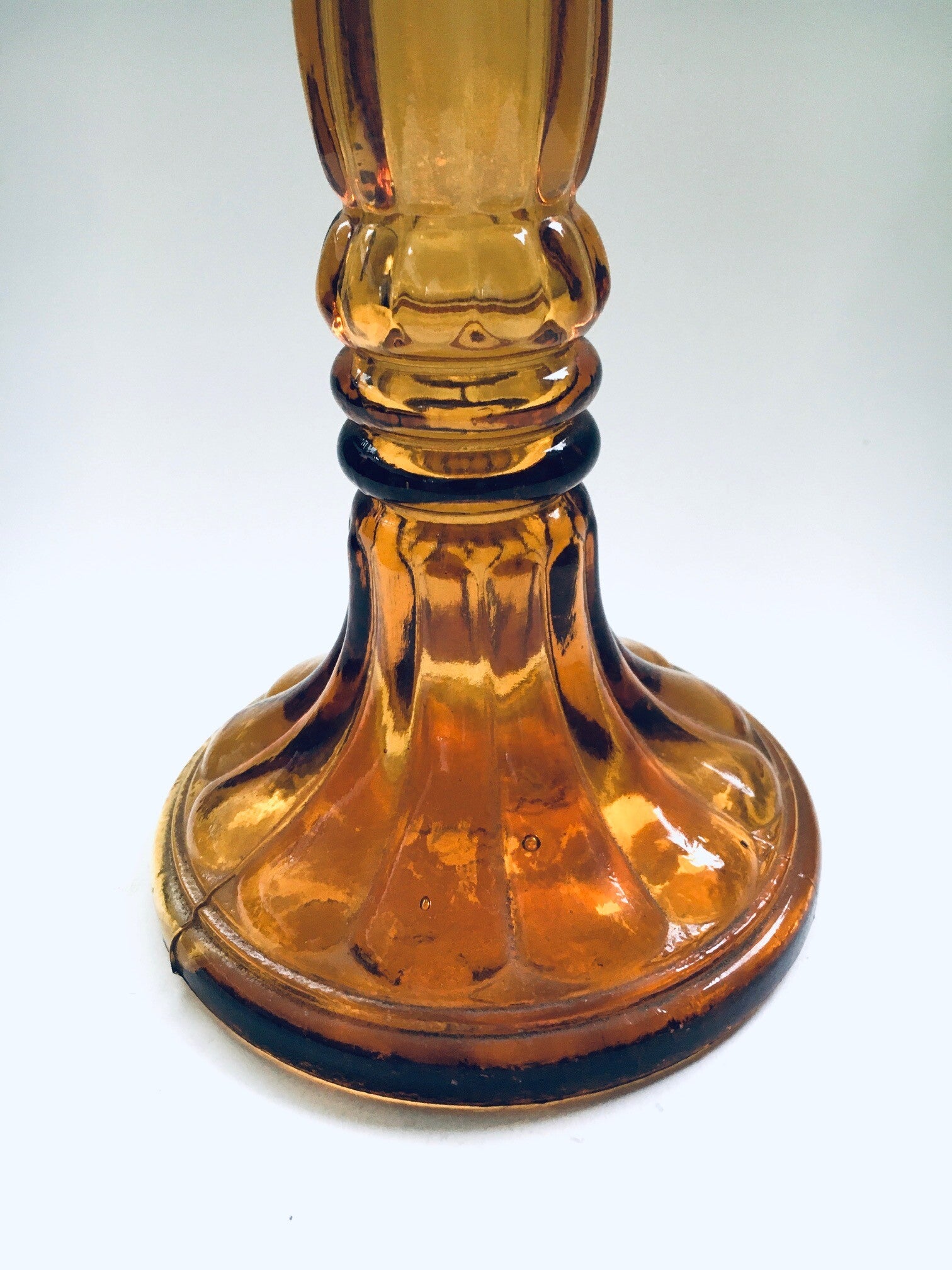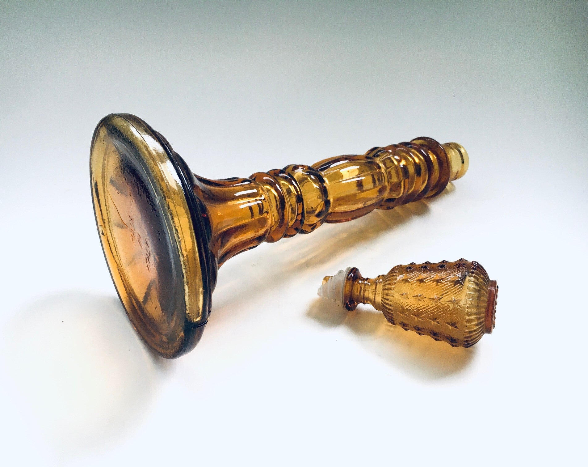Vintage Midcentury Modern Italian Design Empoli Amber Glass Decanter Bottle with stopper, Murano Italy 1960's. Amber Glass bottle with original stopper, stamped Made in Italy. In very good condition. Stopper has some of it's plastic rings broken, so doesn't close that good any more. Measures 36cm x 13,5cm x 13,5cm.