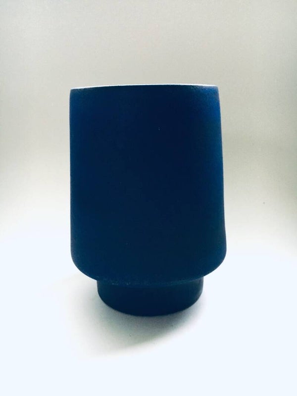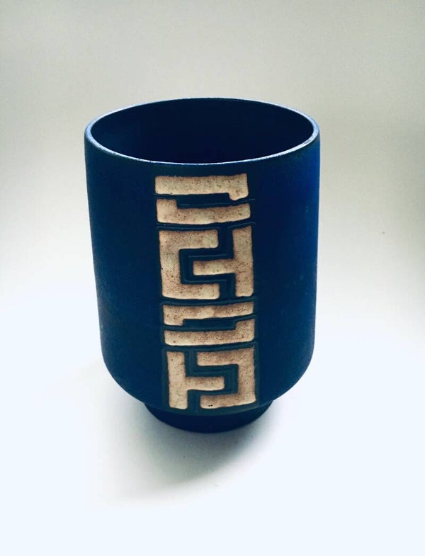 Vintage Midcentury Modern German Design Art Studio Pottery Vase, made in West Germany 1960's. Model 808-3. Blue matt glazed clay with brown, cream abstract motif design. In very good condition. Measures 23,7cm x 19cm x 19cm.