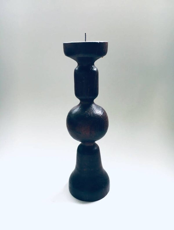 Vintage Brutalist Design Handcrafted Wooden Candle Stick Holders, Made in Spain 1960's. Set of 3 different models and sizes. Turned, carved and dark stained hard wood. One with original sticker. Each in very good original condition. Tall one measures 31,5cm x 9,5cm x 9,5cm. Small model measures 18cm x 7,5cm x 7,5cm. Smallest one measures 17cm x 7,5cm x 7,5cm.
