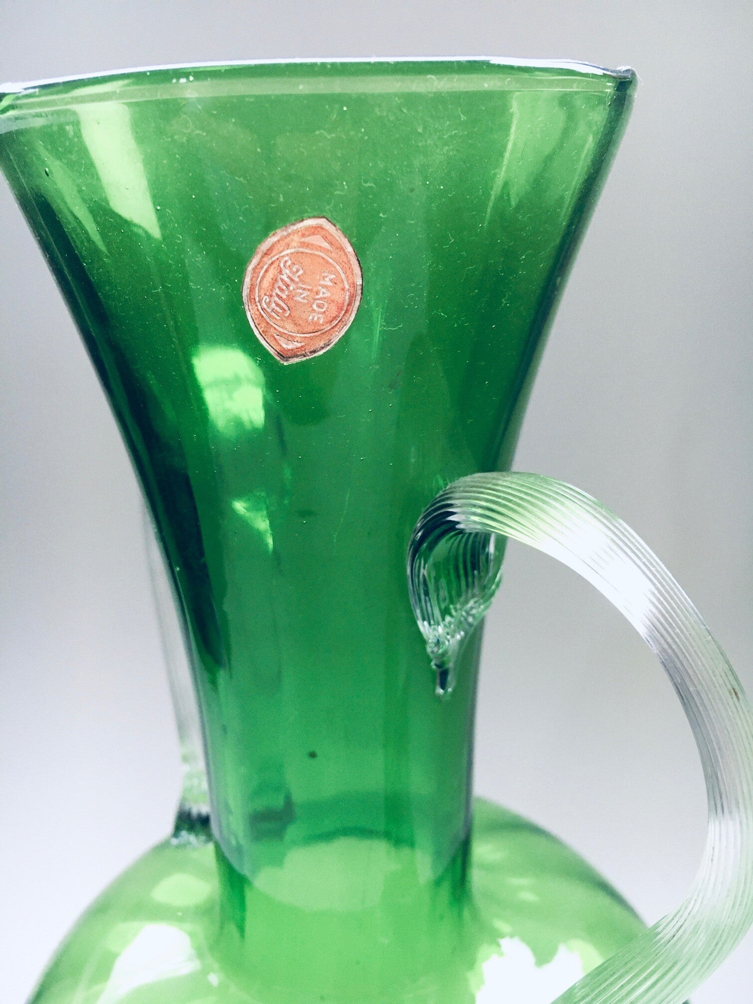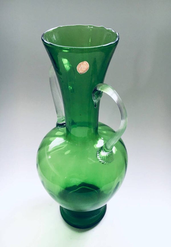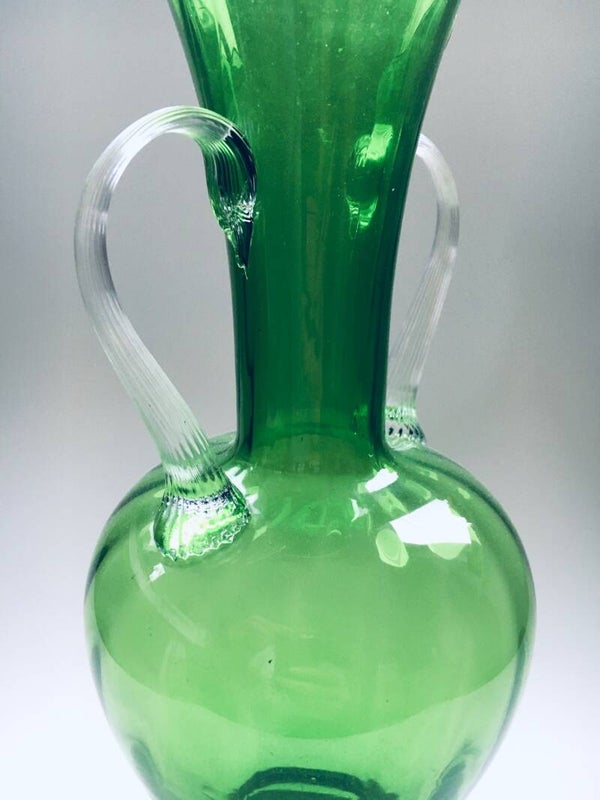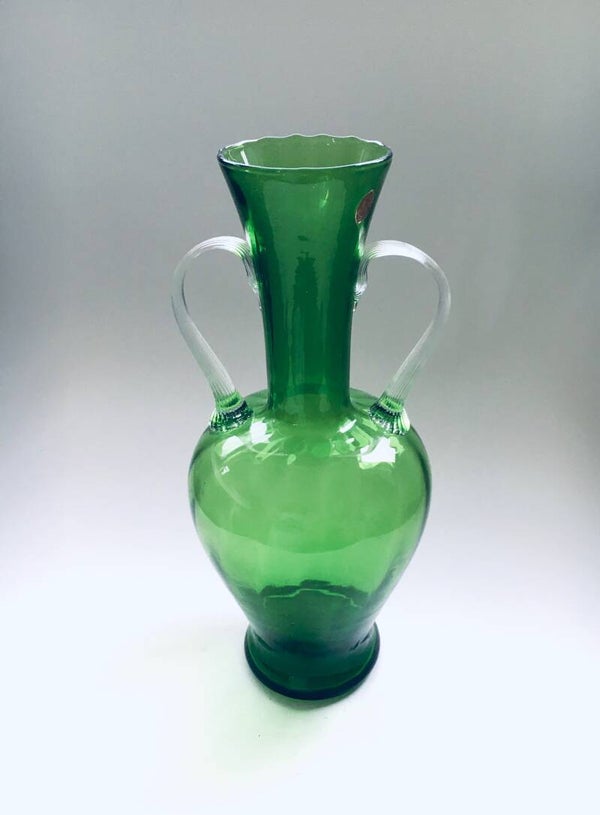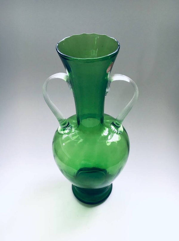 Vintage Midcentury Murano Glass Amphora Vase, Italy 1950's. Green glass vase with clear glass handles. Has original label. In very good condition. Measures 34,5cm x 15cm x 15cm.