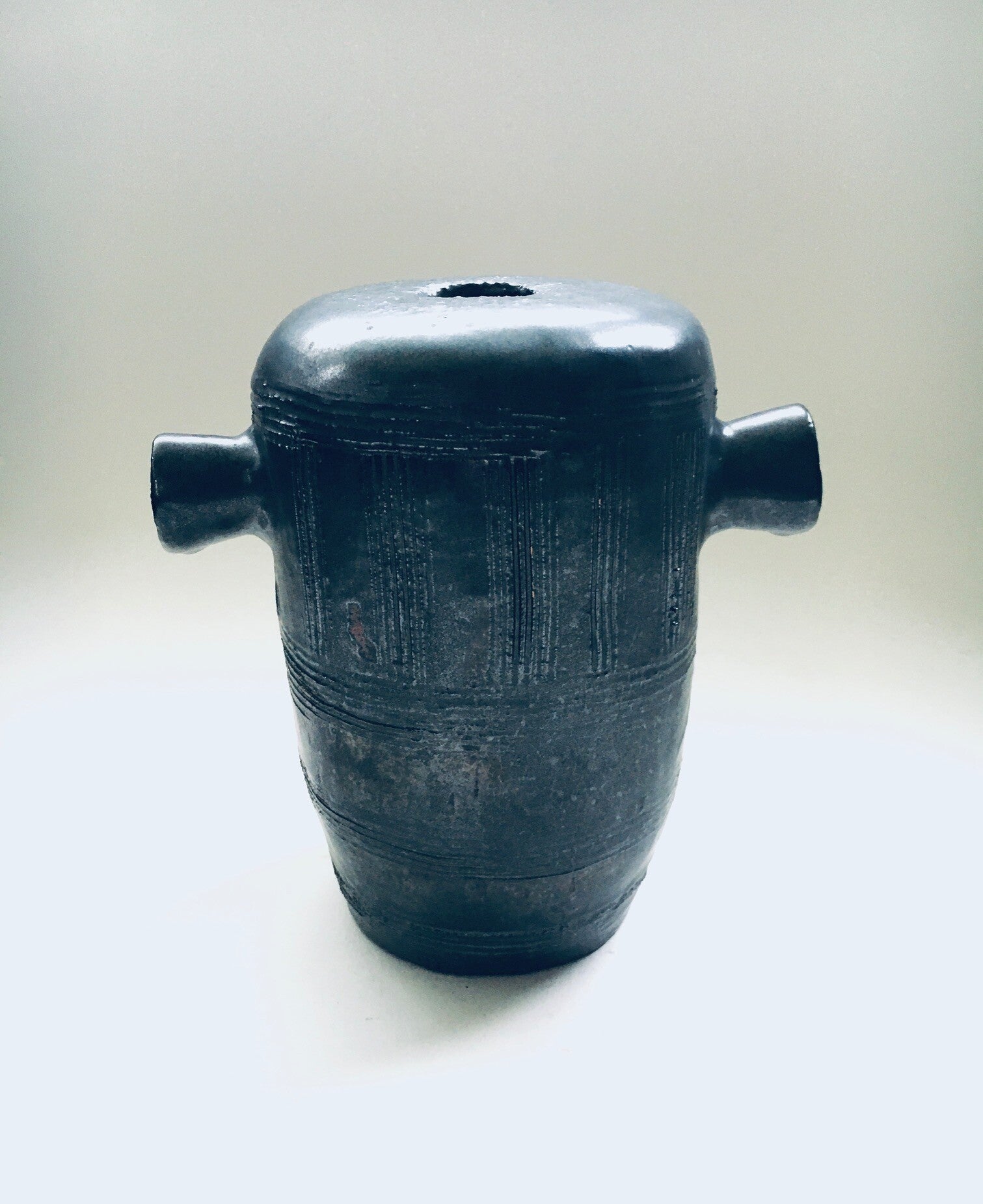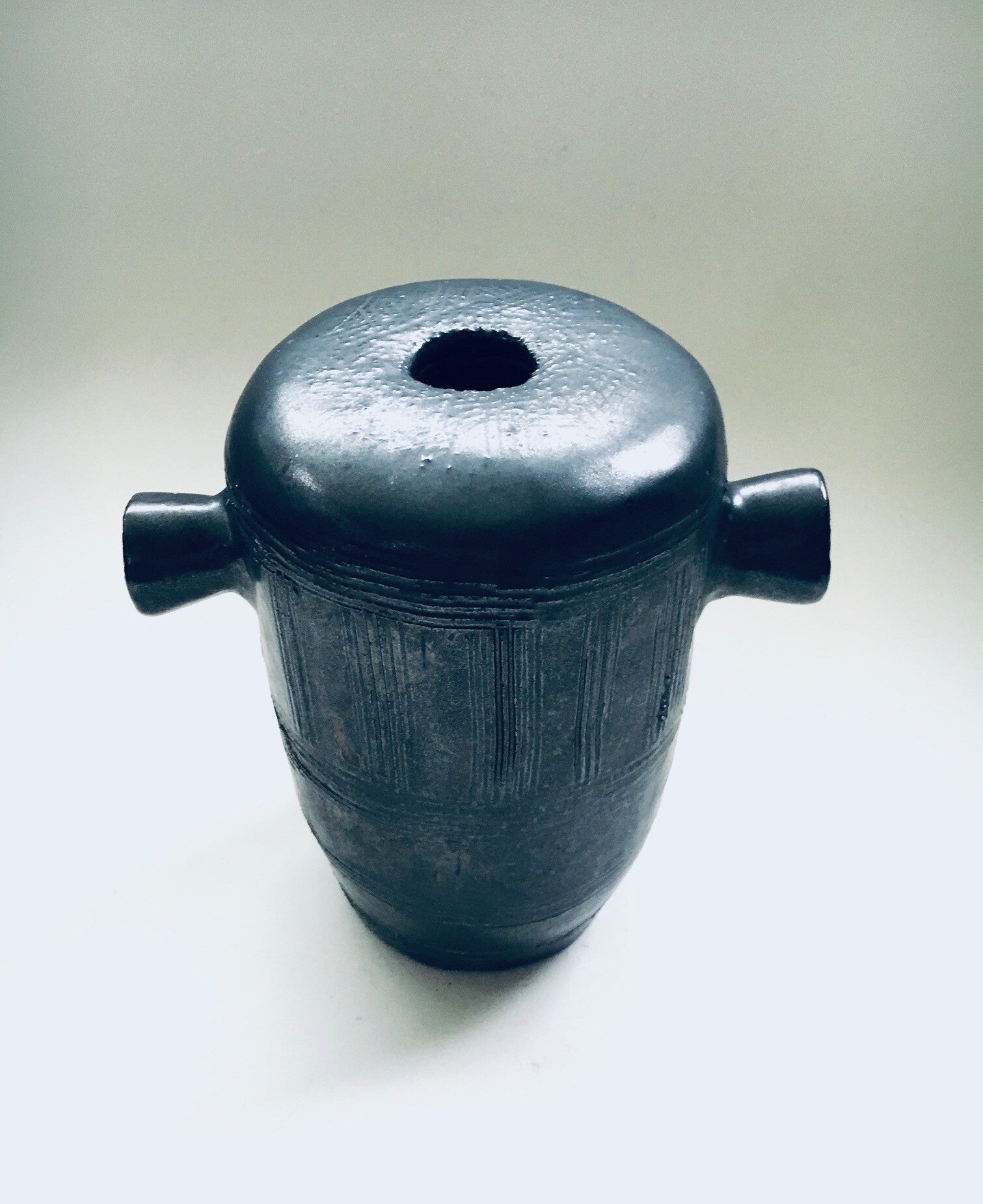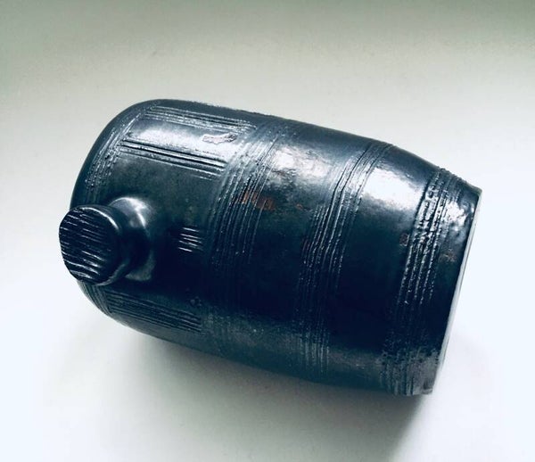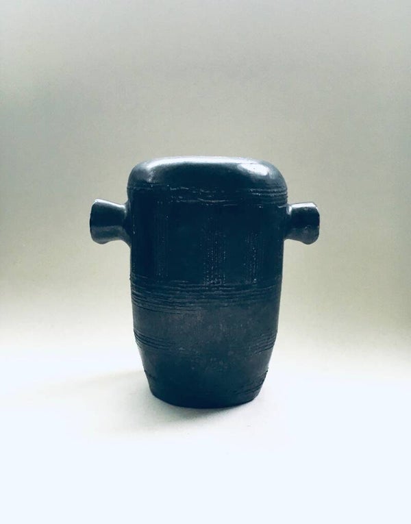Vintage Art Studio Pottery Double Handle Vase signed LK, made in Belgium 1970's. Handmade one of a kind ceramic vase in black matt satin glazes with geometric motif pattern. In very good condition. Signed at the bottom. Measures 13cm x 18,5cm x 18cm.