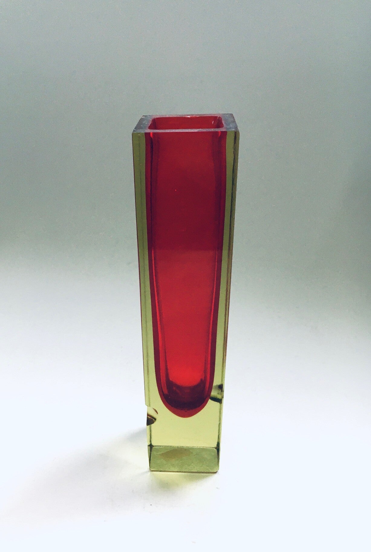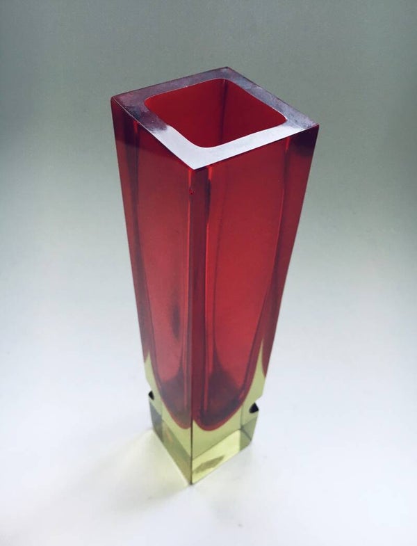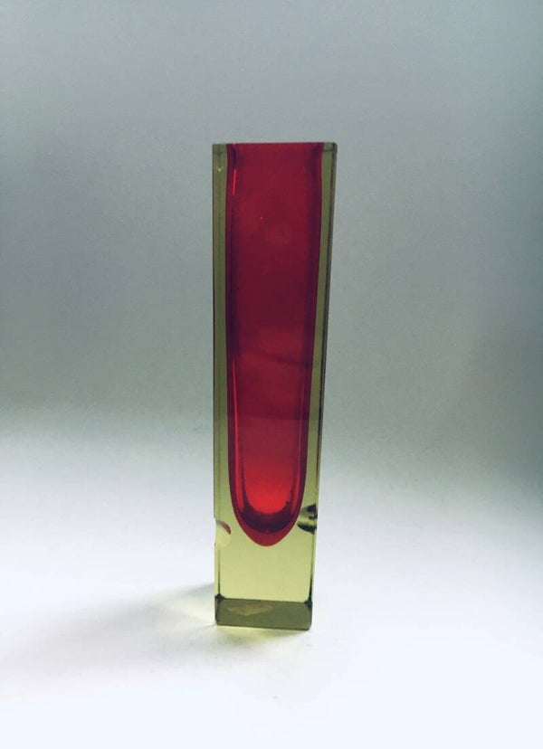 Vintage Midcentury Modern Italian Design Sommerso Glass Vase, made in Italy, Murano, 1960's. Red in yellow clear glass with 2 half round cutouts on the bottom part, which makes this rather rare. In very good condition. Measures 22,5cm x 5cm x 5cm.
