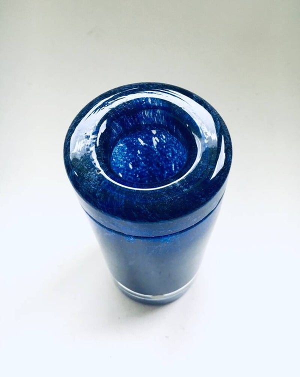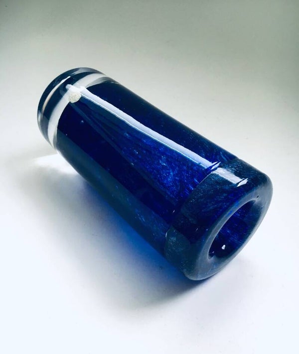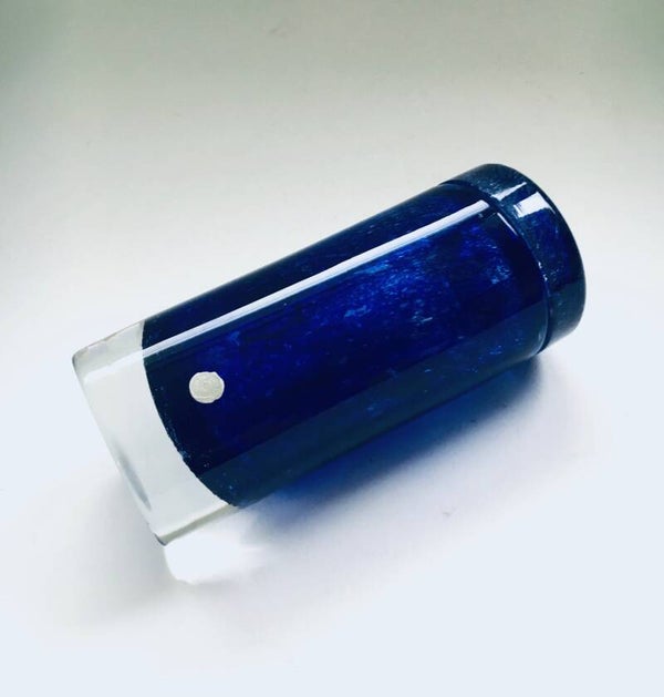 Vintage Midcentury Modern Scandinavian Design Art Glass Vase, Made in Sweden, 1960's. Heavy handblown glass vase in clear glass with blue speckled inside. With original Made in Sweden sticker. In very good condition. Measures 17,5cm x 7,5cm x 7,5cm.