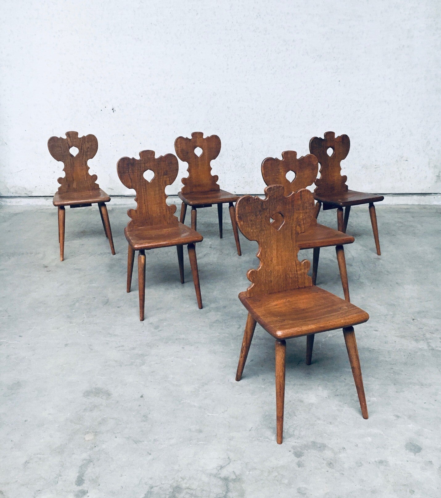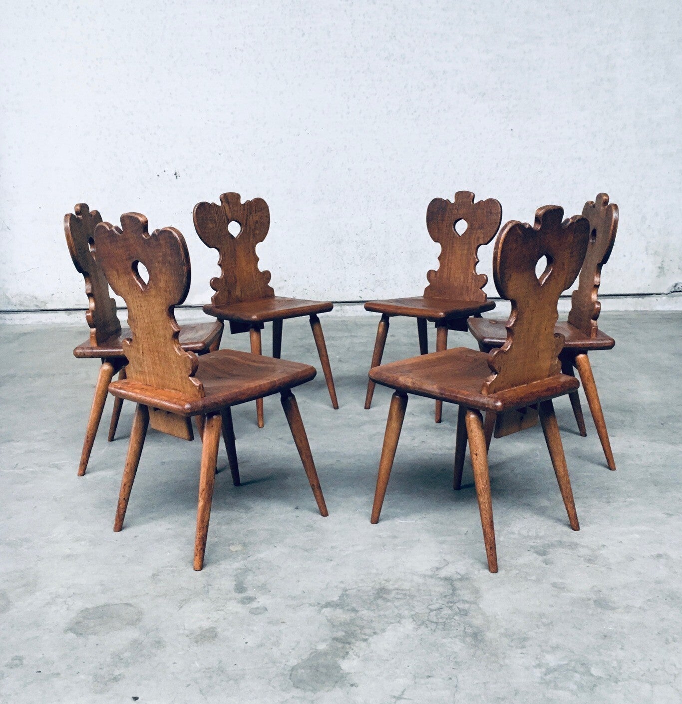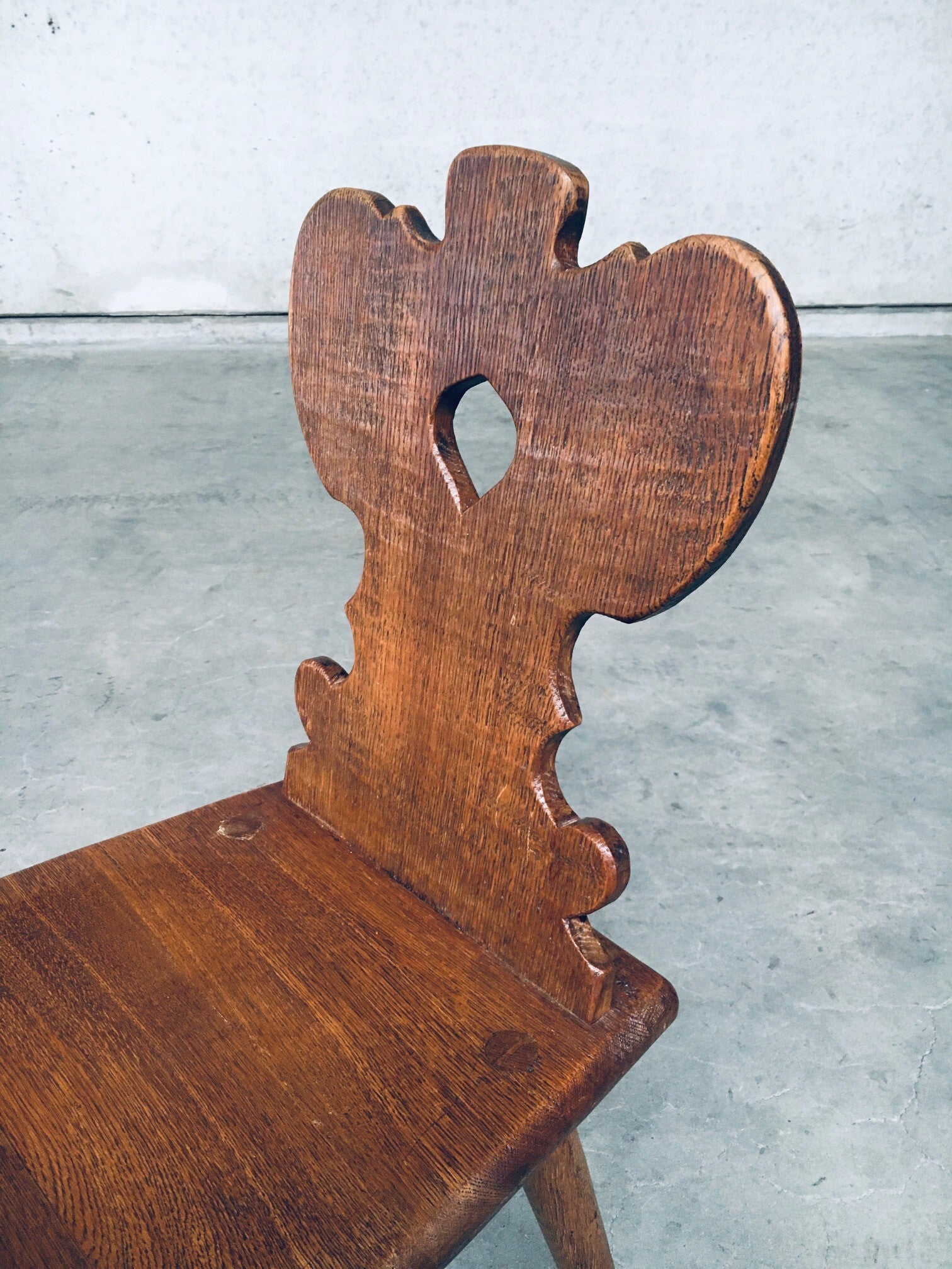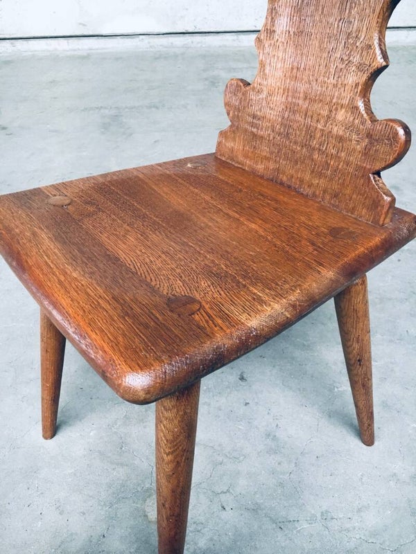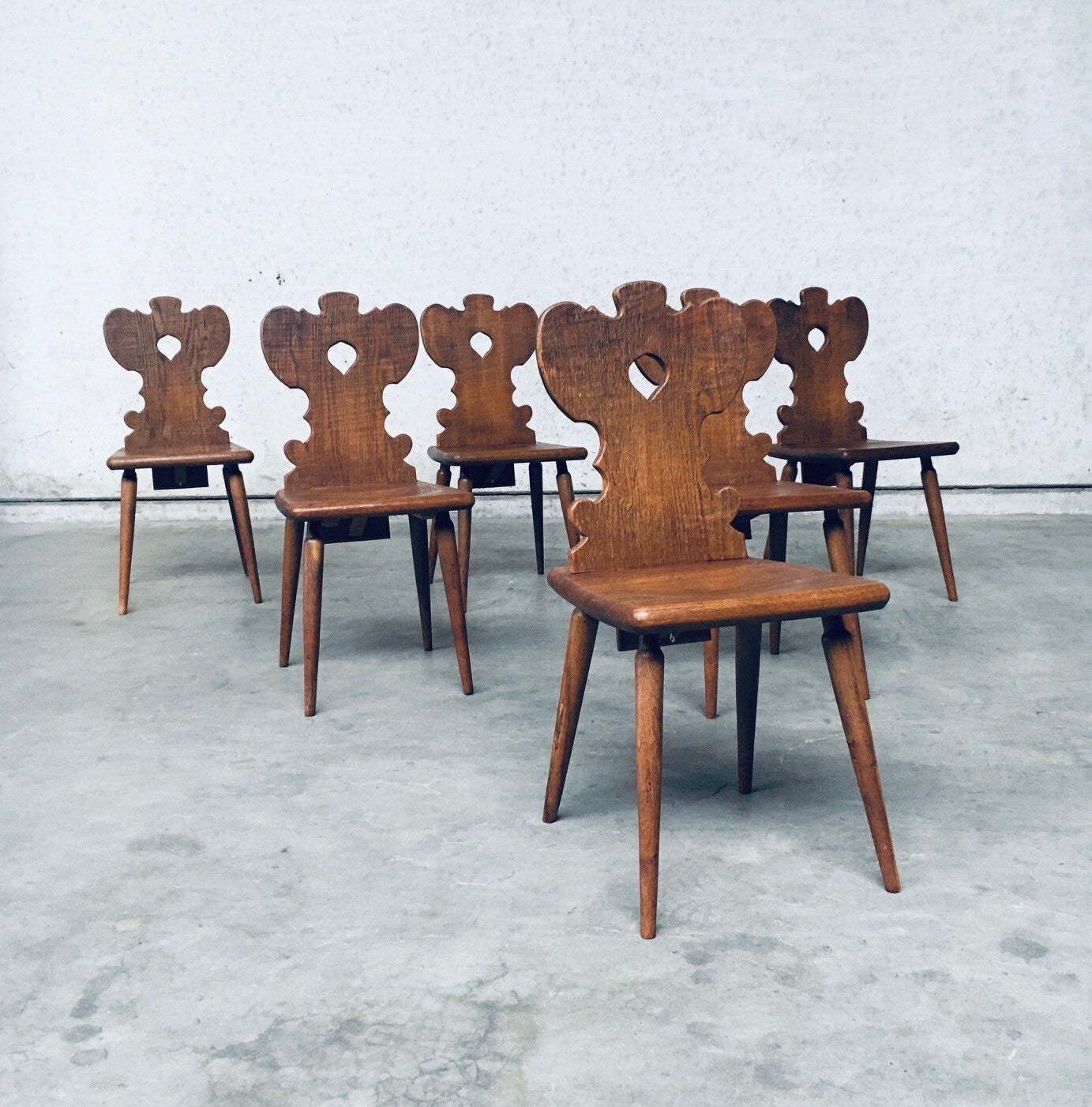 Vintage Midcentury Rustic Brutalist Design Handcrafted Deer Back Dining Chair set of 6, made in Belgium 1940's. Solid oak wooden constructed chairs with Deer Head shaped back. All chairs are in very good condition. Each chair measures 41cm x 89,5cm x 47cm.