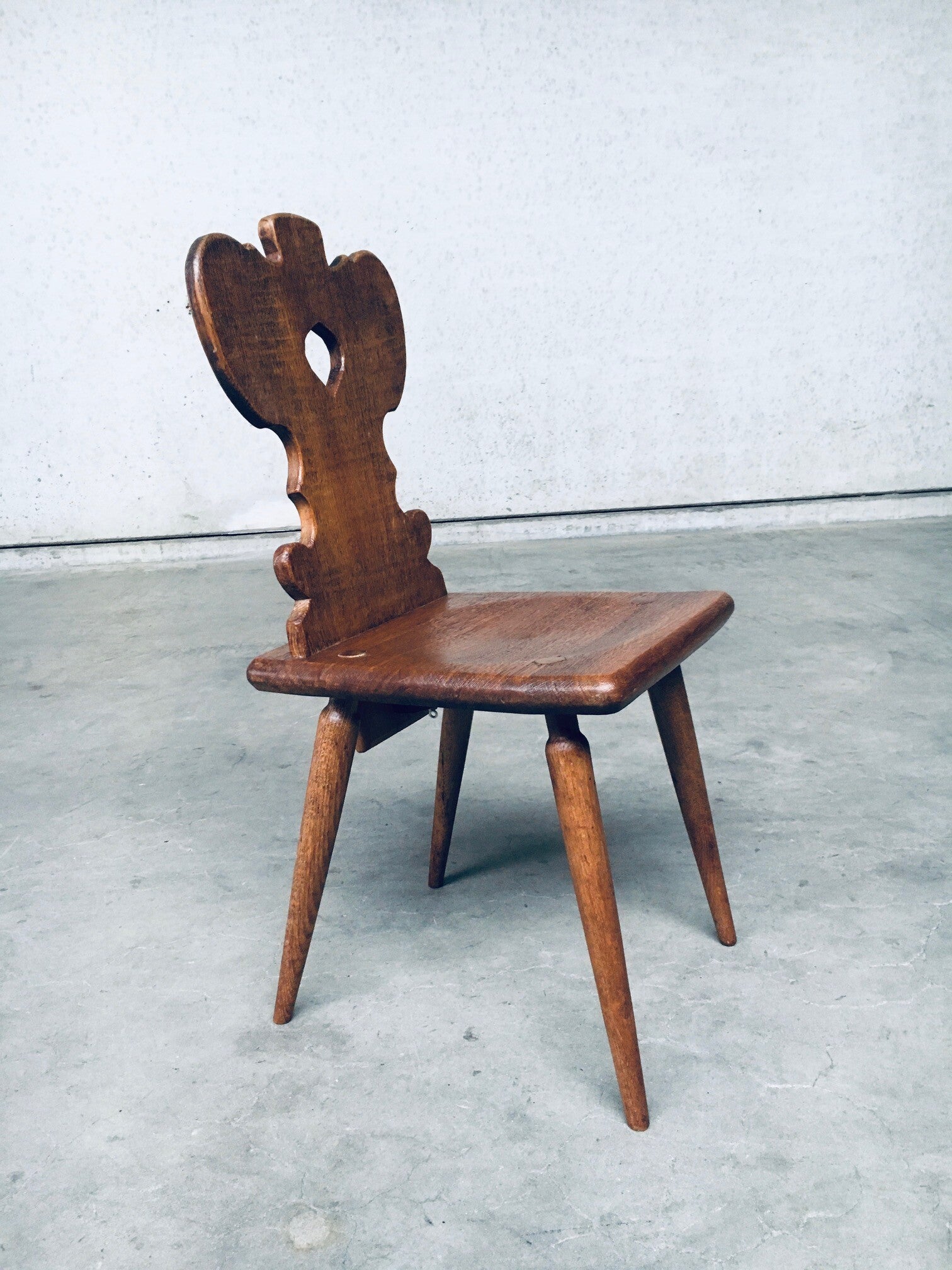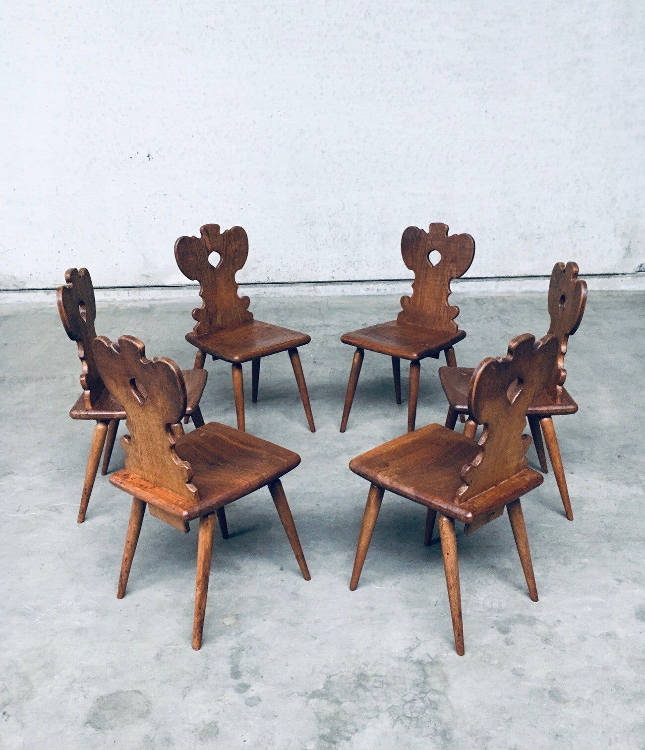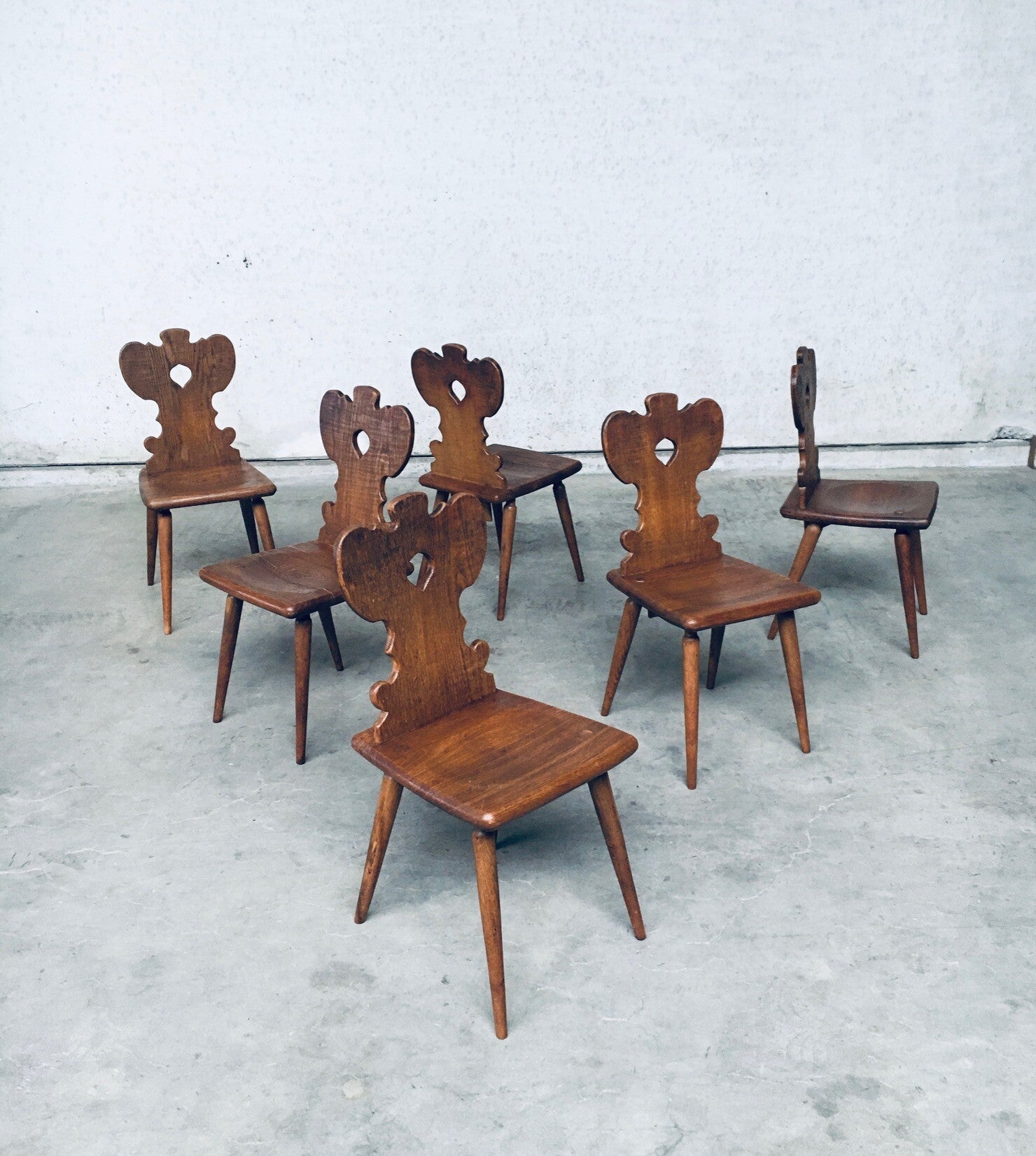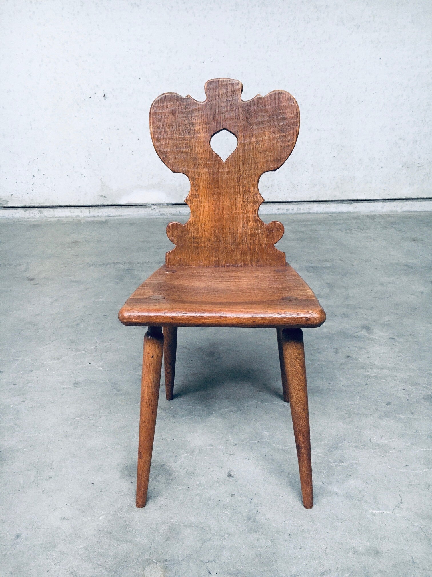Vintage Midcentury Rustic Brutalist Design Handcrafted Deer Back Dining Chair set of 6, made in Belgium 1940's. Solid oak wooden constructed chairs with Deer Head shaped back. All chairs are in very good condition. Each chair measures 41cm x 89,5cm x 47cm.