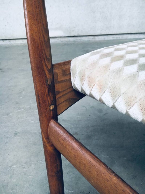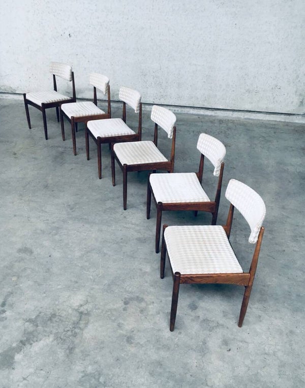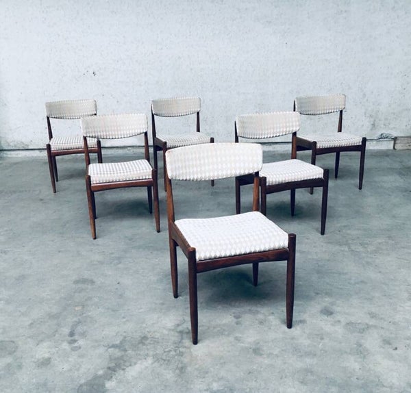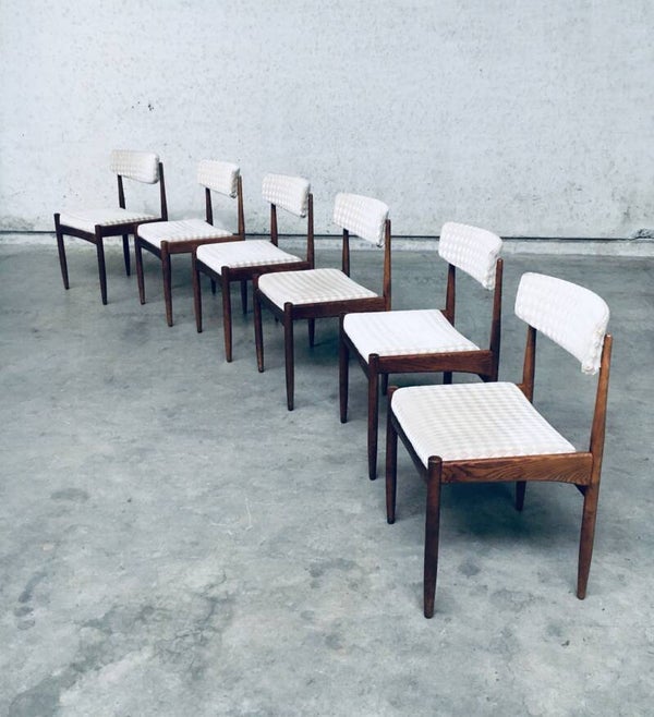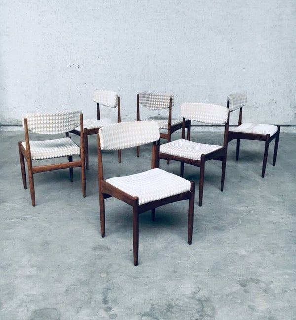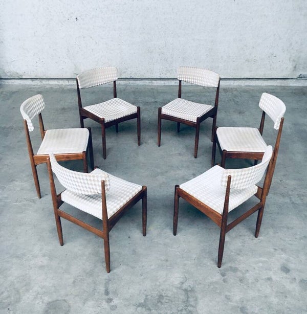 Vintage Midcentury Modern Scandinavian Design Teak Dining Chair set of 6, made in Denmark, 1960's. Teak wood construction frame with checkered beige fabric seats and back. All chairs are in very good original condition. Each chair measures 48cm x 78cm x 50cm.