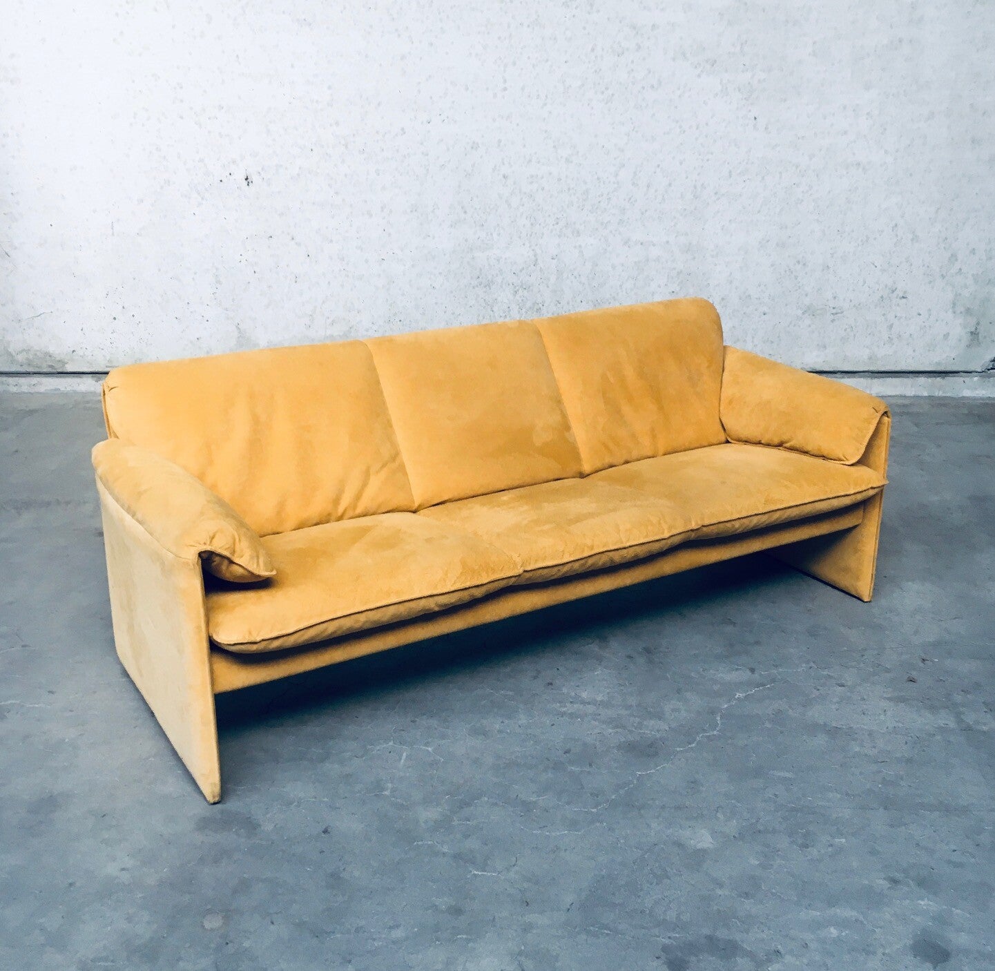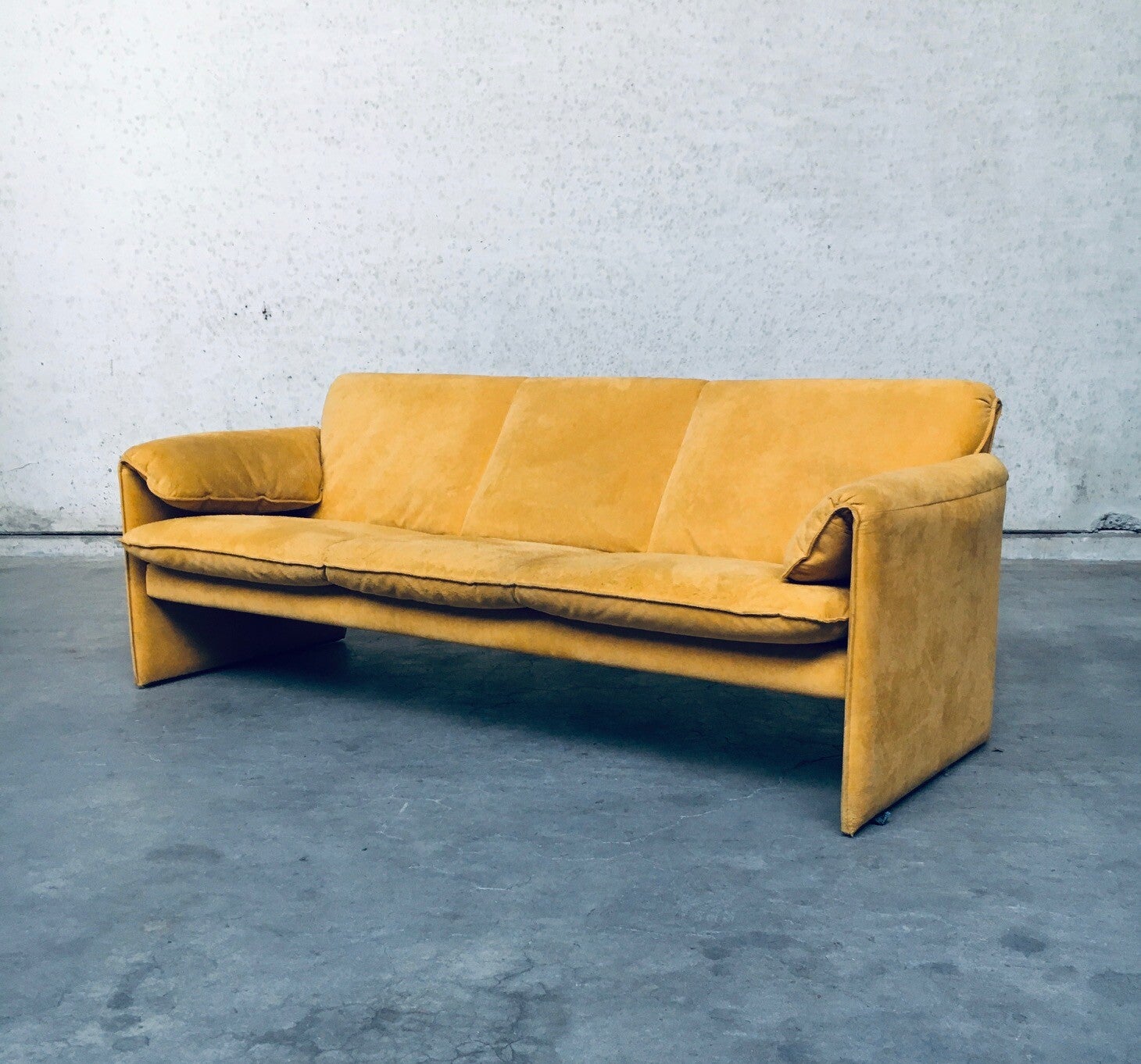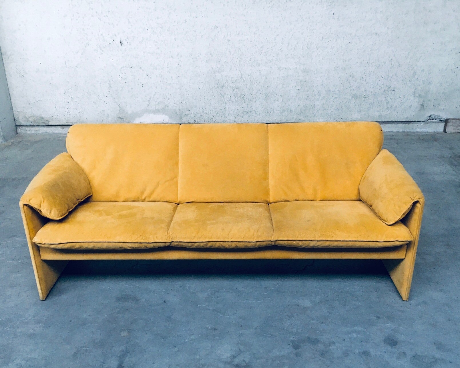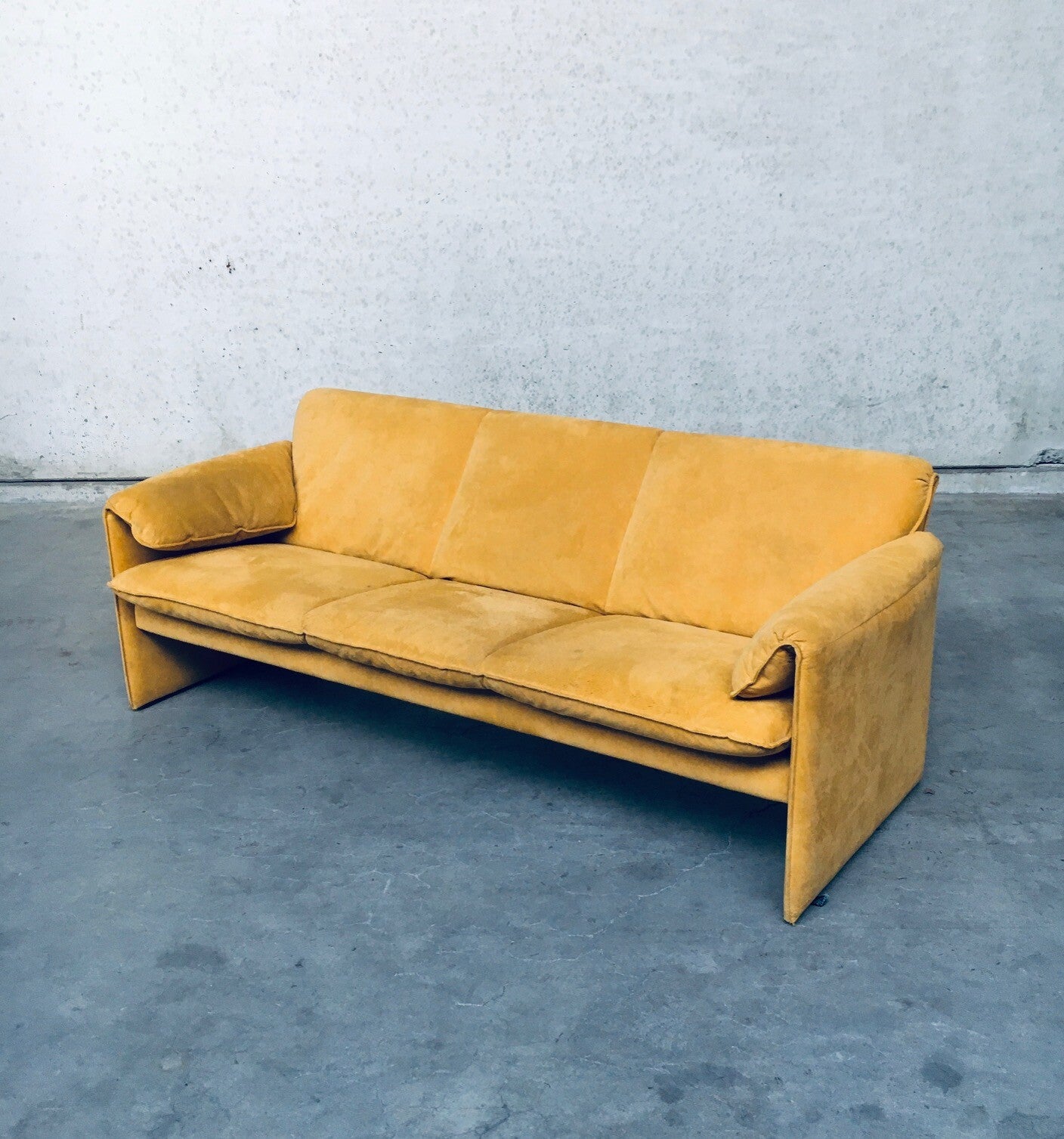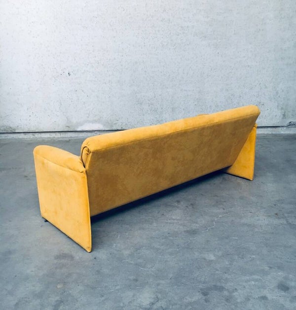Vintage Postmodern Design BORA BORA 3 seat Sofa by Axel Enthoven for Leolux, Netherlands 1980's. Yellow Alcantara version. Classic Leolux design. The sofa has some dirt spots and looks well used on the seats and armrests. Alcantara needs some shaving and cleaning. Otherwise in good condition. Measures 77cm x 200cm x 84cm.