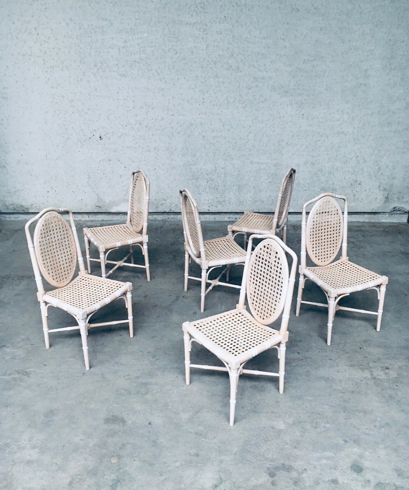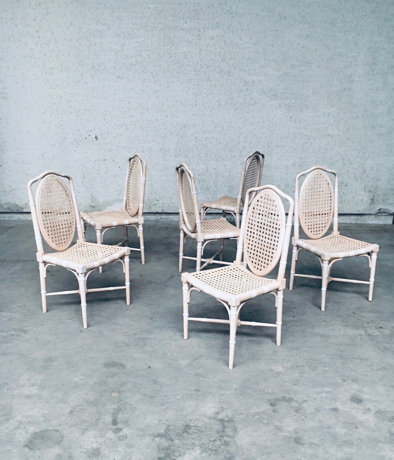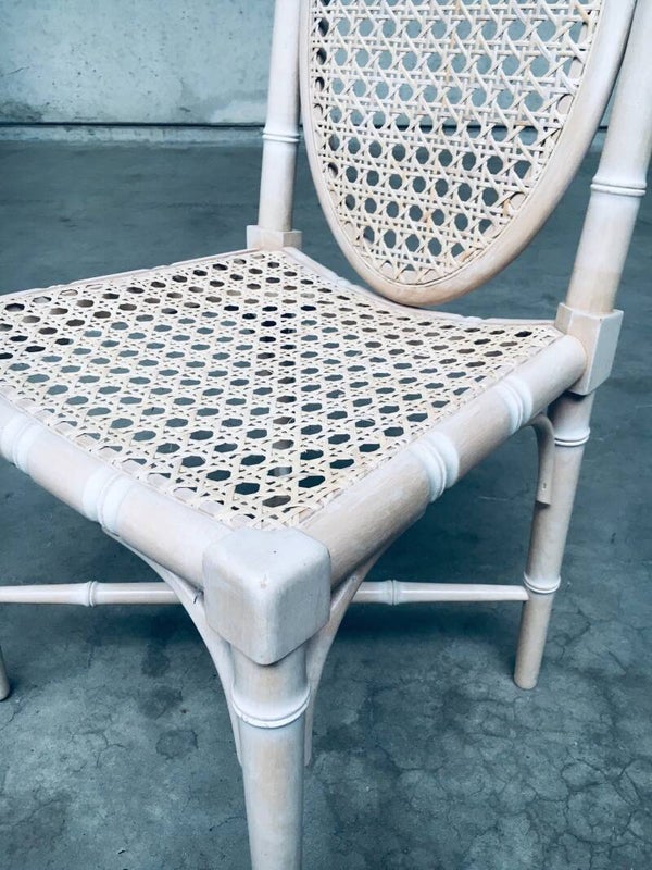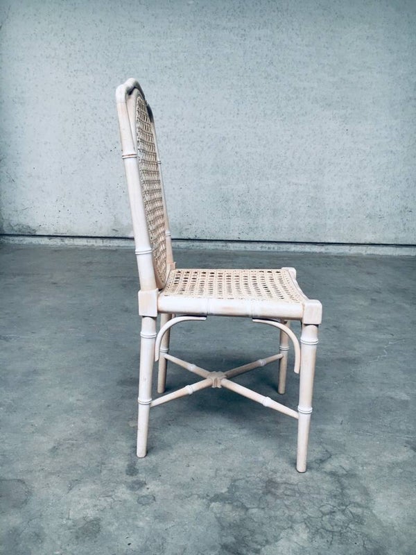 Vintage Chippendale Style Design set of 6 Faux Bamboo Dining Chairs. Made in the 1990's. Light white beige stained wood construction with webbing seat and back. All chairs are in good condition with patina from their age. Each chair measures 49cm x 97cm x 45cm.